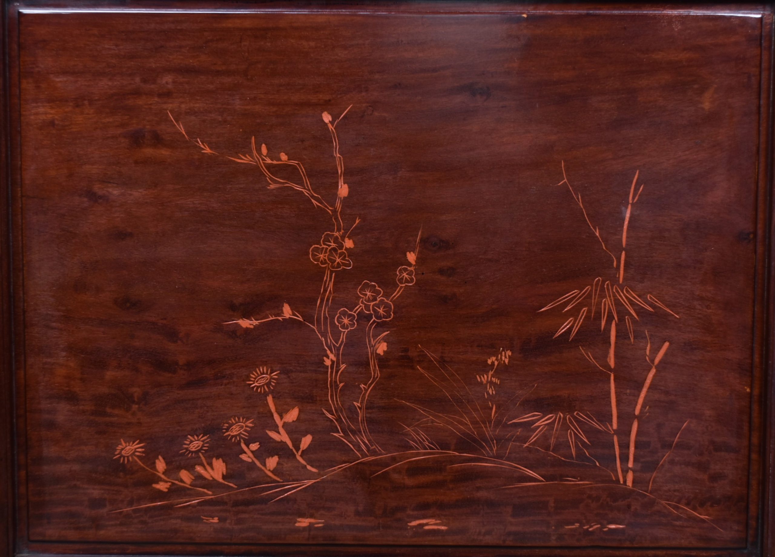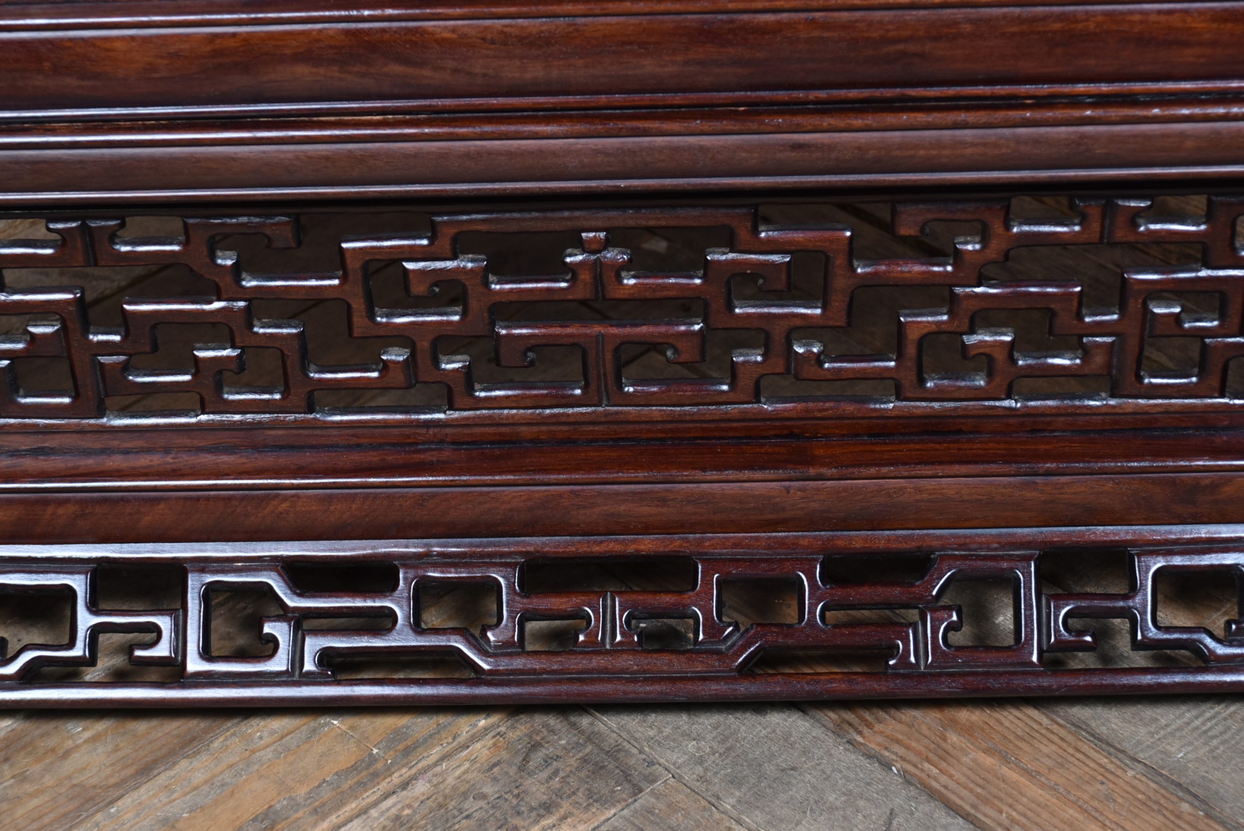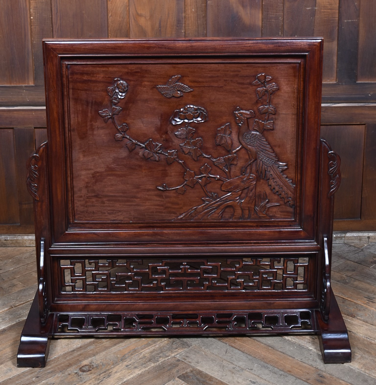 An elegant Chinese hardwood screen, finely carved and rich in patina, reflecting exceptional craftsmanship and traditional artistry. The central panel depicts a serene scene of birds among flowering branches—one captured mid-flight—symbolising harmony and natural beauty. The frame is adorned with geometric fretwork and stylised corner spandrels, adding architectural balance to the organic composition. Crafted from a dense, dark hardwood, the screen radiates warmth and refinement. A striking decorative piece, it embodies the symbolism and sophistication of classical Chinese design. Minor age-related imperfections are present, enhancing its authenticity and storied character.