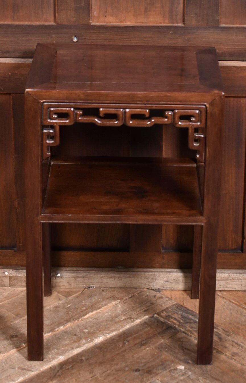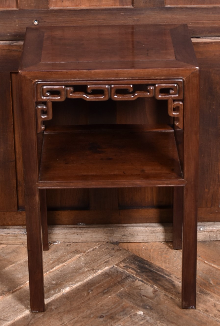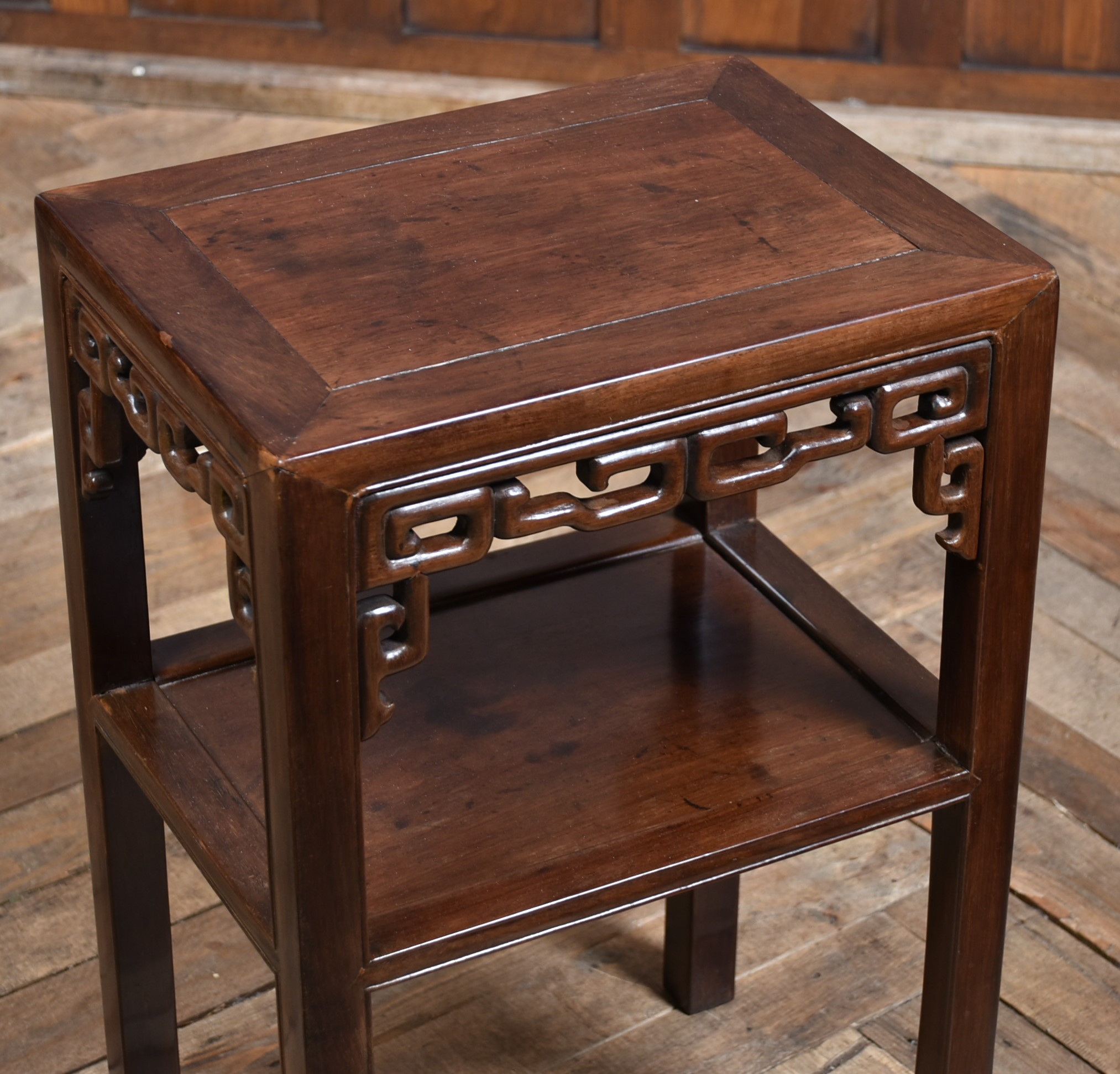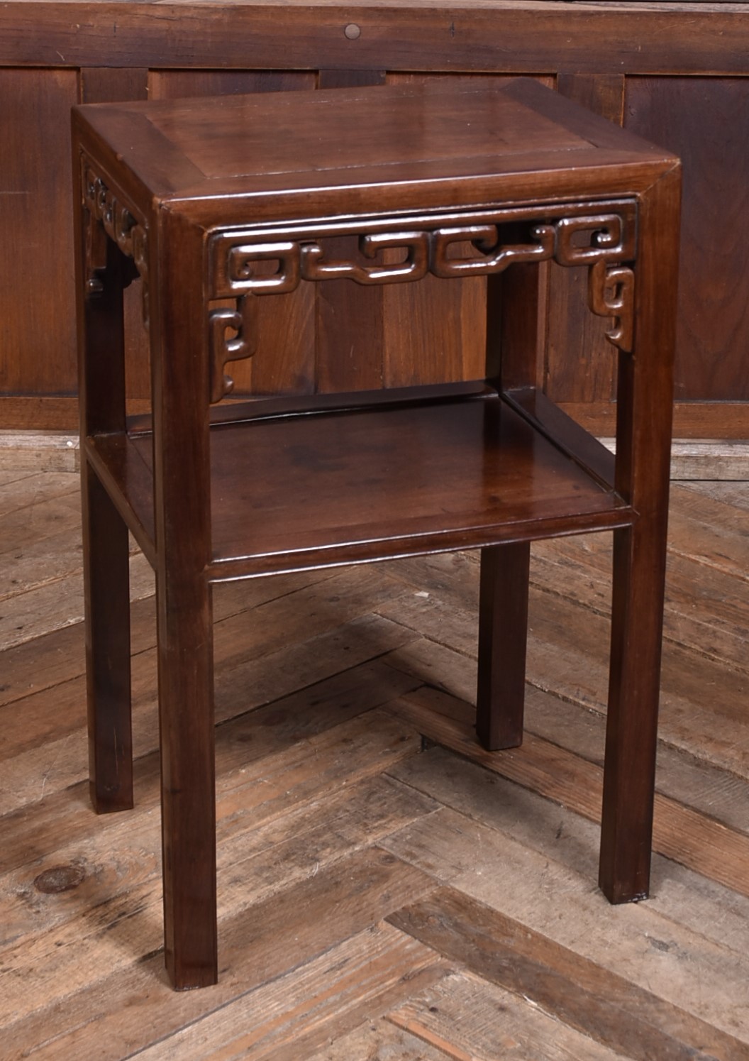 A Chinese hardwood side table in excellent condition. The rectangular top sits above a pierced apron carved with a repeating geometric motif, supported by four straight legs joined by a lower shelf. With its dark polished finish and restrained proportions, this piece offers both decorative appeal and practical versatility ideal as a lamp table or occasional stand.