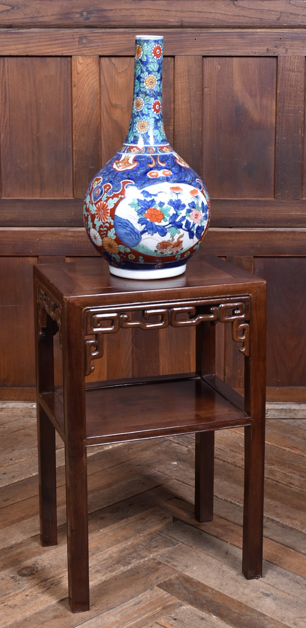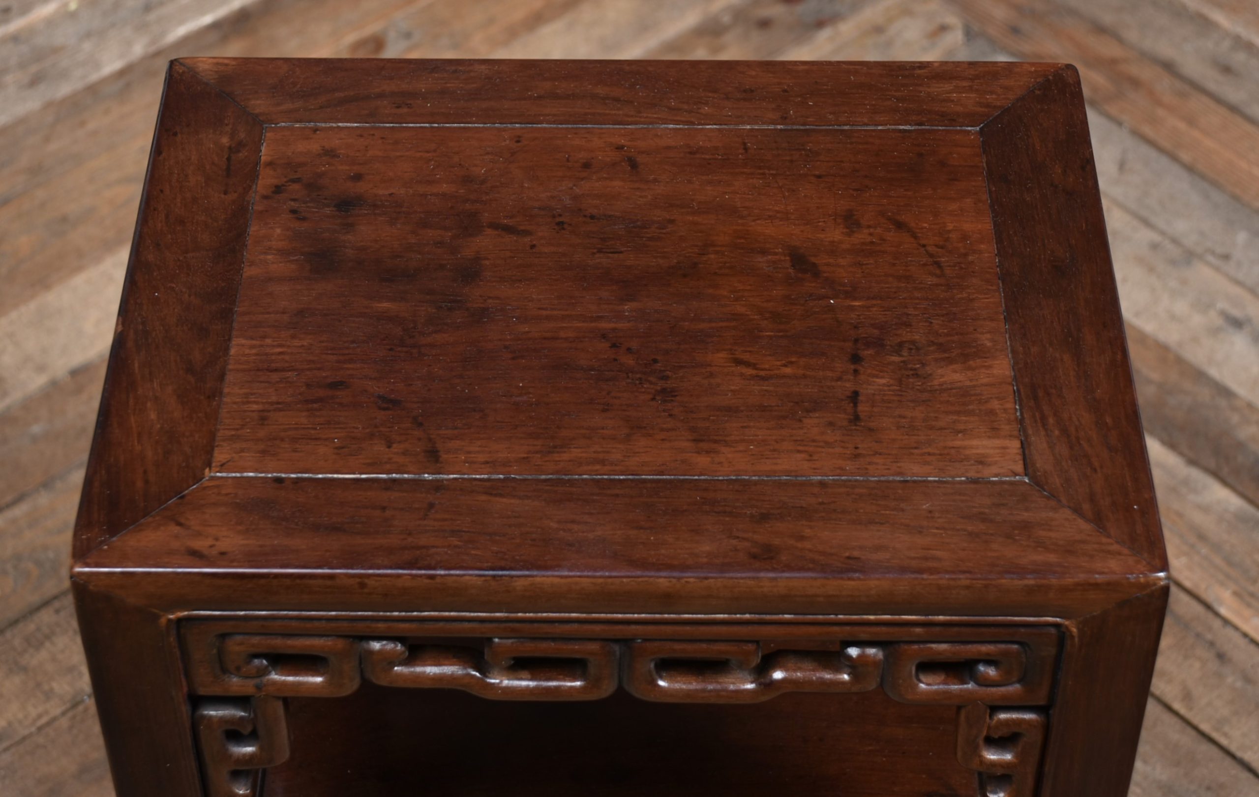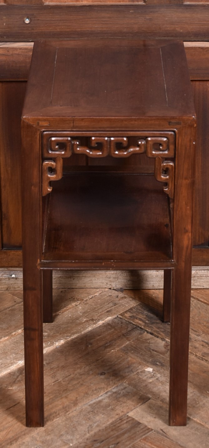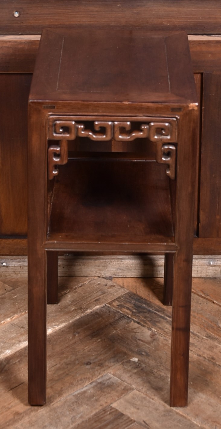 A Chinese hardwood side table in excellent condition. The rectangular top sits above a pierced apron carved with a repeating geometric motif, supported by four straight legs joined by a lower shelf. With its dark polished finish and restrained proportions, this piece offers both decorative appeal and practical versatility ideal as a lamp table or occasional stand.