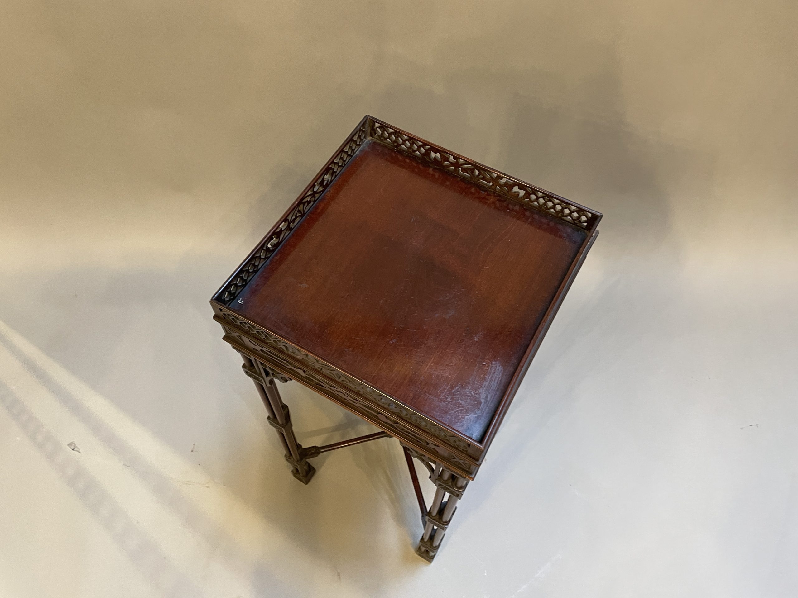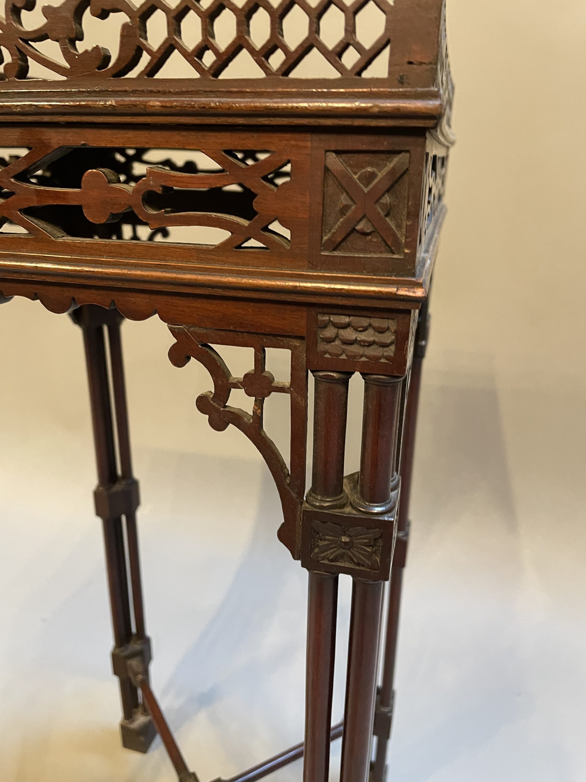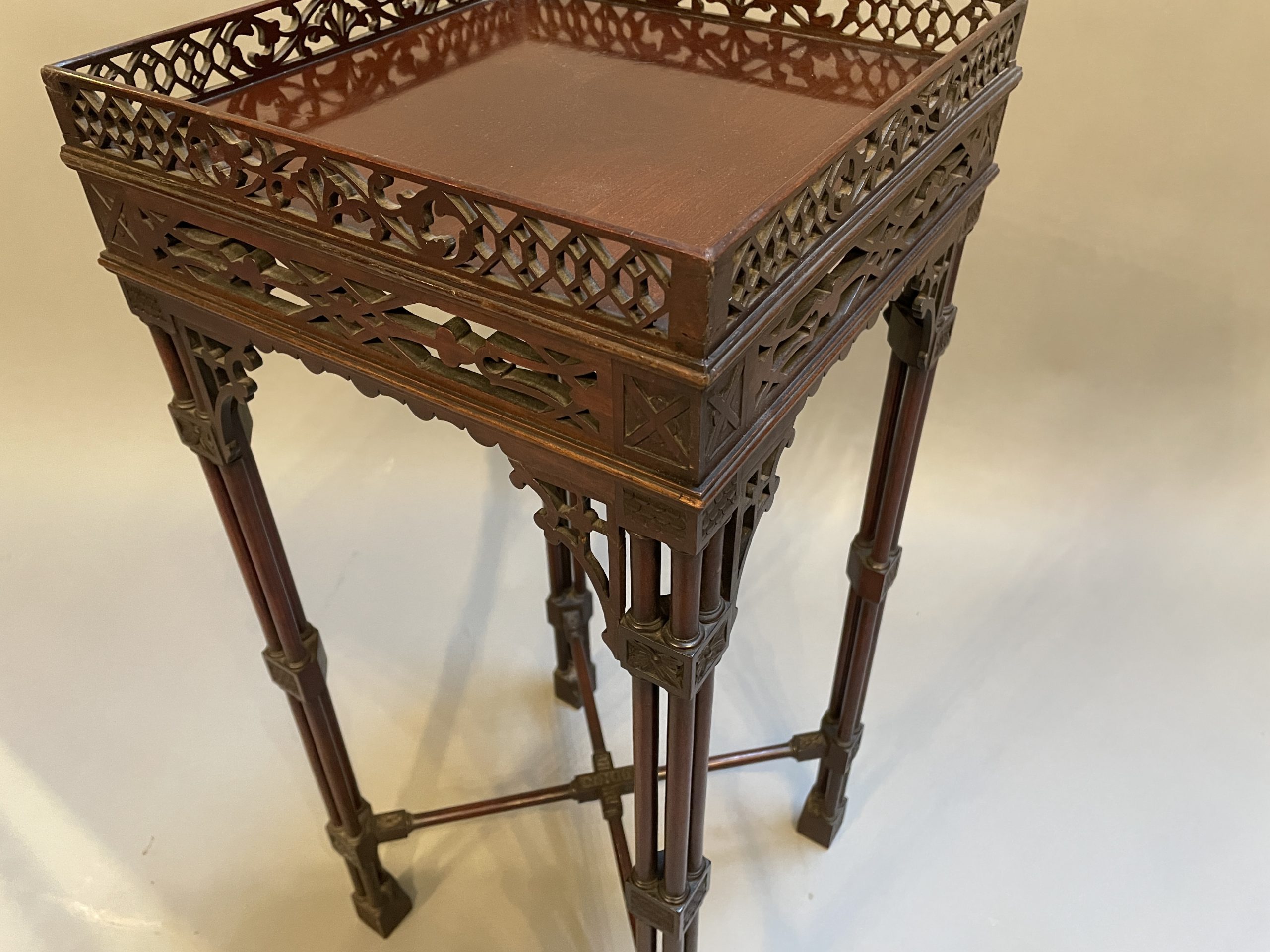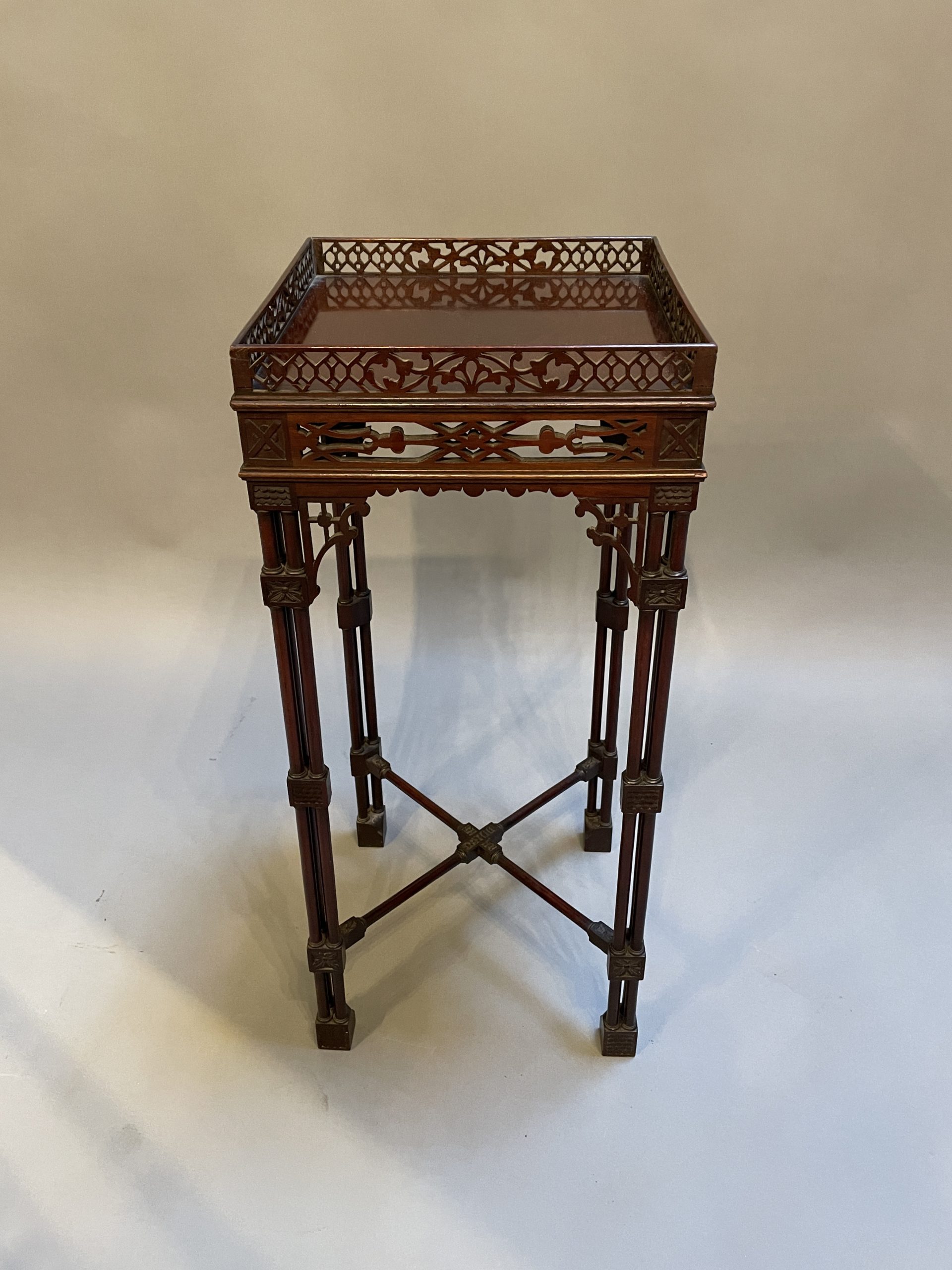 Circa 1900 of the first quality, the fret-cut gallery about a square top and conforming frieze, raised on cluster column supports with carved detail united by stretchers to block feet.