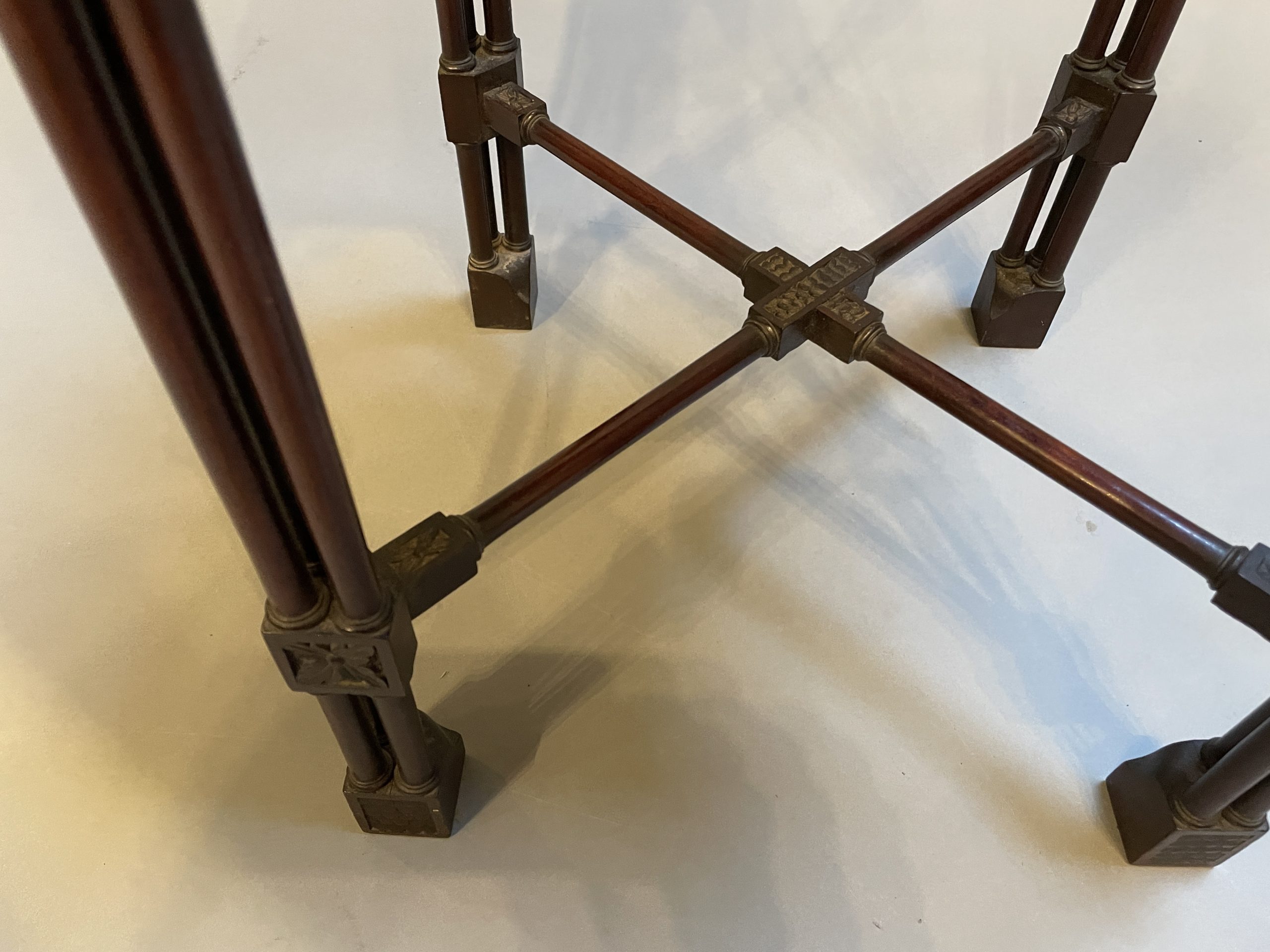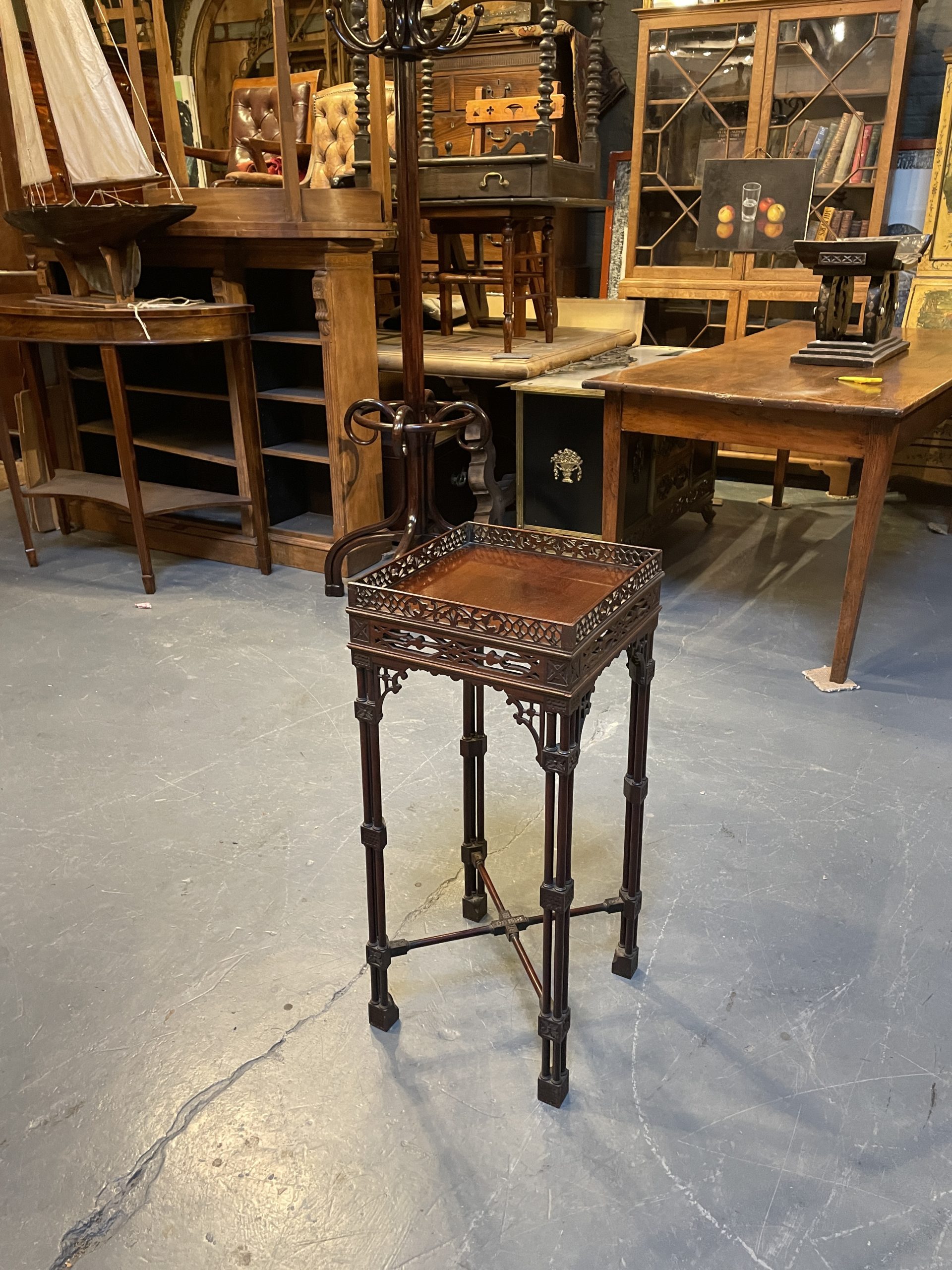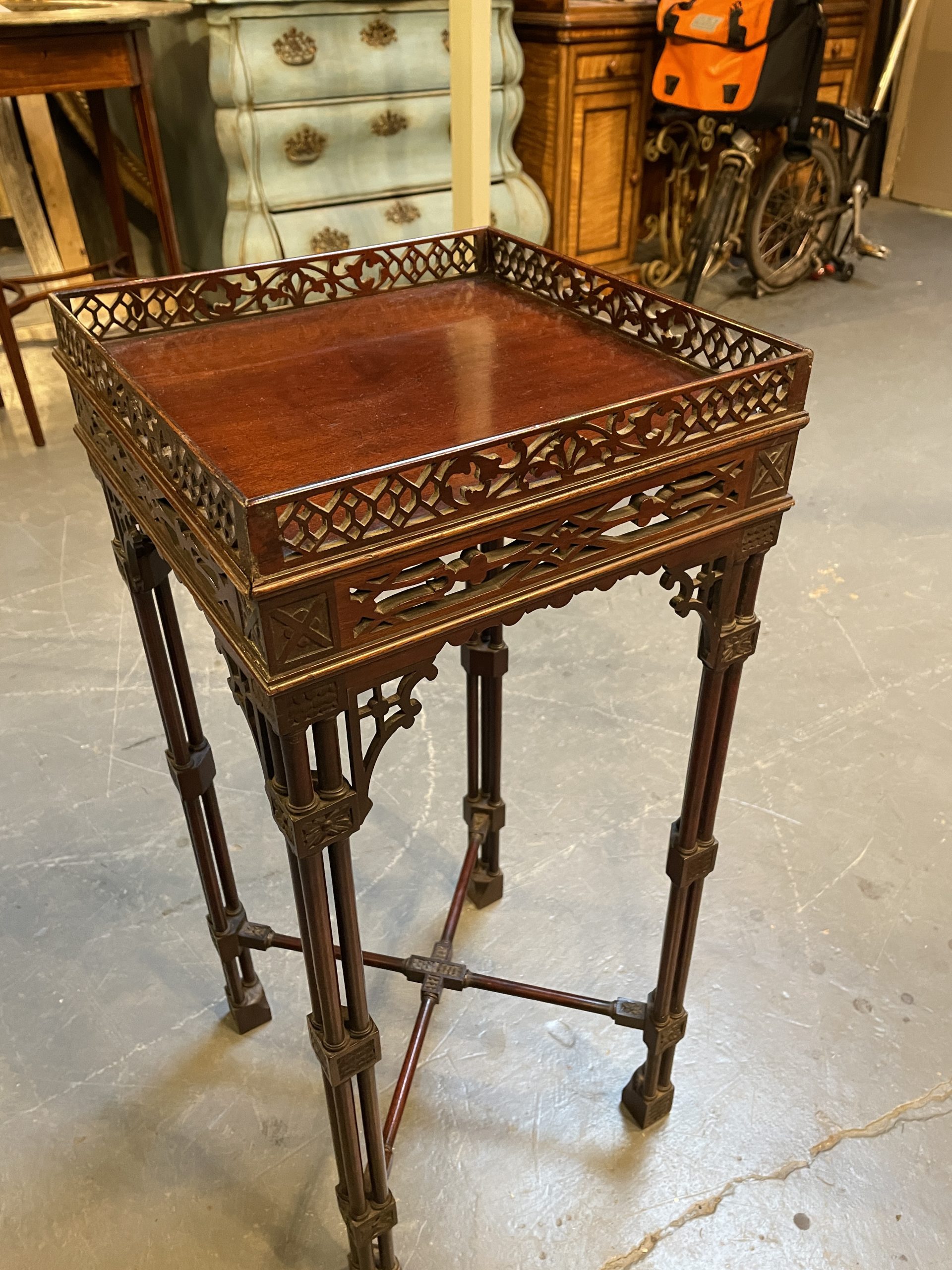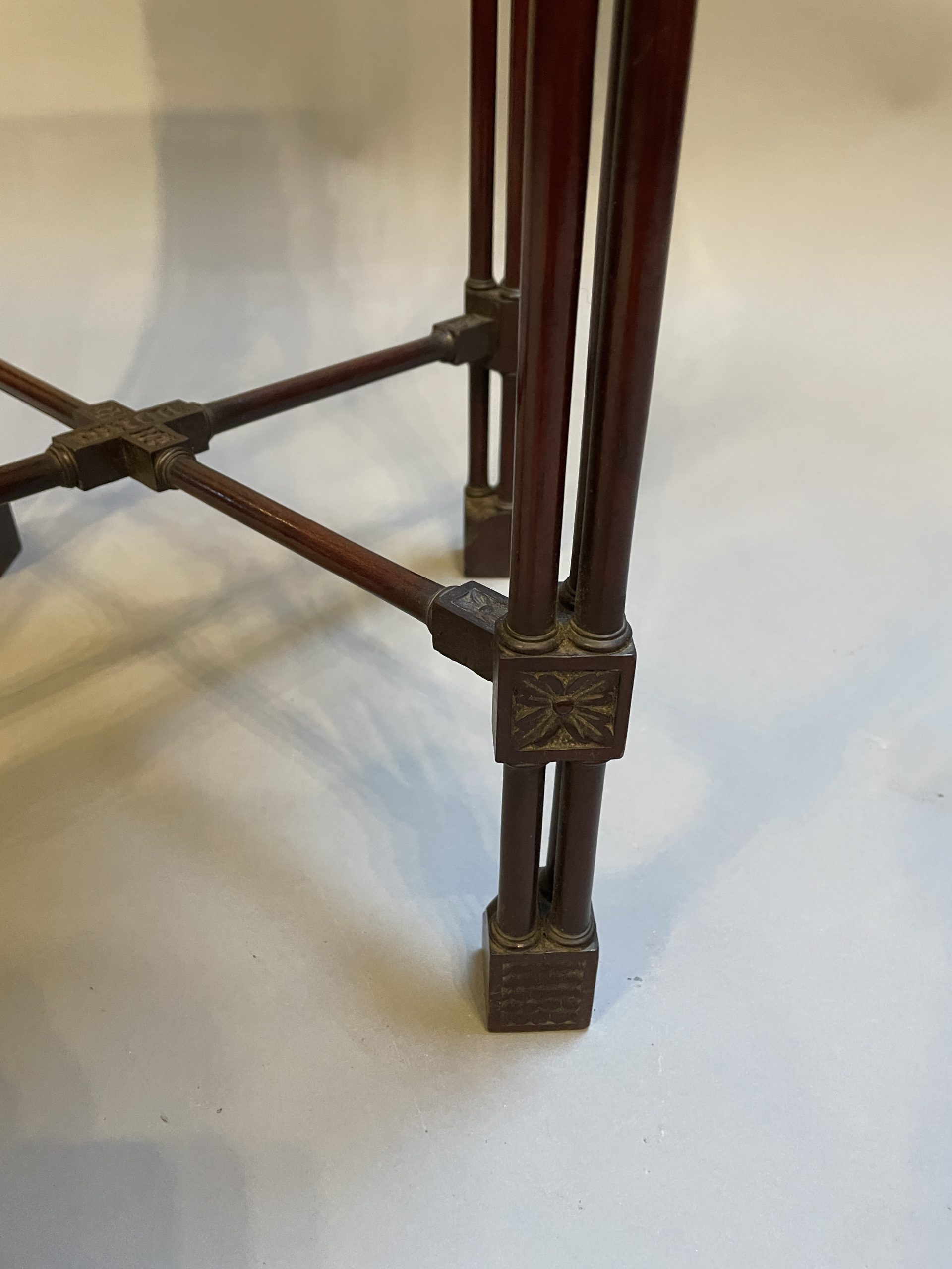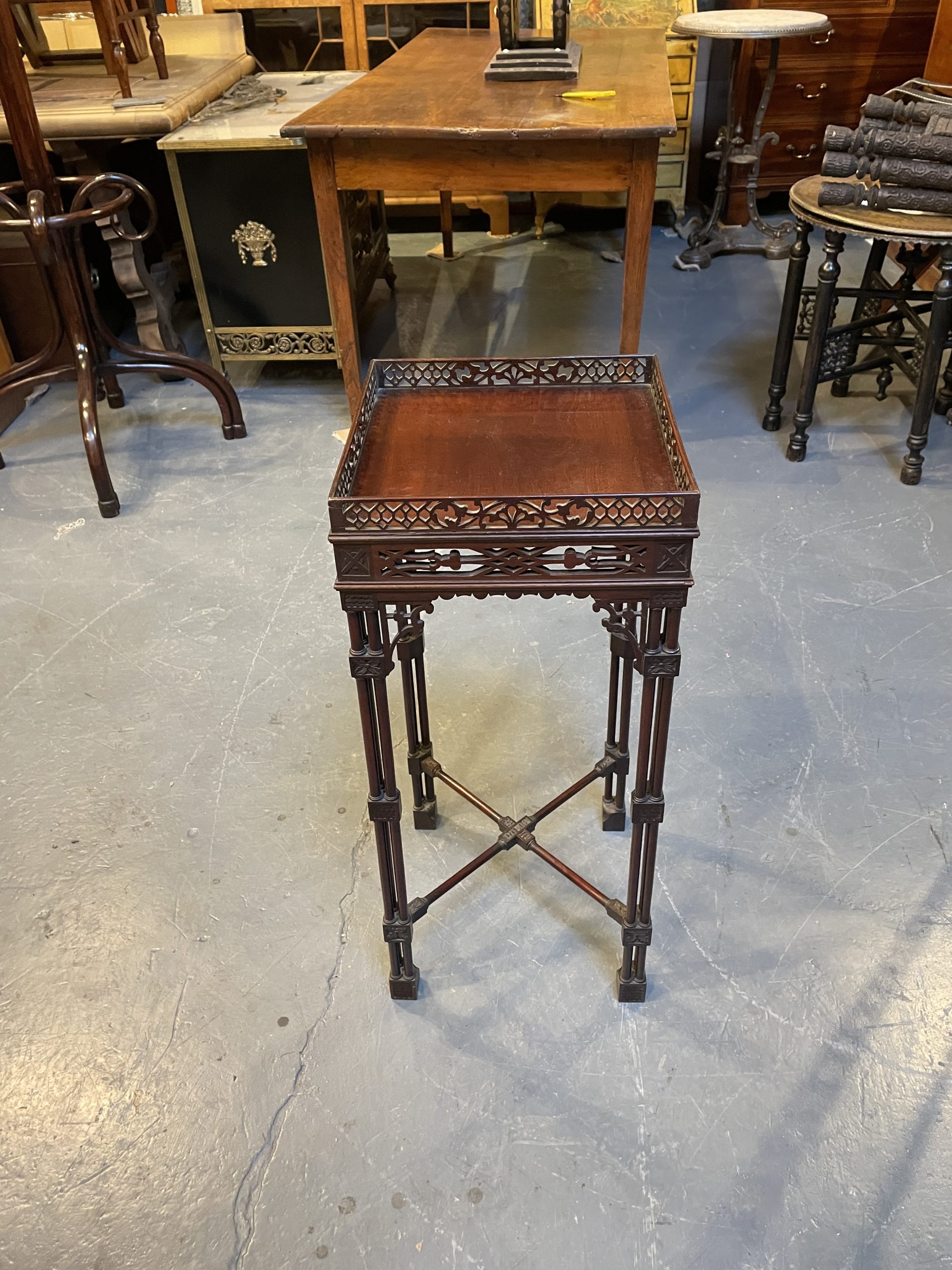 Circa 1900 of the first quality, the fret-cut gallery about a square top and conforming frieze, raised on cluster column supports with carved detail united by stretchers to block feet.