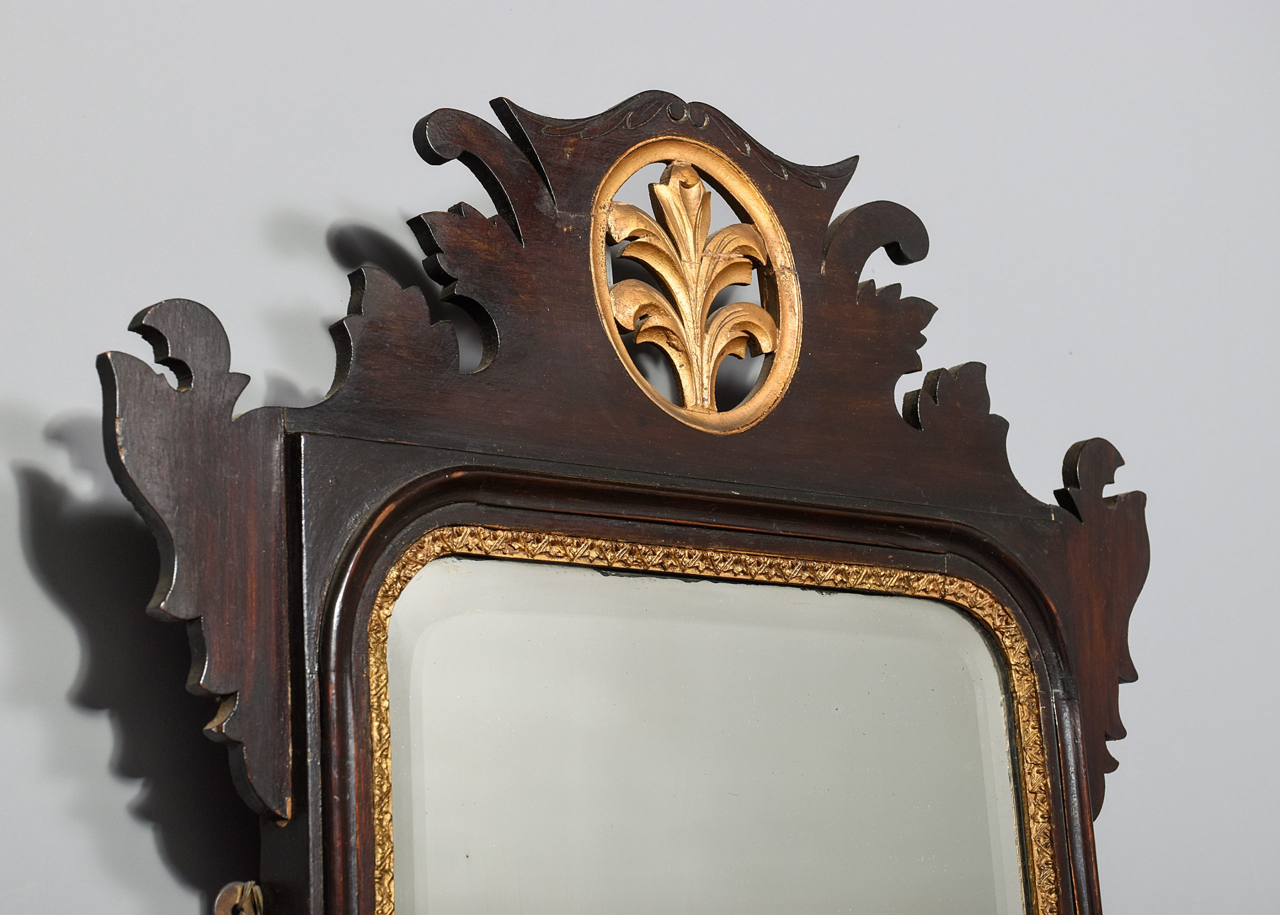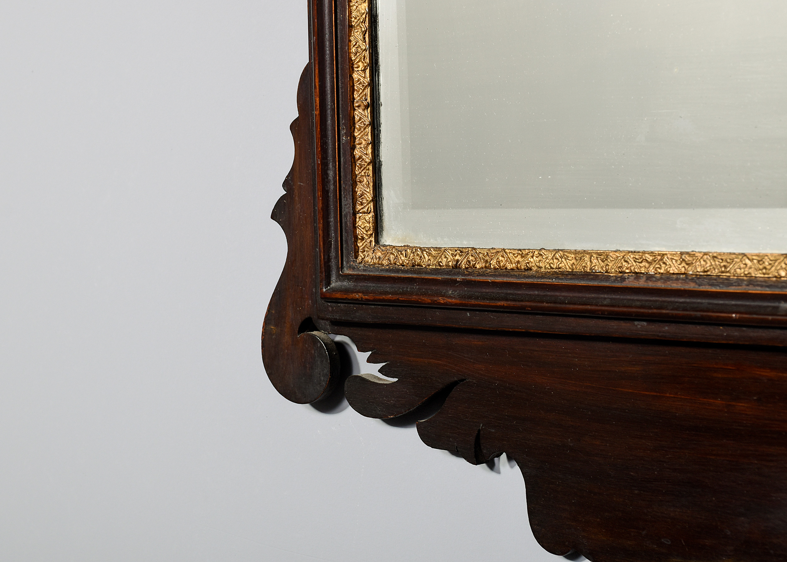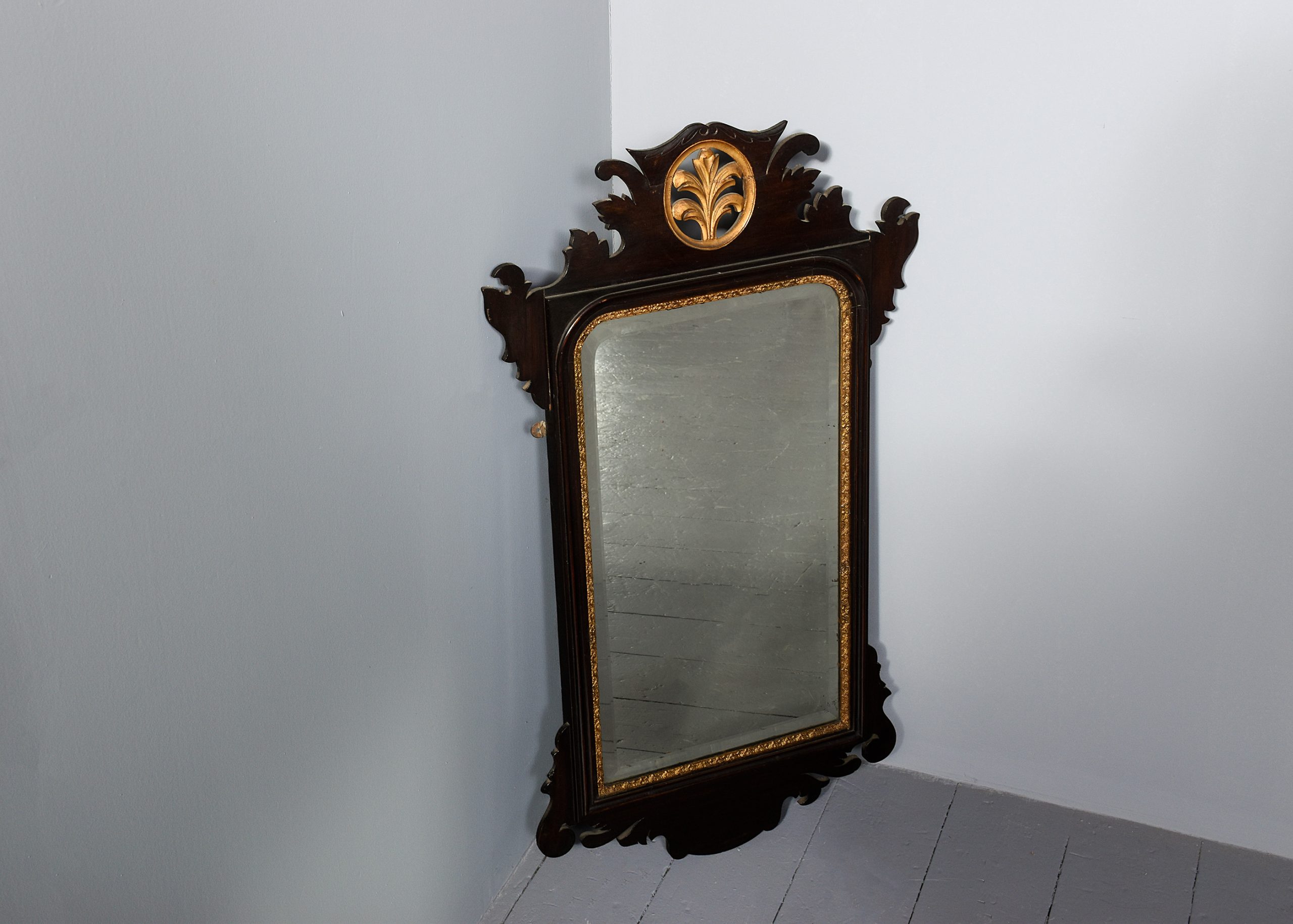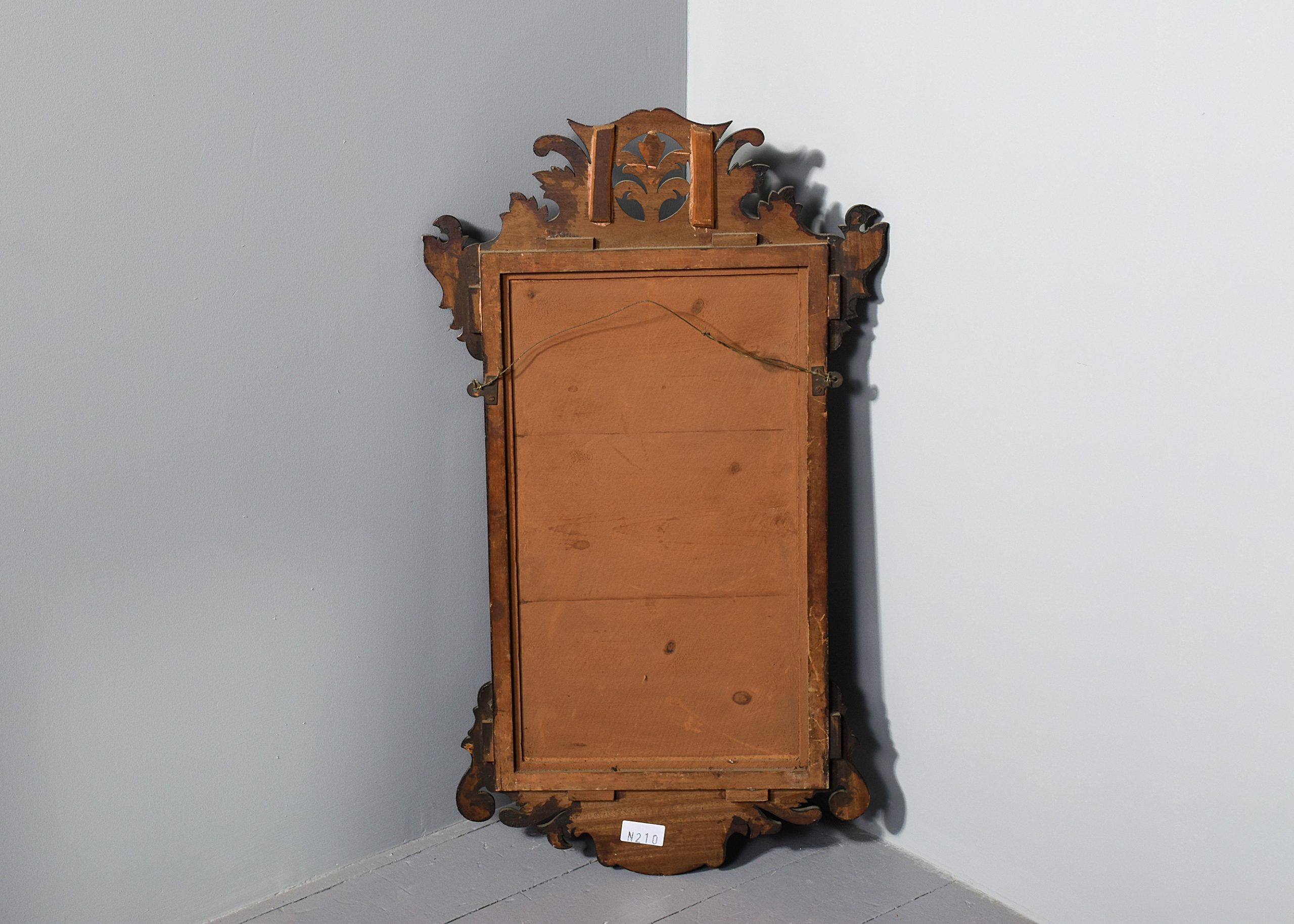 Circa 1900. Chippendale-style carved and gilt mahogany wall mirror. Surmounted by a fretted crest with a central gilded fleur de lis, the mirror sides with fretwork carvings and with a fretwork-shaped base. The original bevelled glass mirror surrounded by a foliate gilded slip in very good condition.