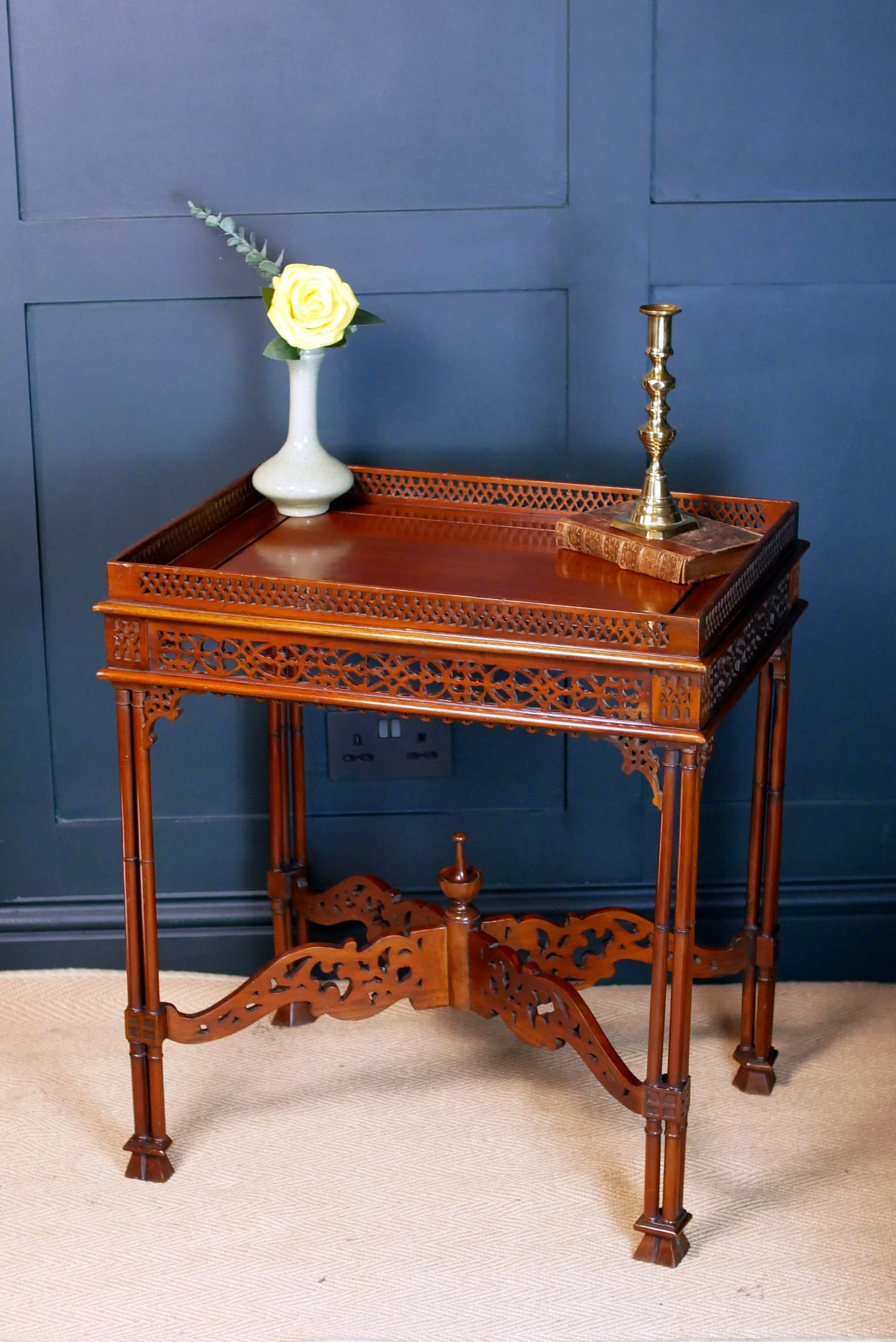 The tray-style top makes this an ideal occasional table for serving tea or displaying treasured objects, while the gallery keeps items safely contained. Pieces of this quality were designed not only for utility but to enhance the elegance of a refined interior.