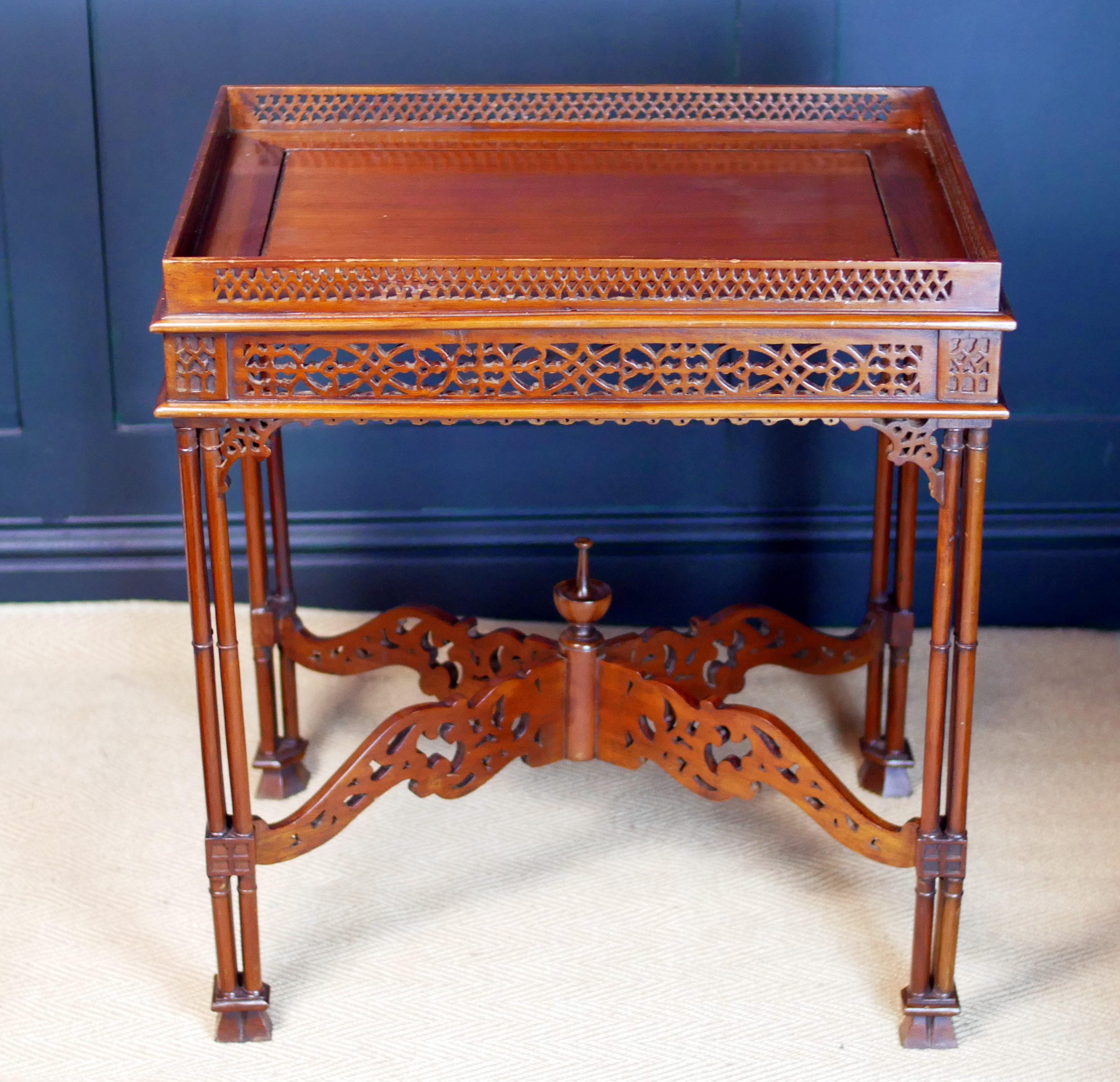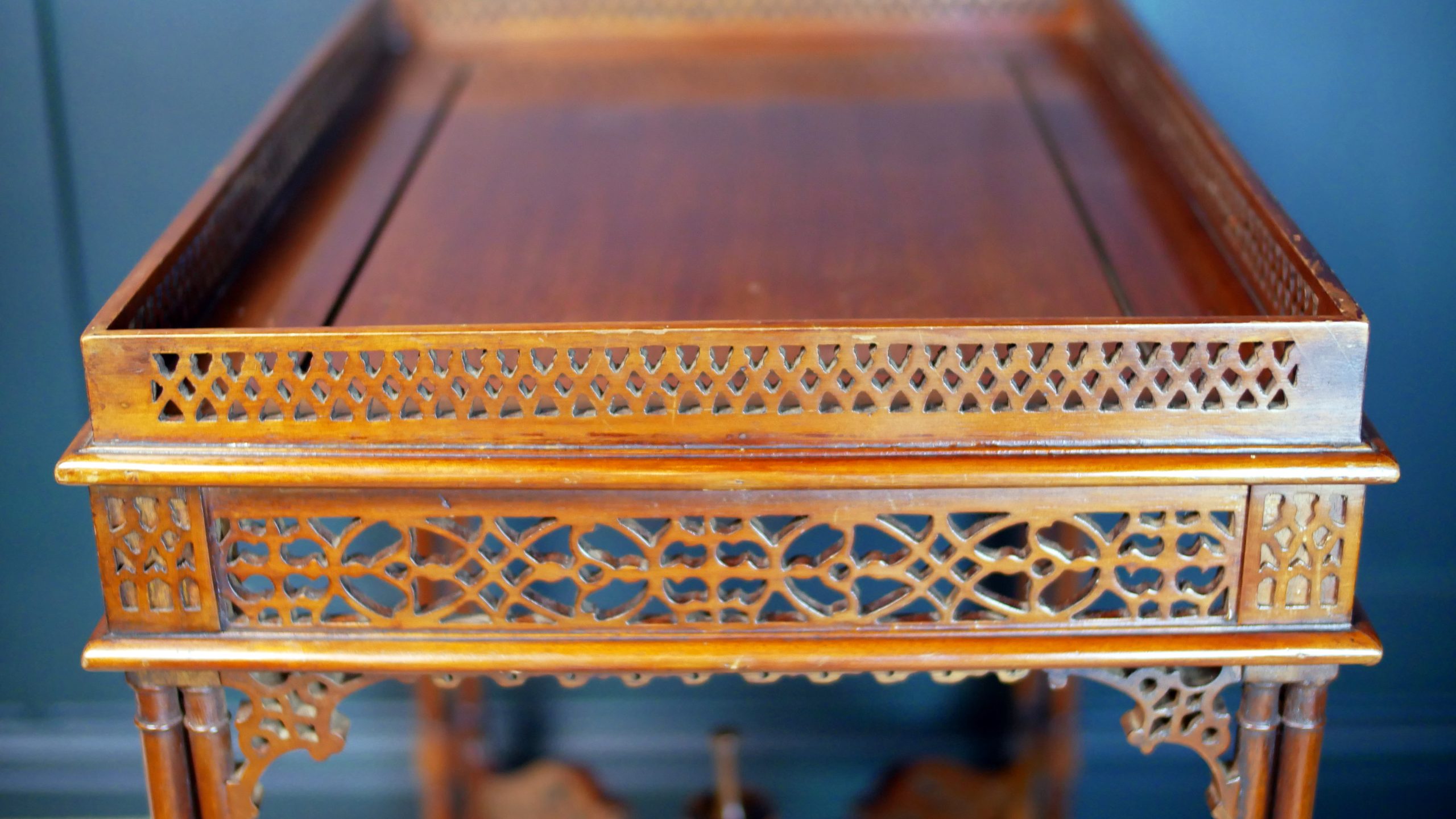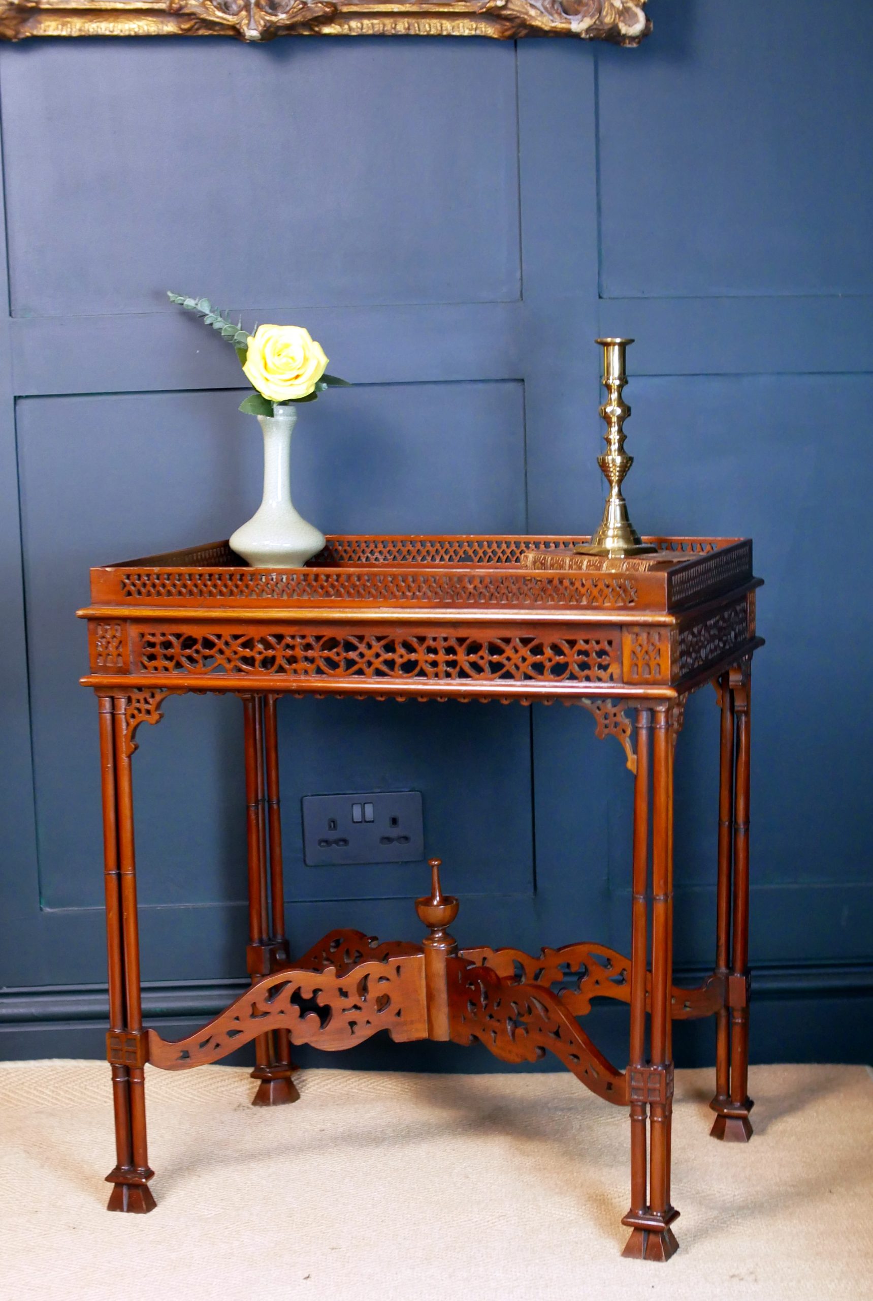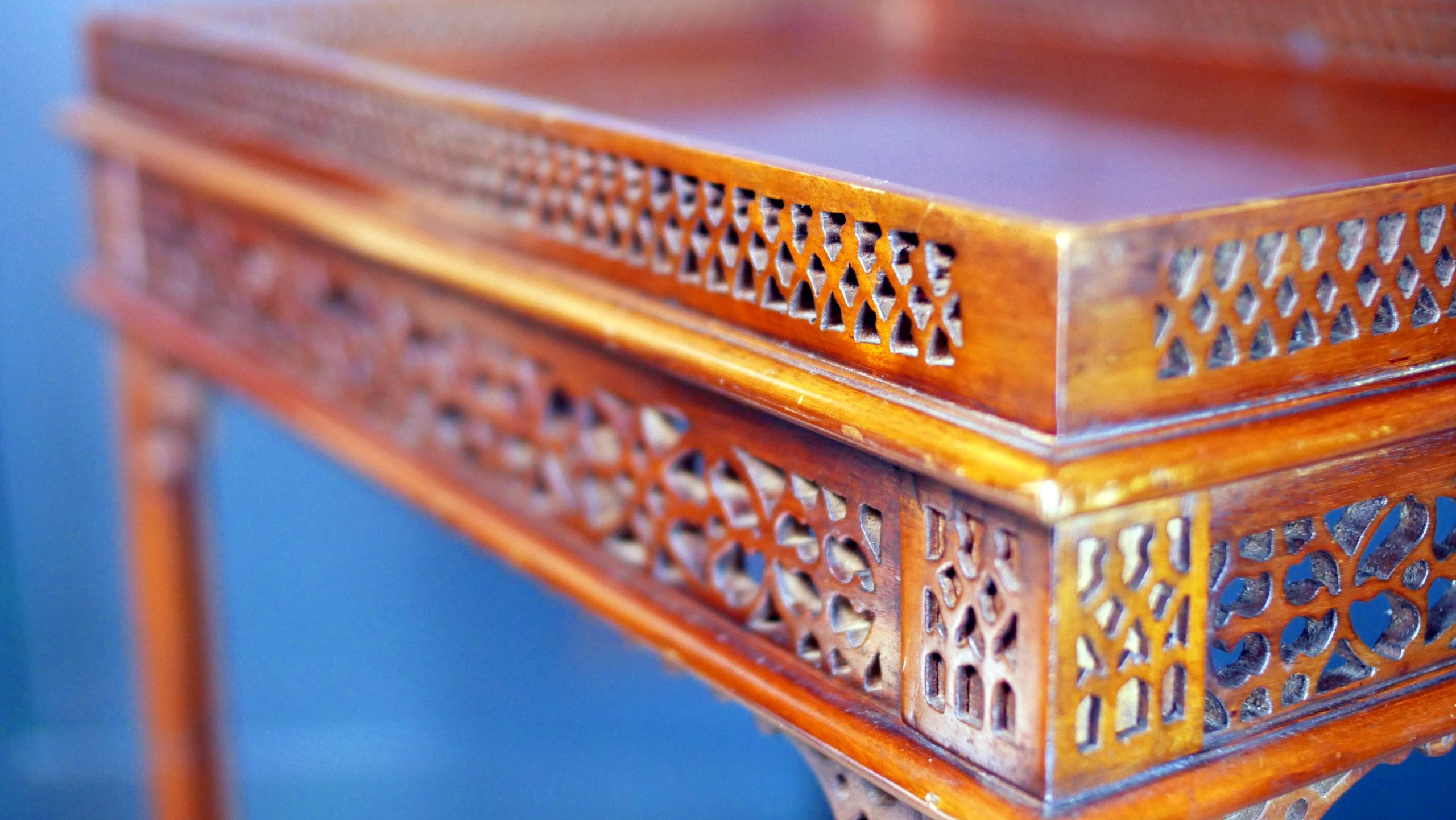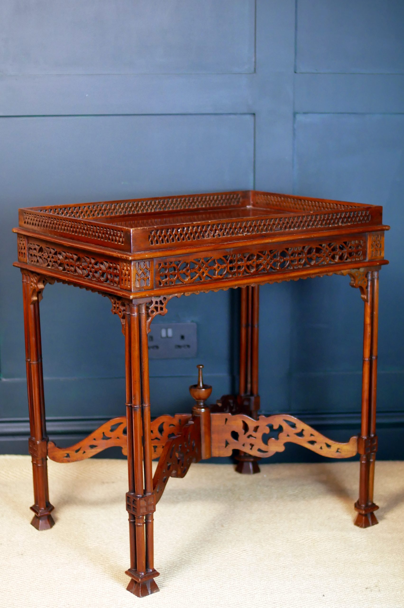 Beautifully executed in rich, warm mahogany, the table features an exquisitely carved fretwork gallery surrounding the top—an intricate lattice that immediately captures the eye and speaks to the level of skill invested in its creation. The openwork carving continues throughout the apron and stretcher supports, forming a delicate yet architectural composition of flowing patterns and geometric motifs.