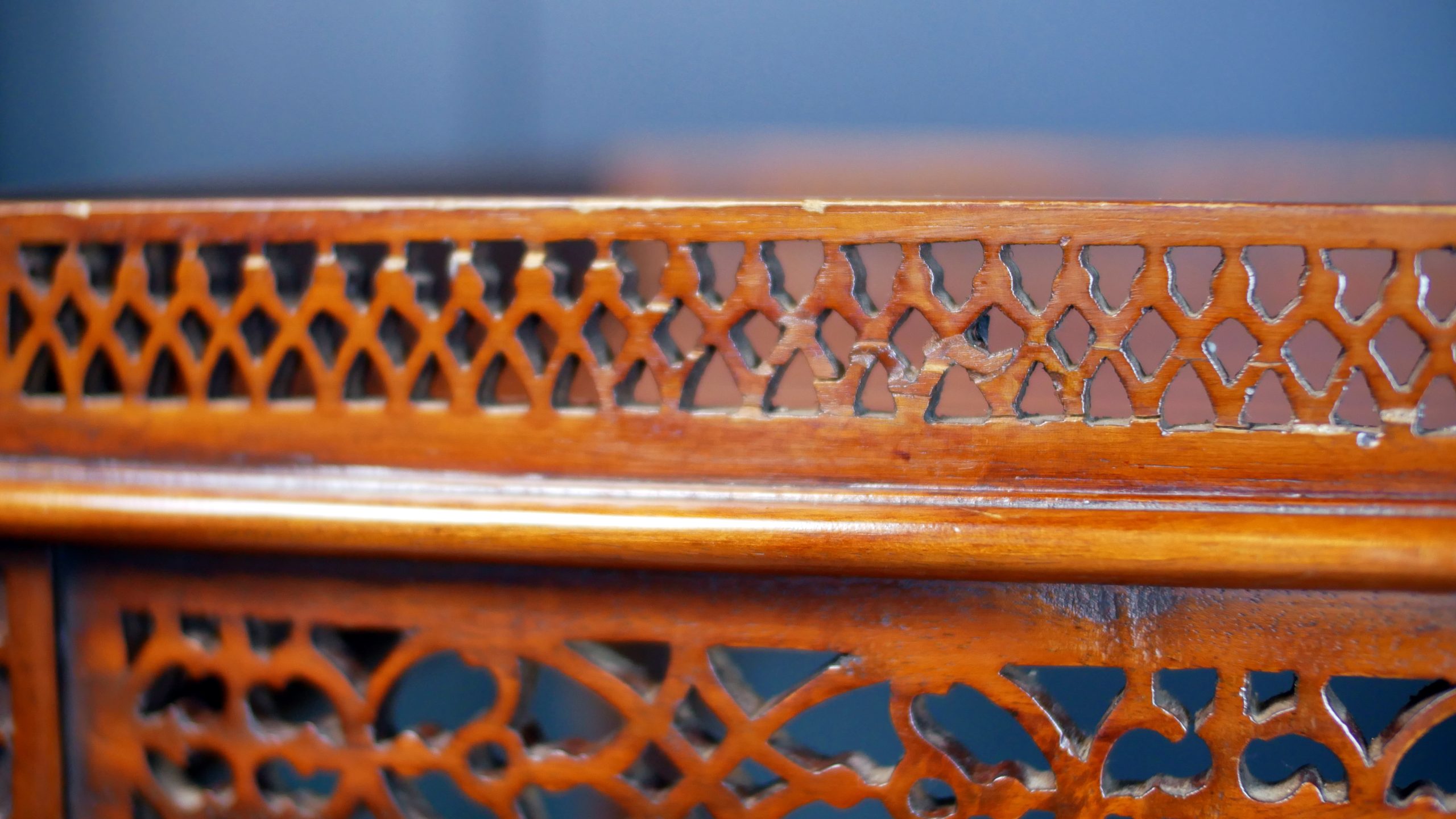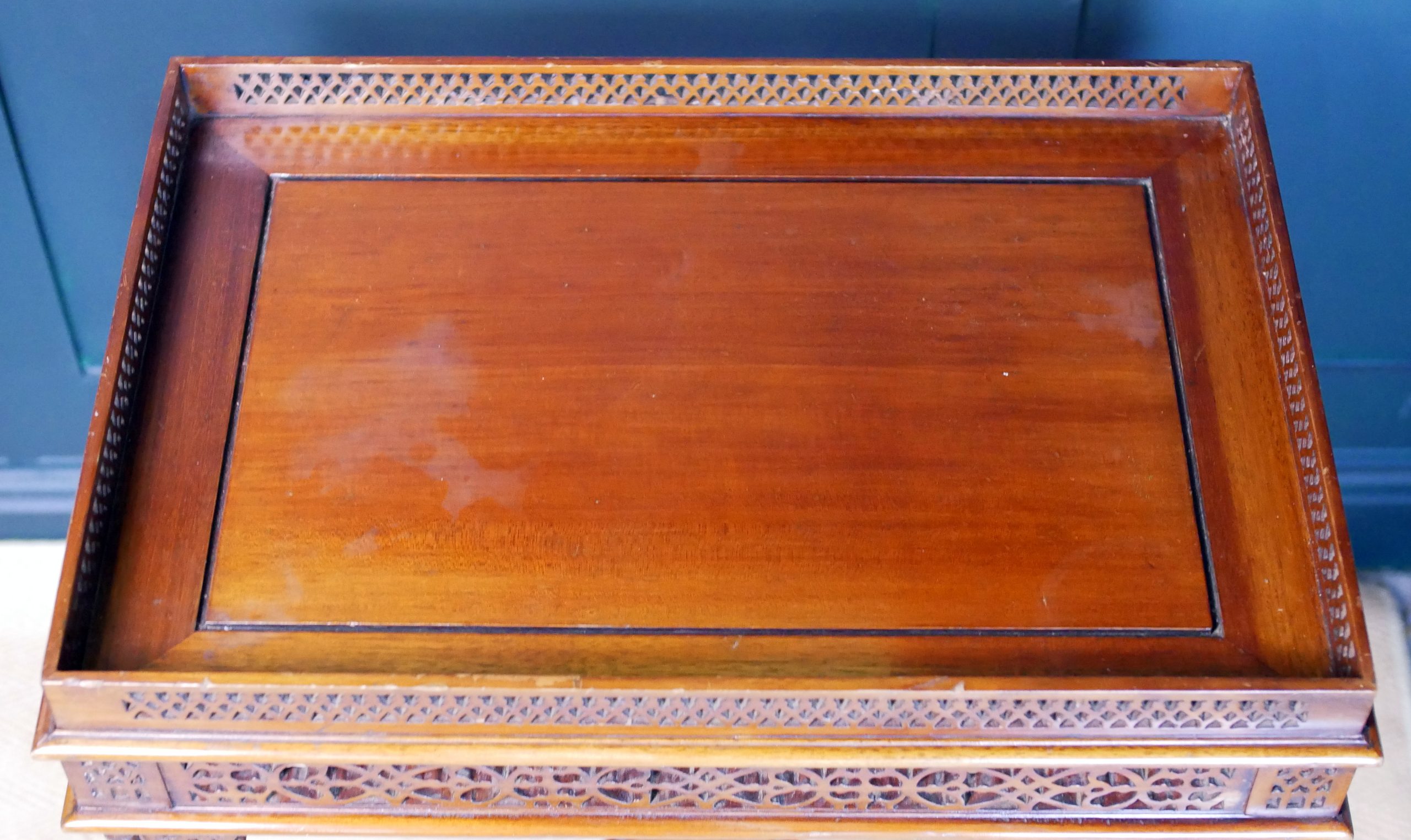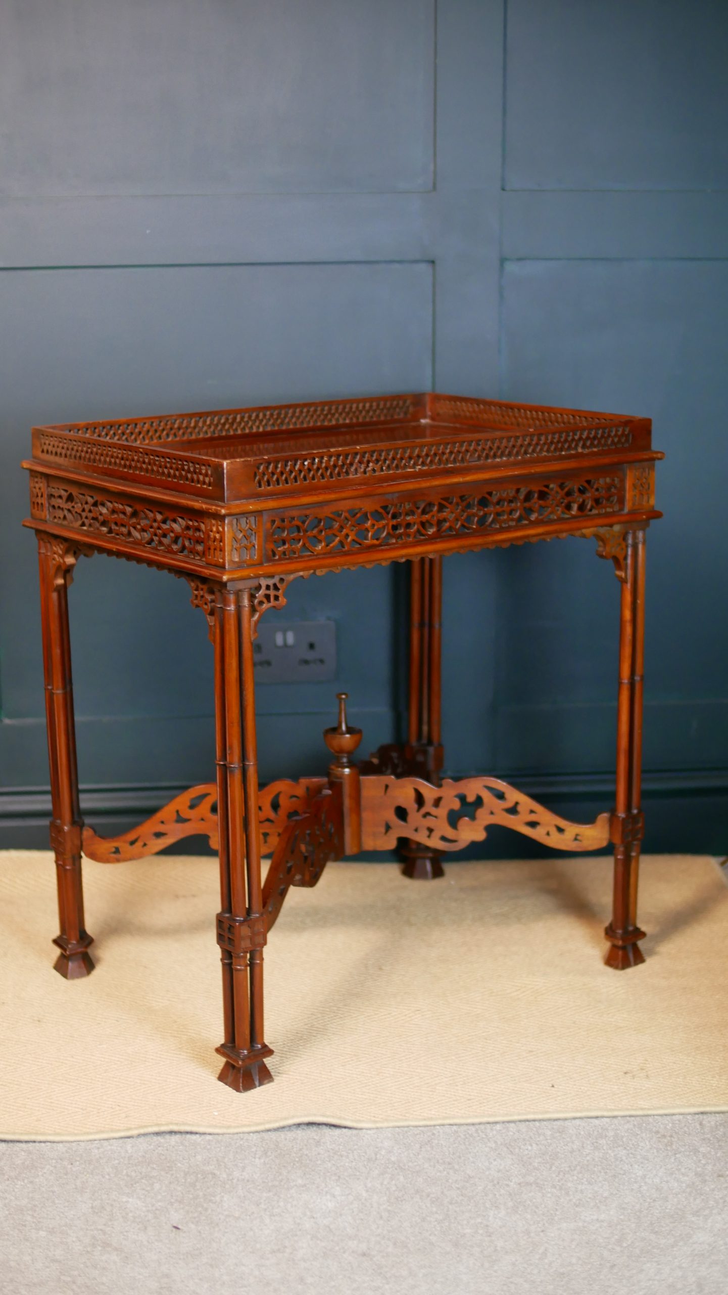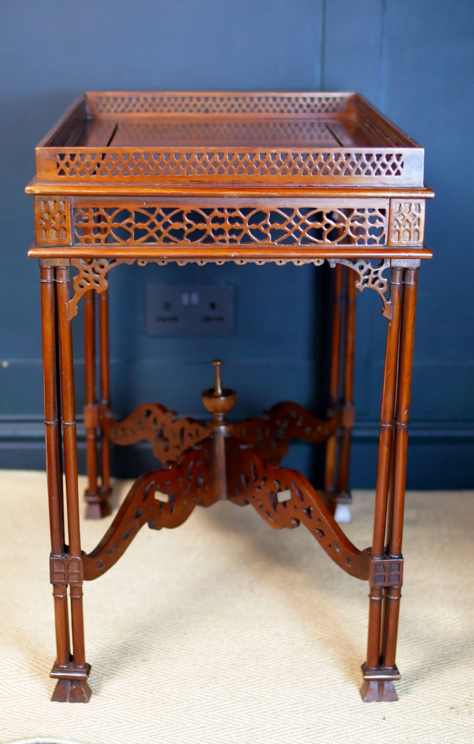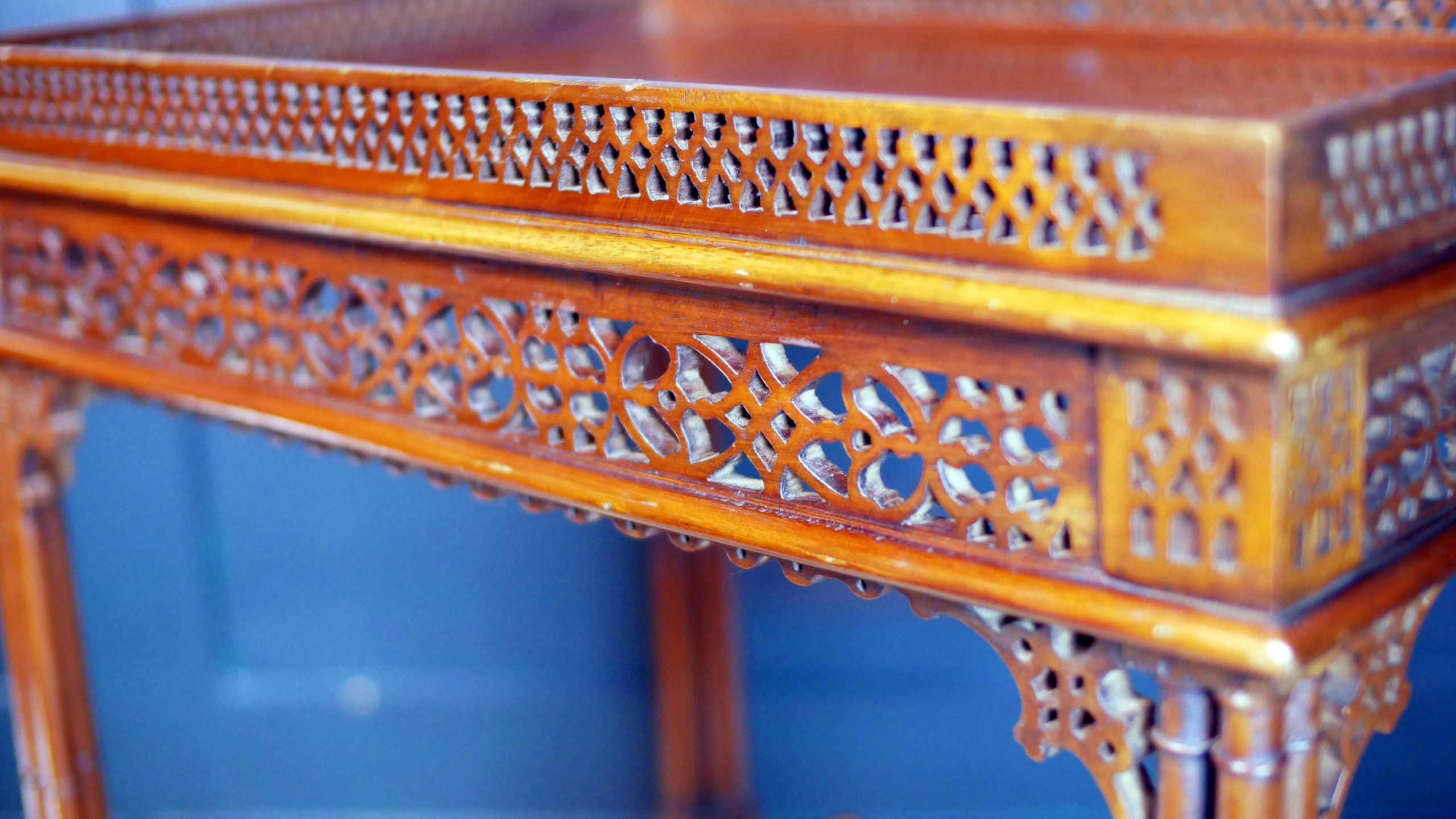 Beautifully executed in rich, warm mahogany, the table features an exquisitely carved fretwork gallery surrounding the top—an intricate lattice that immediately captures the eye and speaks to the level of skill invested in its creation. The openwork carving continues throughout the apron and stretcher supports, forming a delicate yet architectural composition of flowing patterns and geometric motifs.