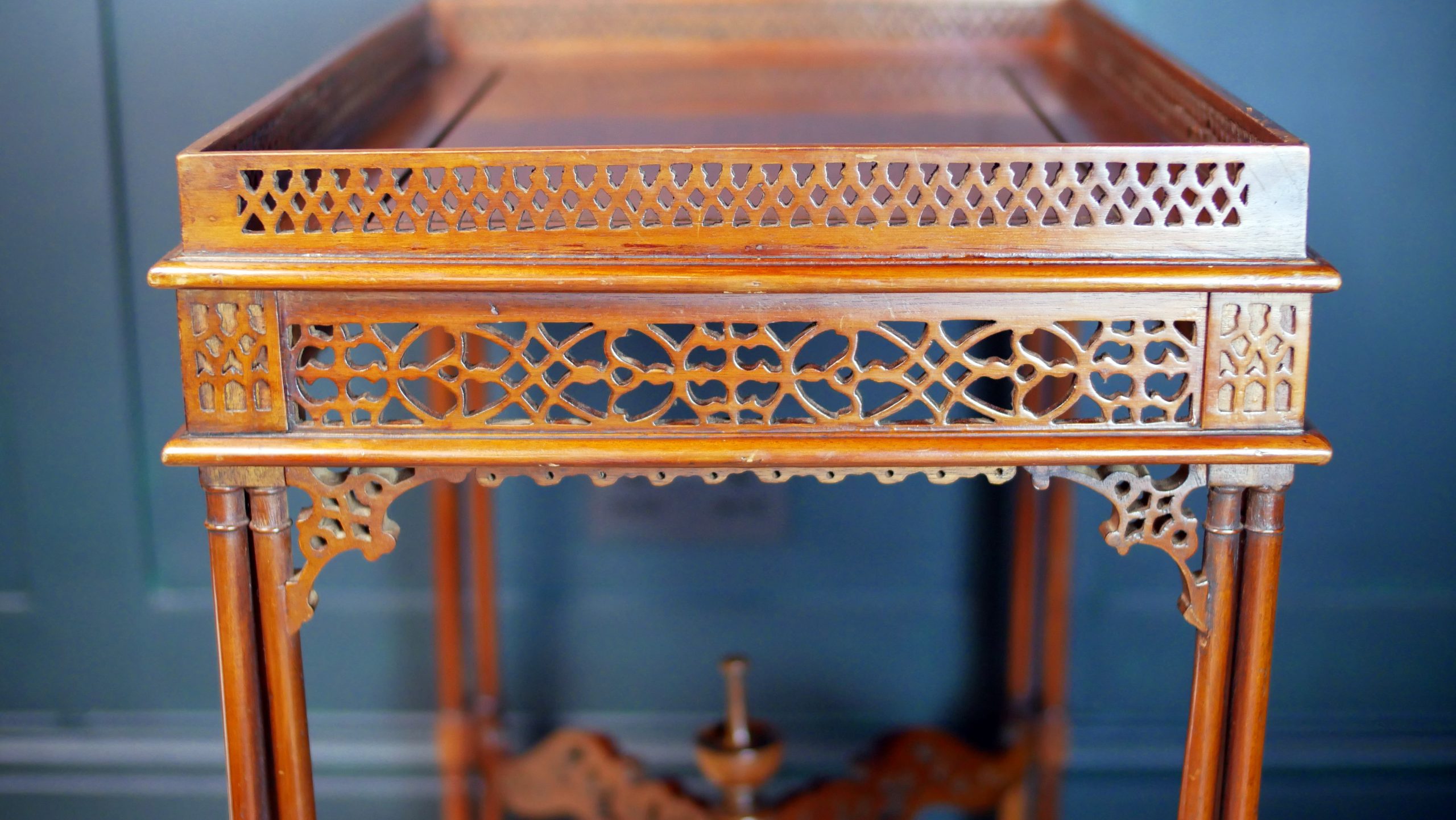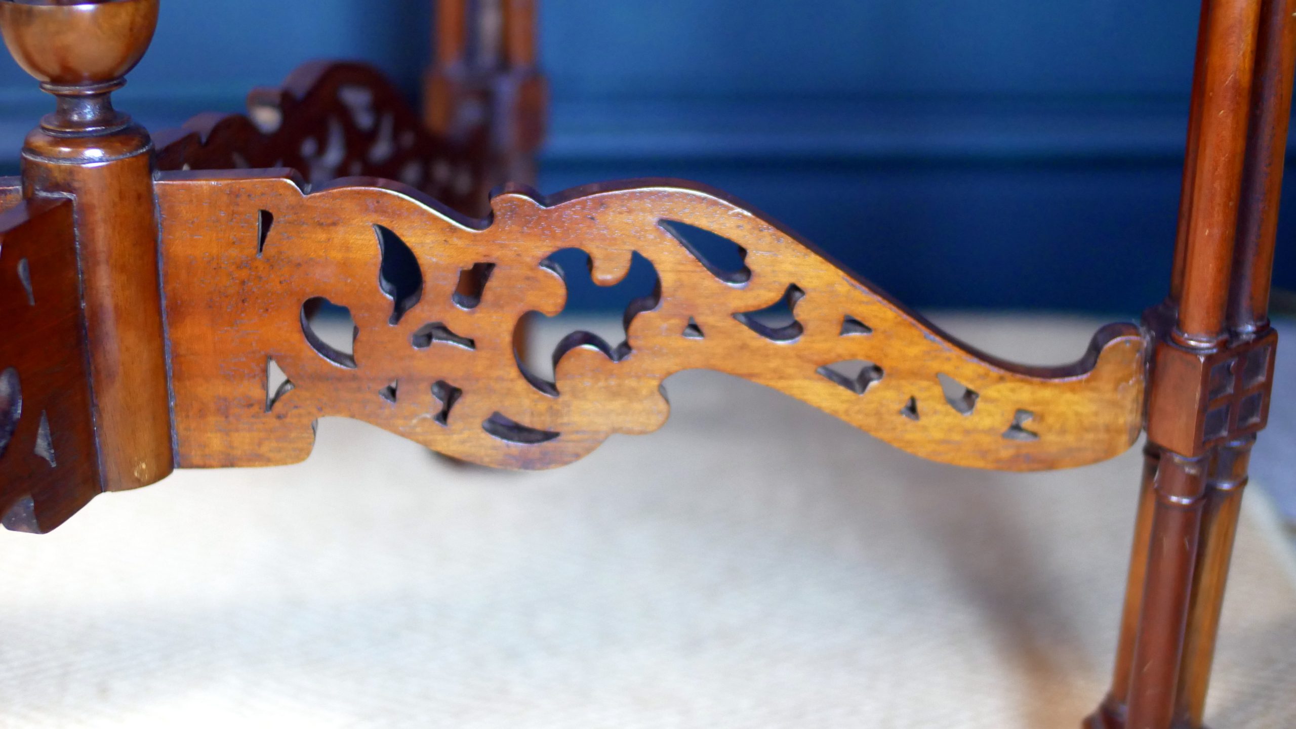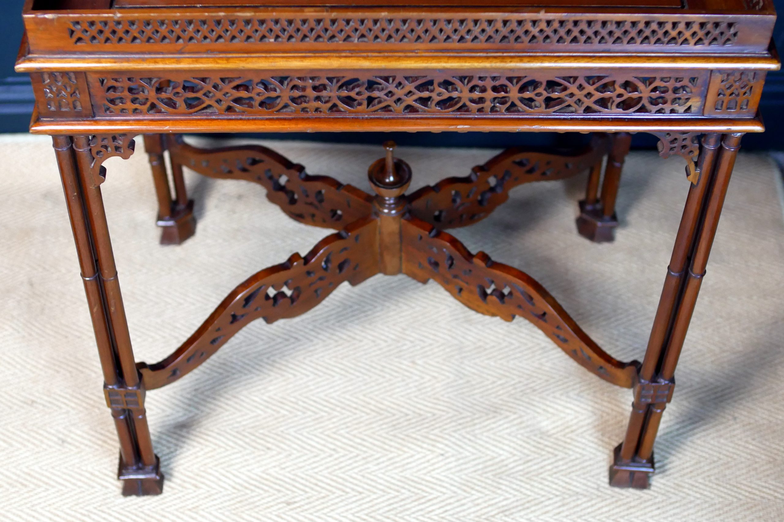 The slender legs are finely turned and terminate in neat feet, lending the table a light, graceful presence while maintaining excellent structural integrity. Below, a shaped and carved stretcher unites the legs with further decorative fretwork, creating visual harmony from top to base.