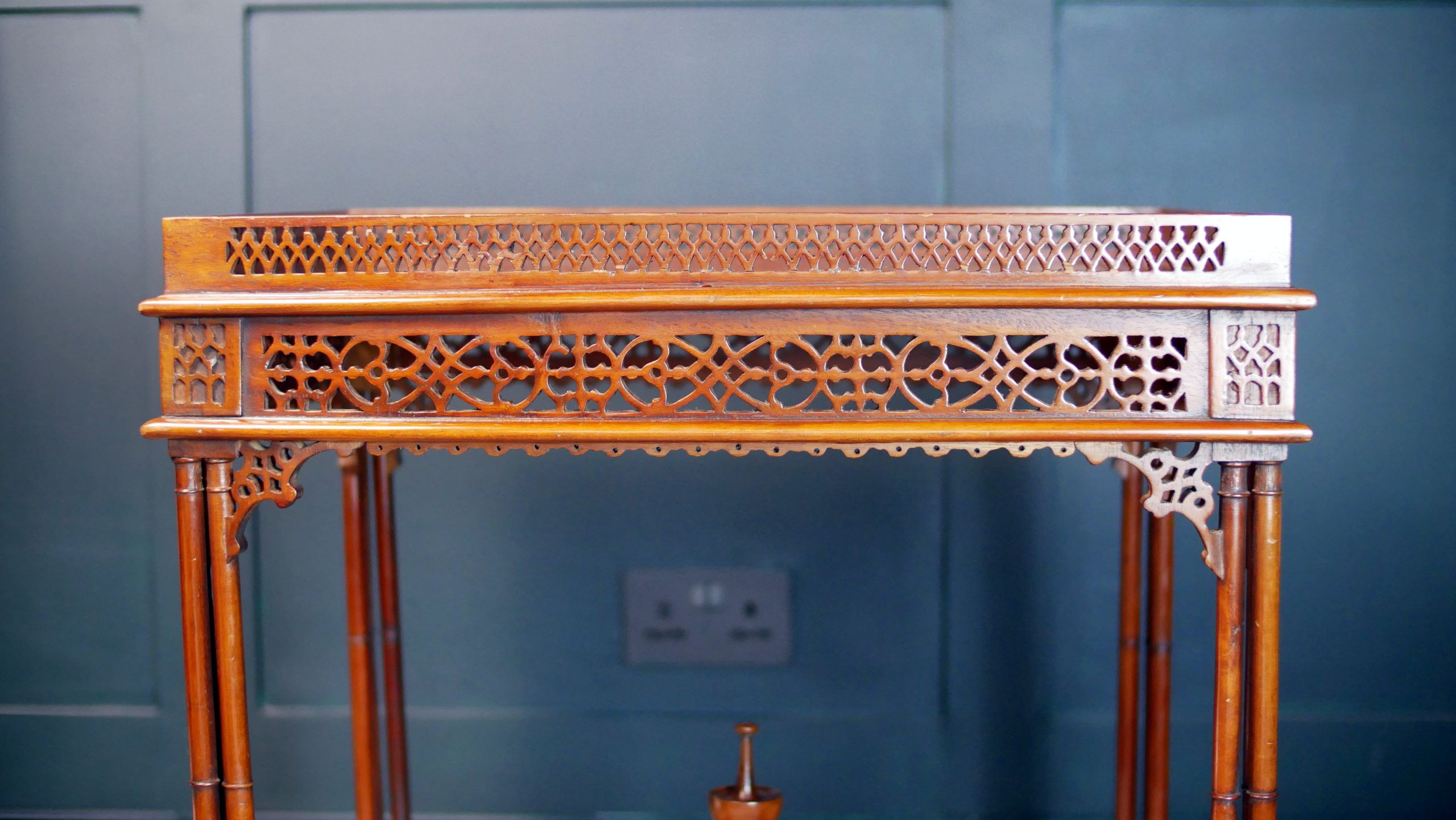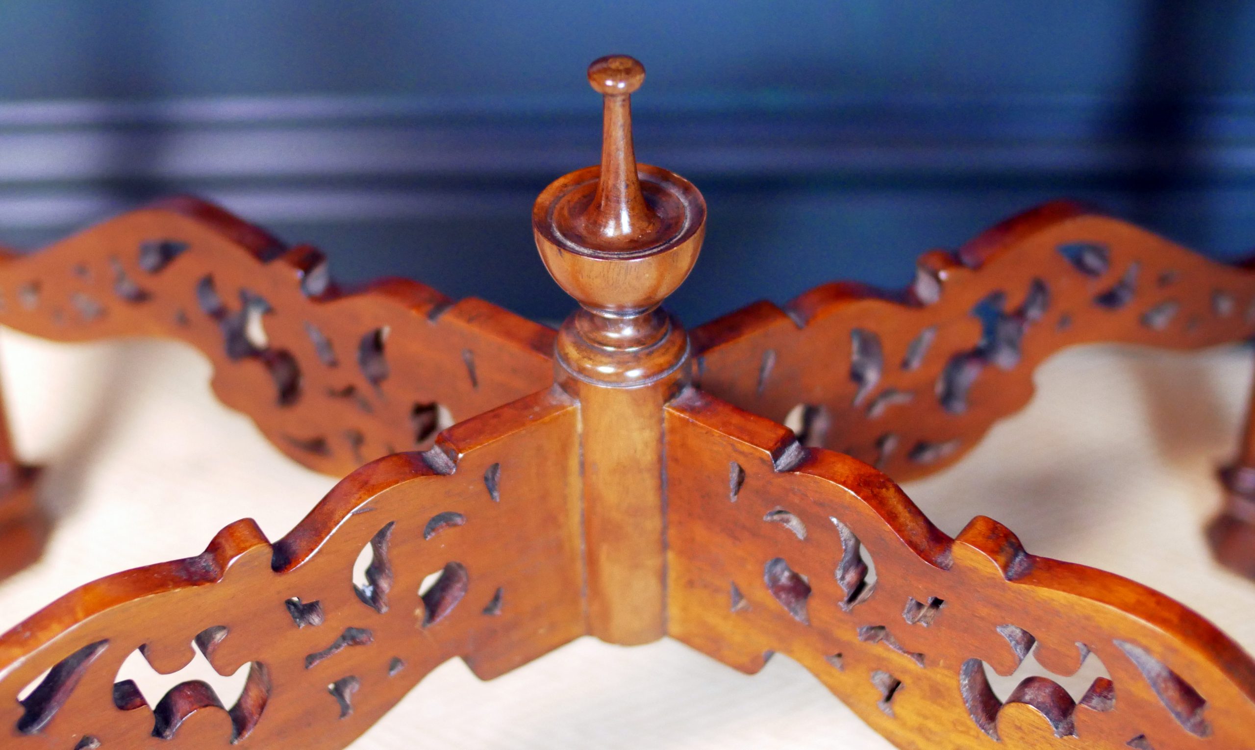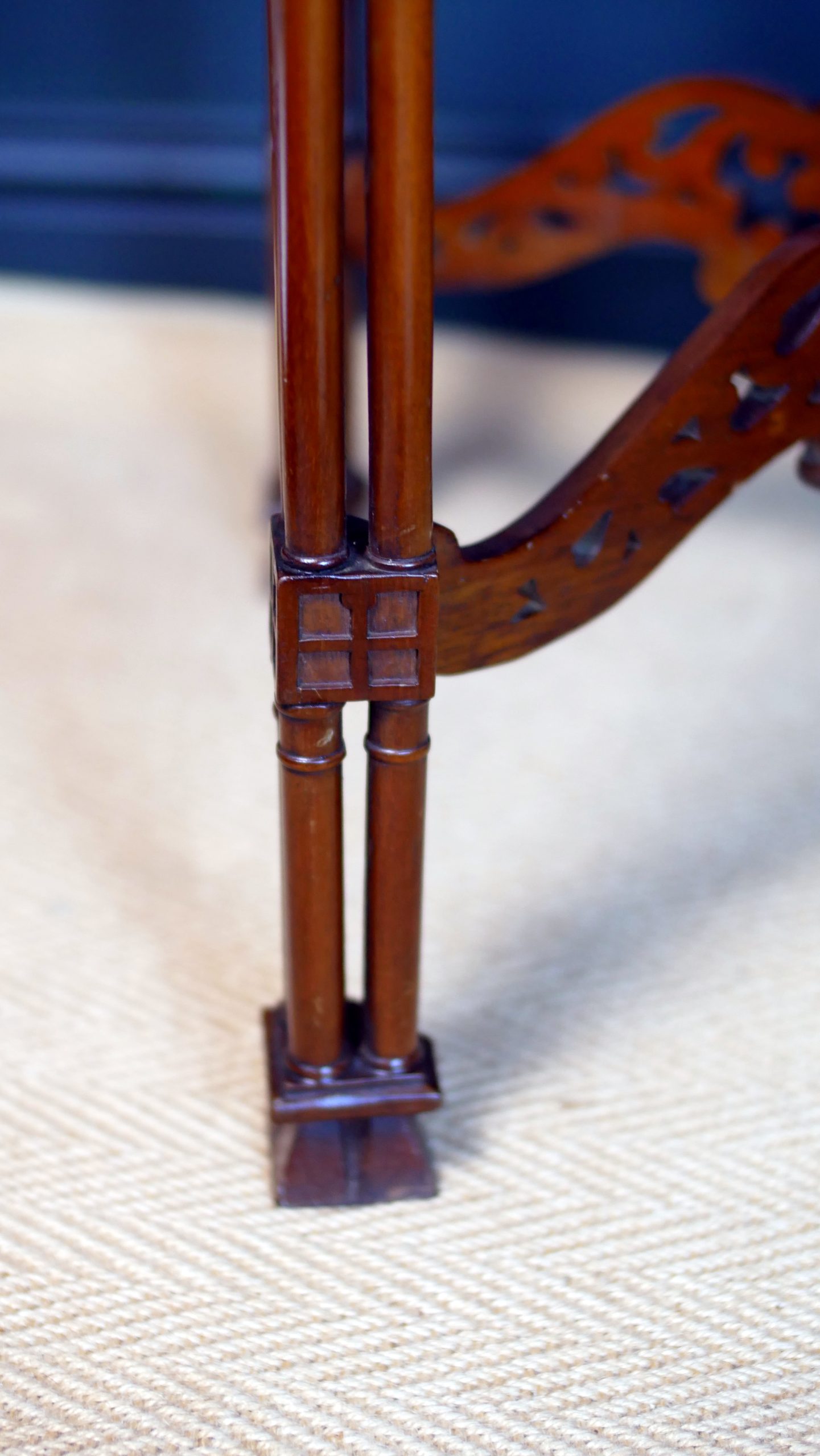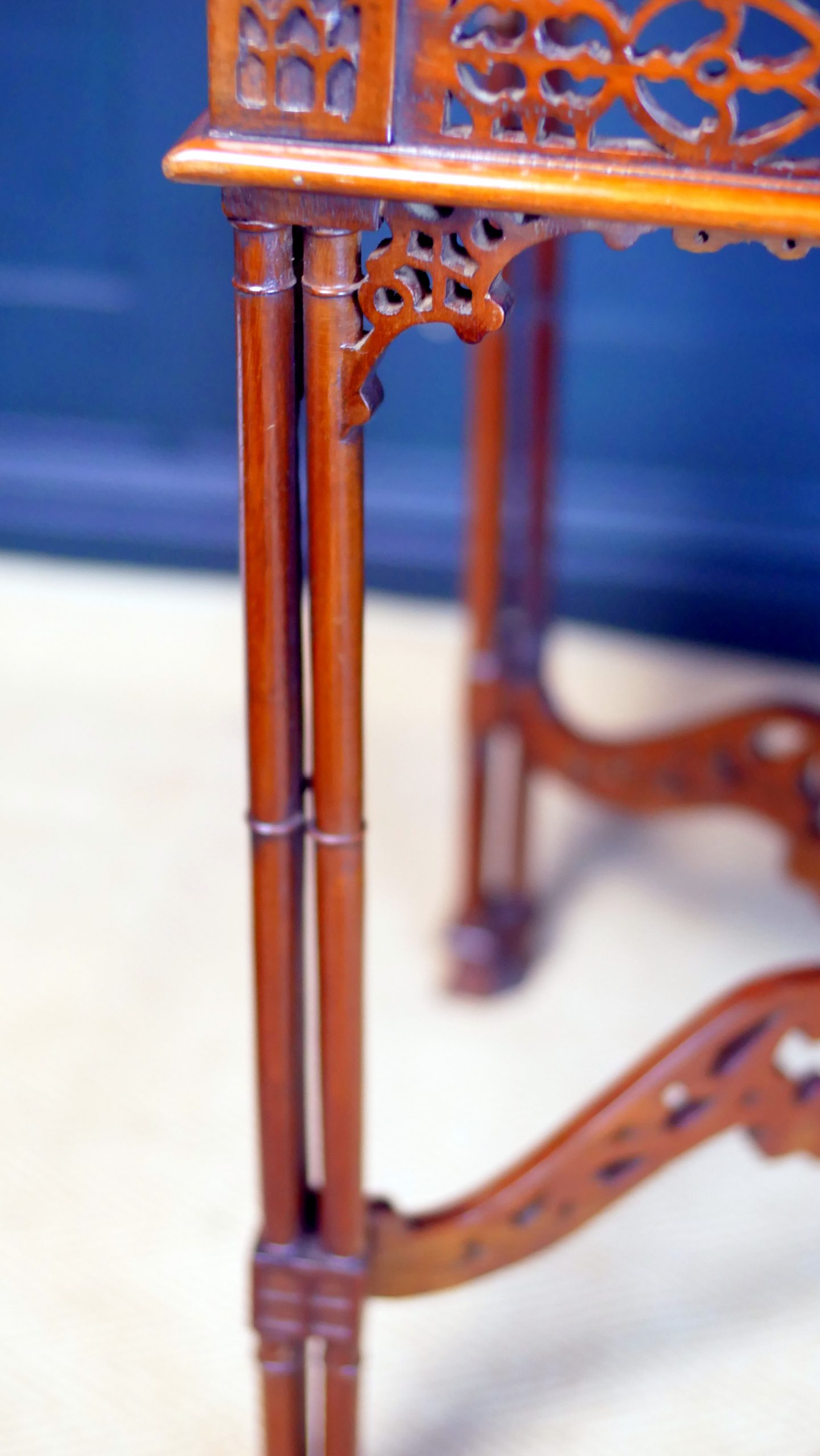 The slender legs are finely turned and terminate in neat feet, lending the table a light, graceful presence while maintaining excellent structural integrity. Below, a shaped and carved stretcher unites the legs with further decorative fretwork, creating visual harmony from top to base.