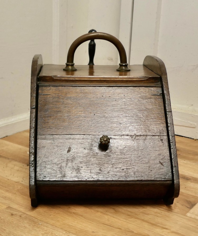 Chunky Victorian oak coal box with liner and shovel. A charming piece of useful Victorian furniture. The Purdonium has sloping front, hidden at the back a shovel in the shovel holder and inside a metal liner. The box is made in solid oak and it is in good sound condition for its age. The Scuttle is 15” high, 13” wide and 19” deep. TCC65. Manufacture Date : 1880 Materials : Oak
