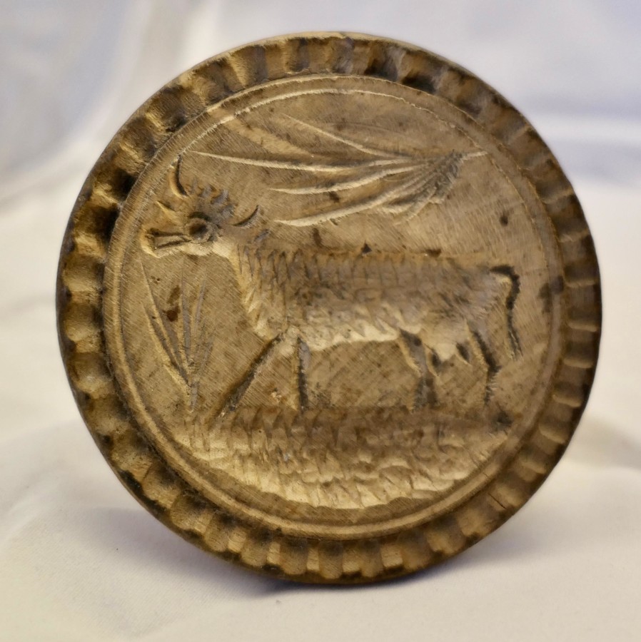 Collection of Treen Kitchenalia, Butter Marker This is a great little Collection of Treen Kitchenalia, a Butter Marker, this has a naive cow carving, a lemon squeezer and a turned sycamore egg cup A good set for the collector, a bit of historical wood worm on the butter Stamp SC79 Manufacture Date : 19th century Materials : Sycamore