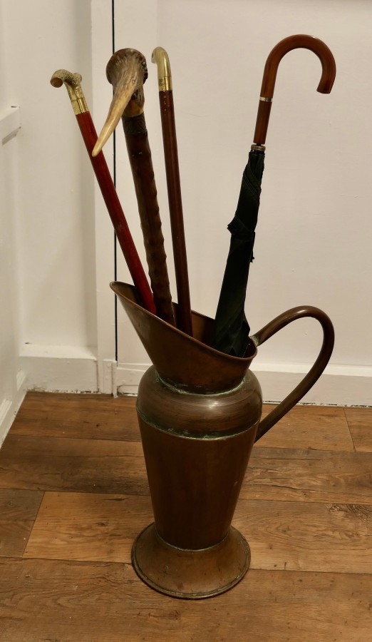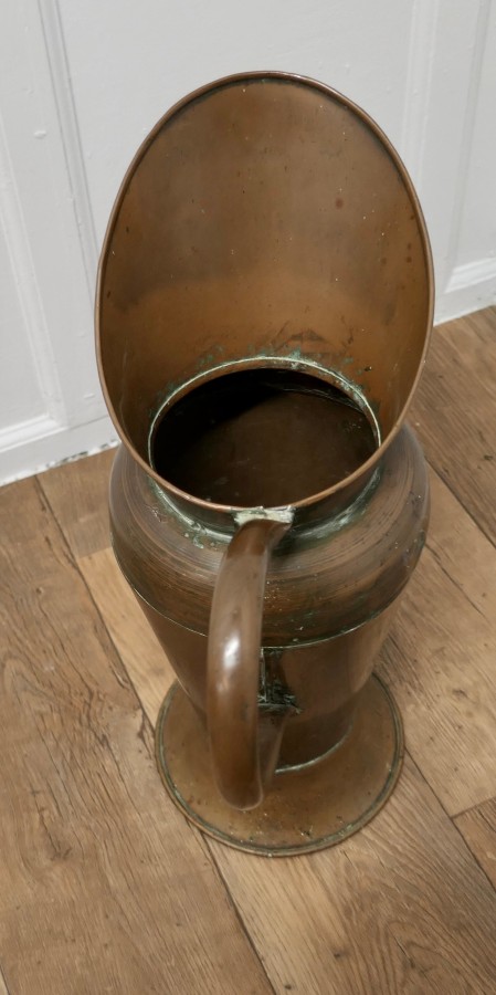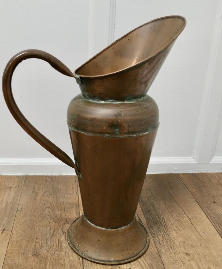 2ft tall Copper Jug Shop Display This is a great piece, it is made in hand beaten copper, which has a beautiful aged colour I expect the Jug was originally an advertising piece for a coffee shop or tea room and all hand made, it is in good condition for its age, it makes a great stick stand The Jug is 23” high, and about 16” from the end of its spout to the outer part of the handle MS79. Manufacture Date : 1880 Materials : Copper