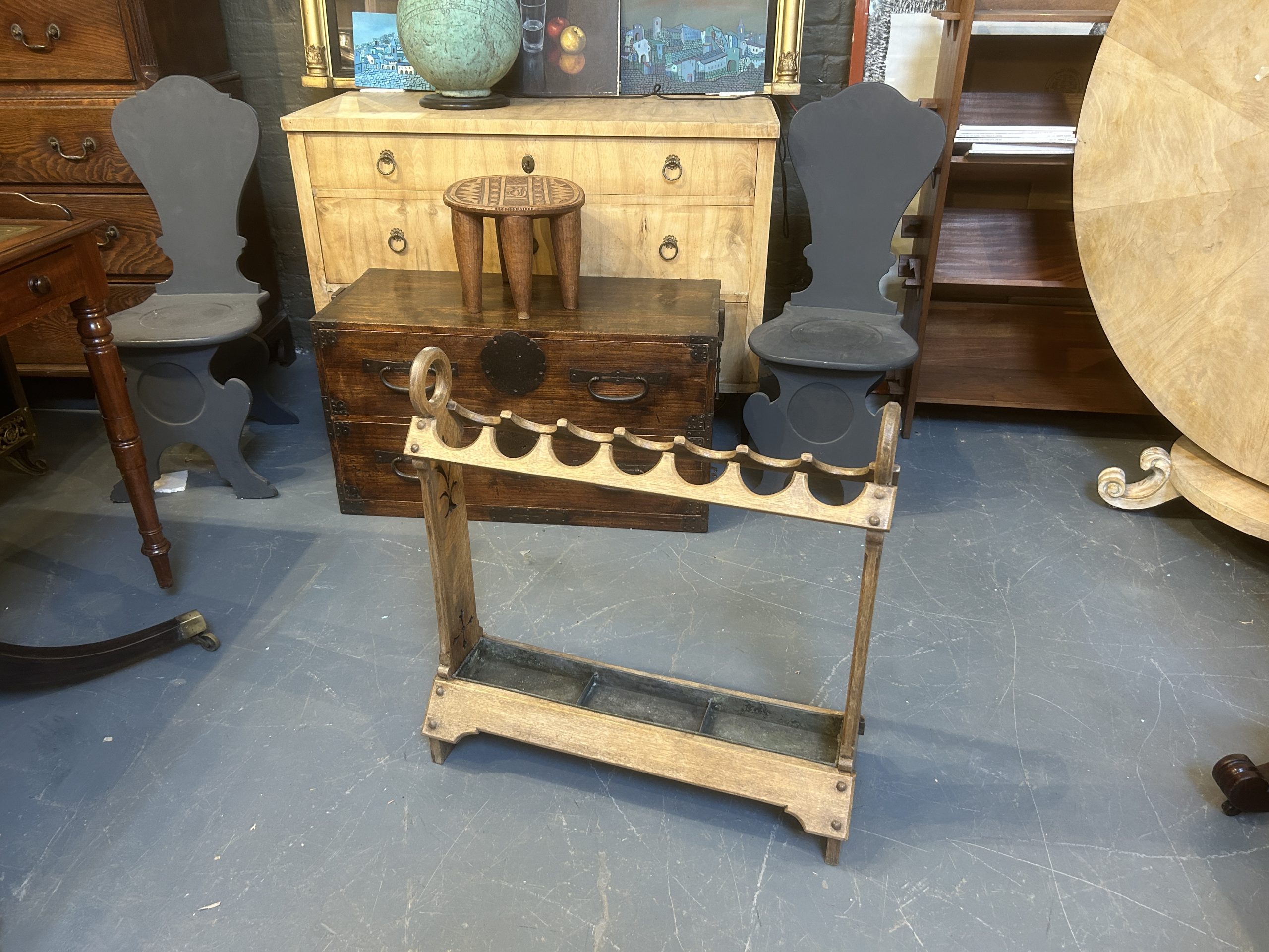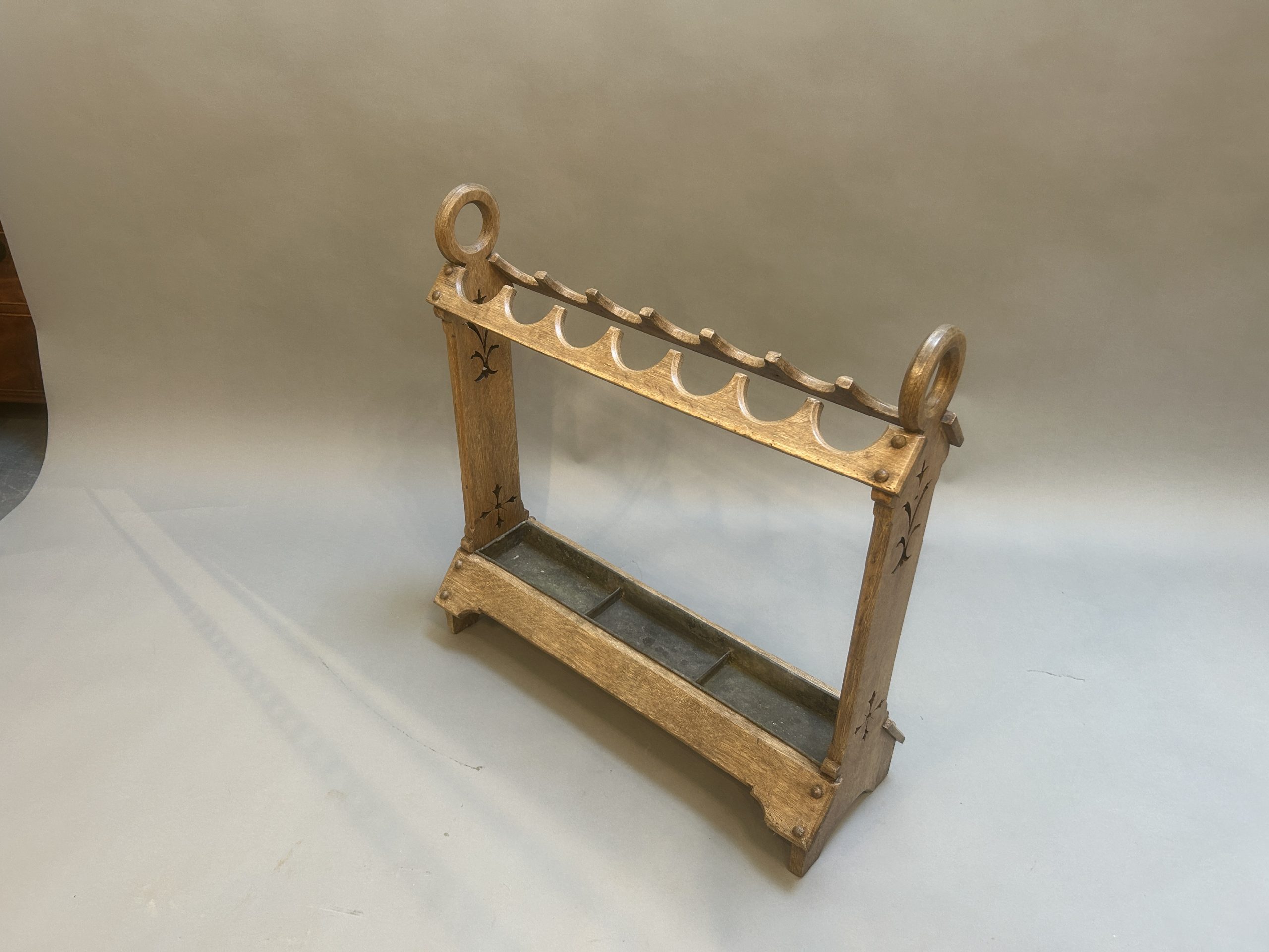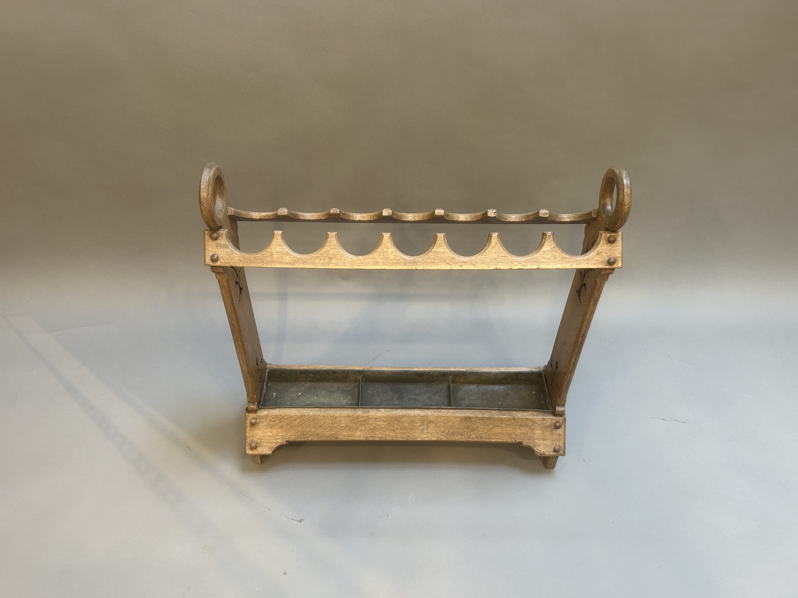 Victorian oak with scalloped stretchers on end supports with pierced detail to base fitted original drip tray.