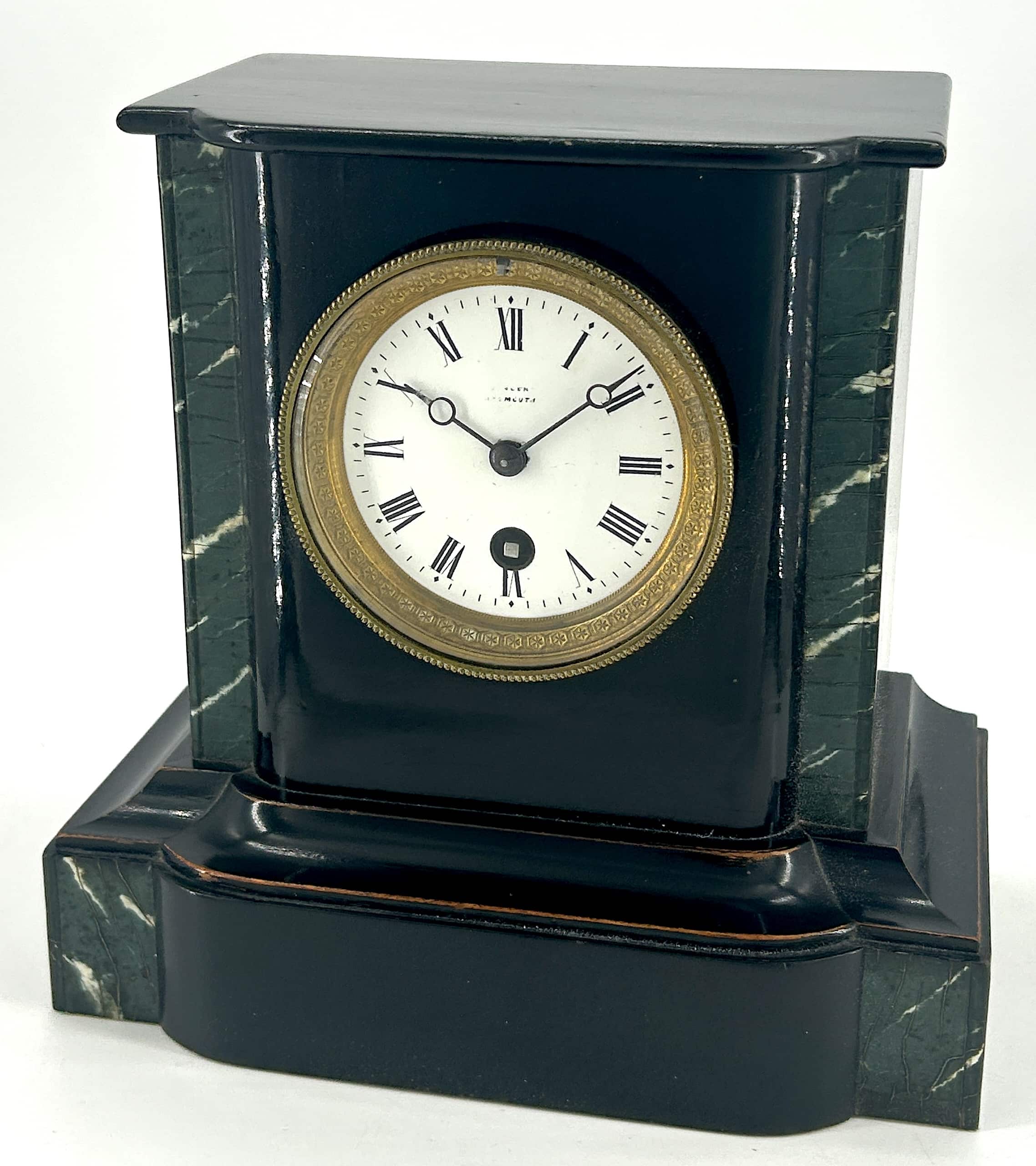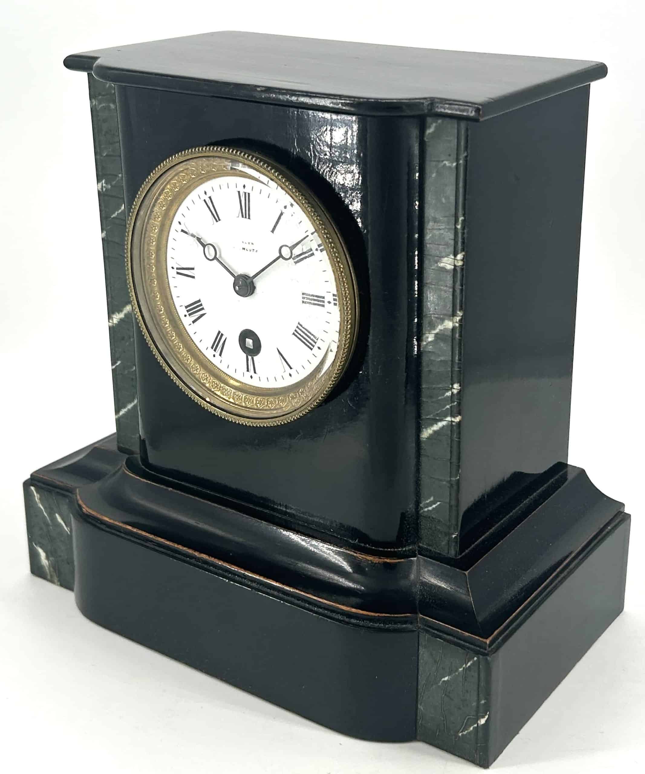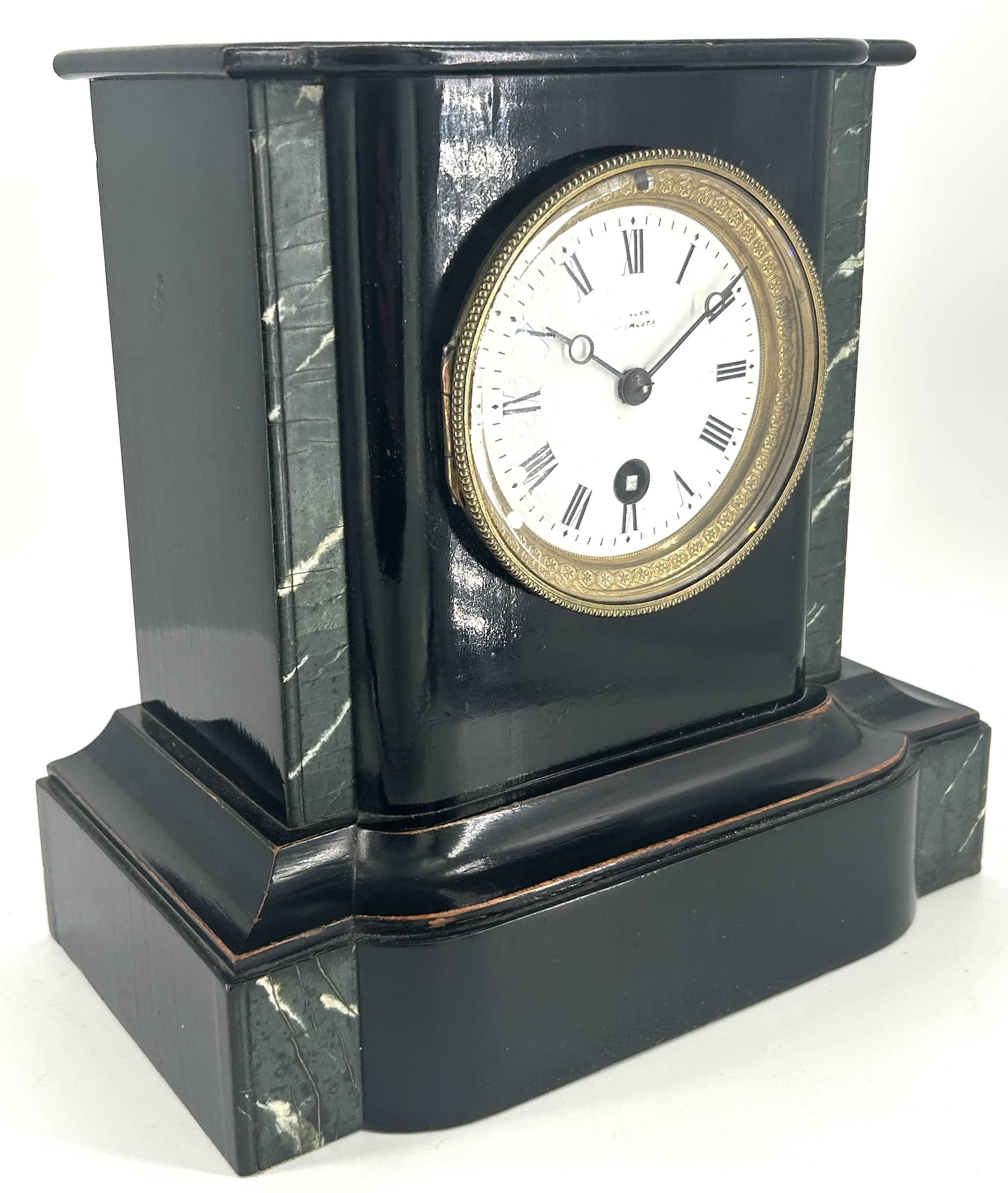 Lovely victorian false slate mantle clock with original enamel dial and ormolu bezel. Case is of architectural design with false marble side edge borders.