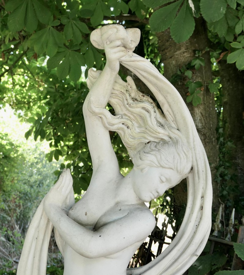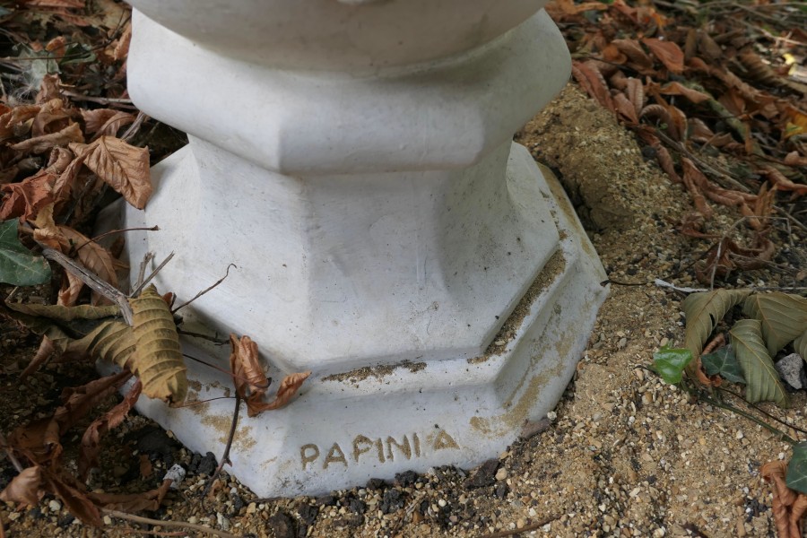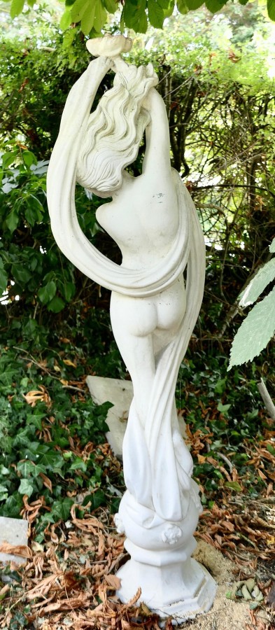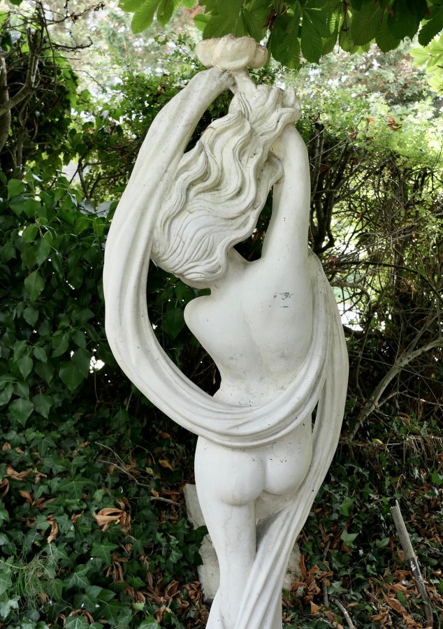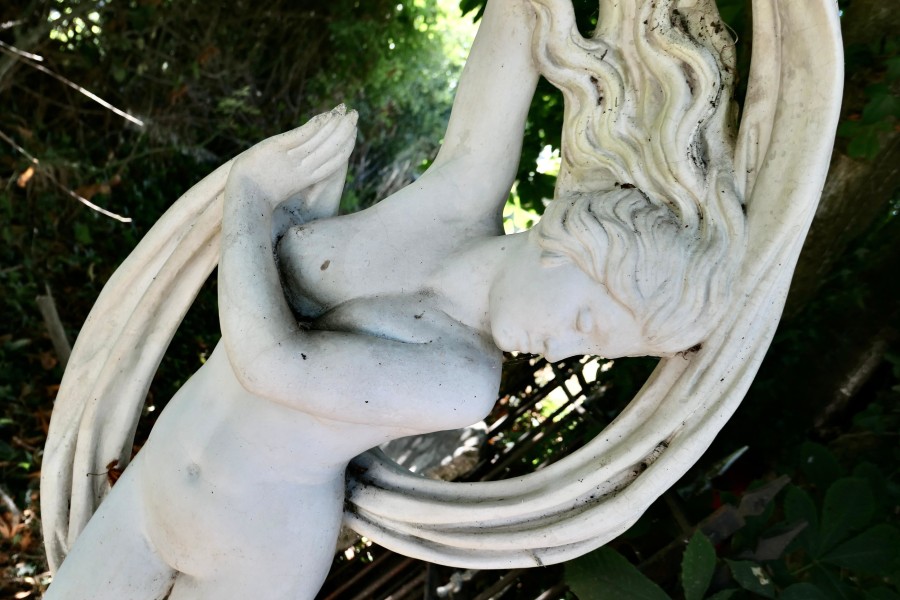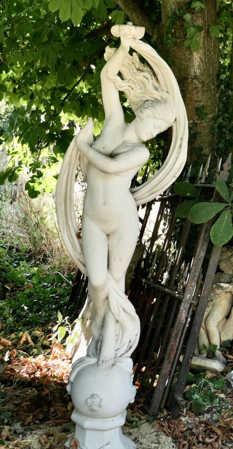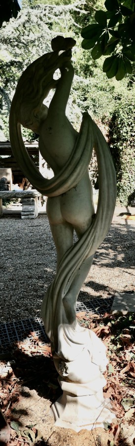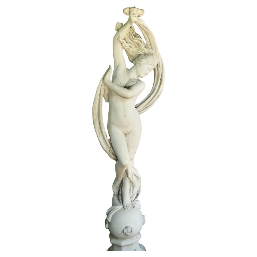 A dancing maiden marble sculpture By Papini A signed marble “di latte” (crushed composite marble) sculpture. The sculpture is of a young dancer swirling her ribbons and and her hair flowing, she is posing on a ball decorated with Roses, like the one she is holding in her hand, this is set on a hexagonal pedestal The statue is signed “PAPINI A” for the Papini (Agostino SNC) company in the Rignano Flaminio., it is is in slightly weathered condition bur generally very good She is 67” tall, 19” wide and 13” deep HM107 Manufacture Date : 1960 Materials : Statuary-marble