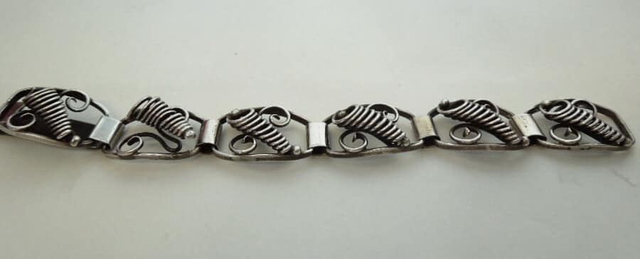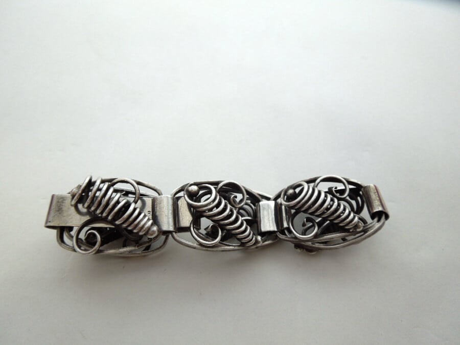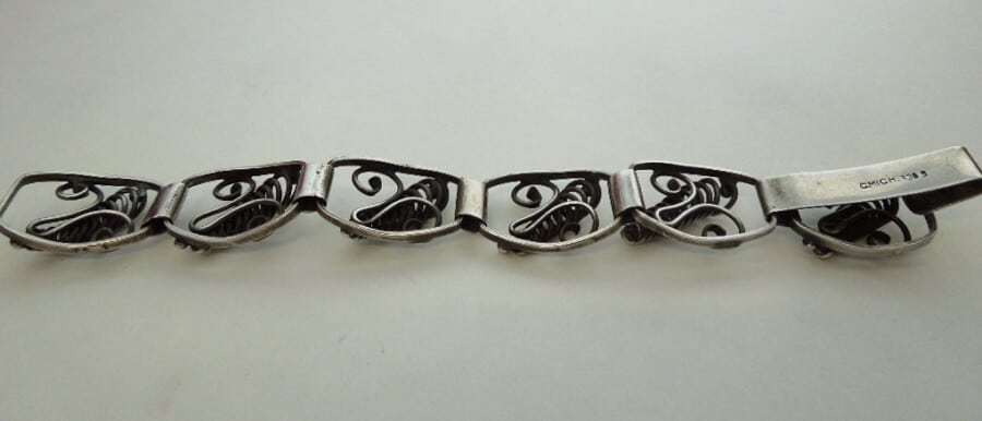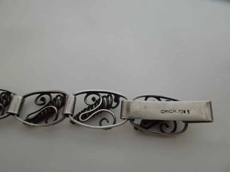 The back of the clasp fitting is stamped C.MICH. 830 S. This means that the silver content of the bracelet is 83% and is the standard used in most Danish silver.