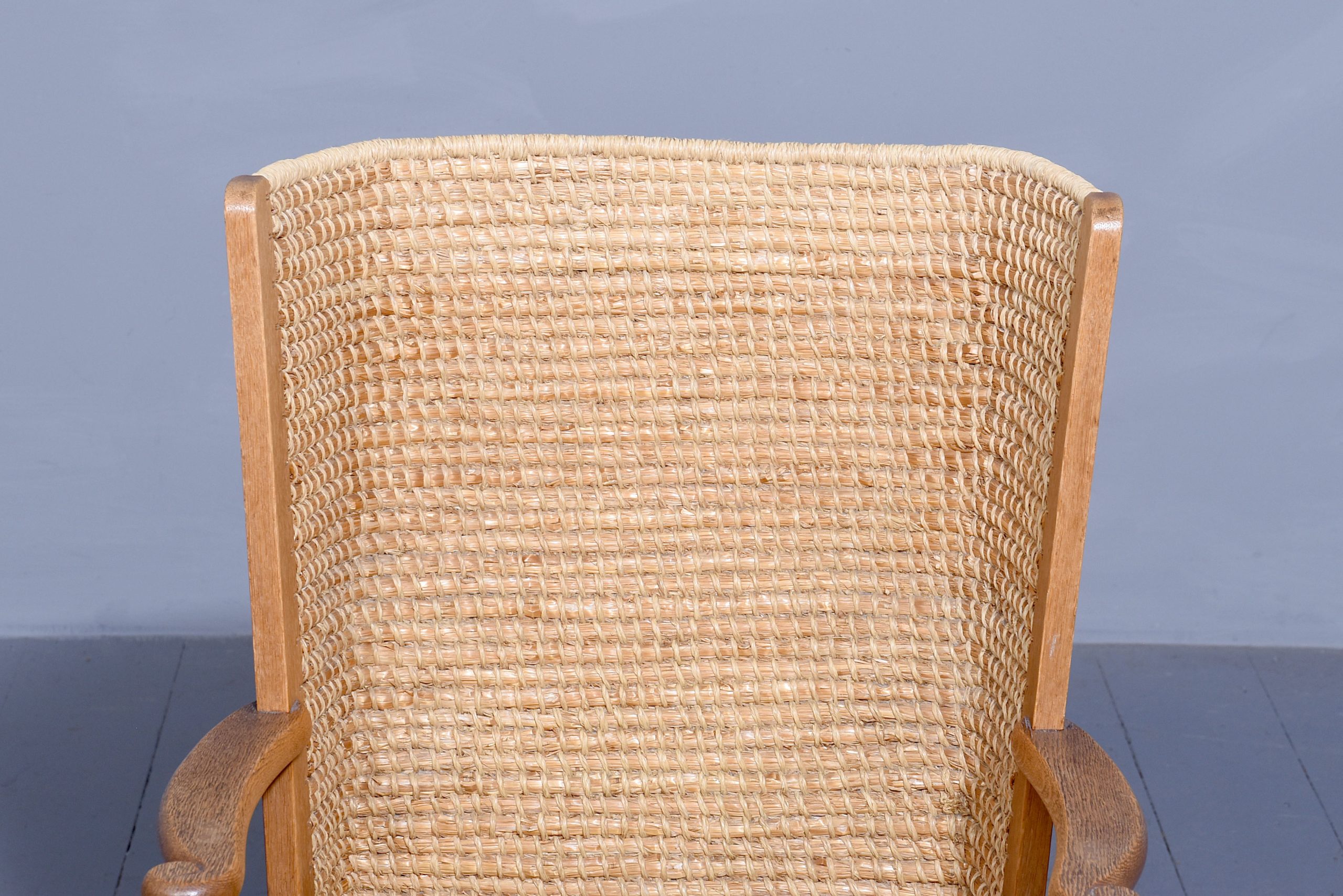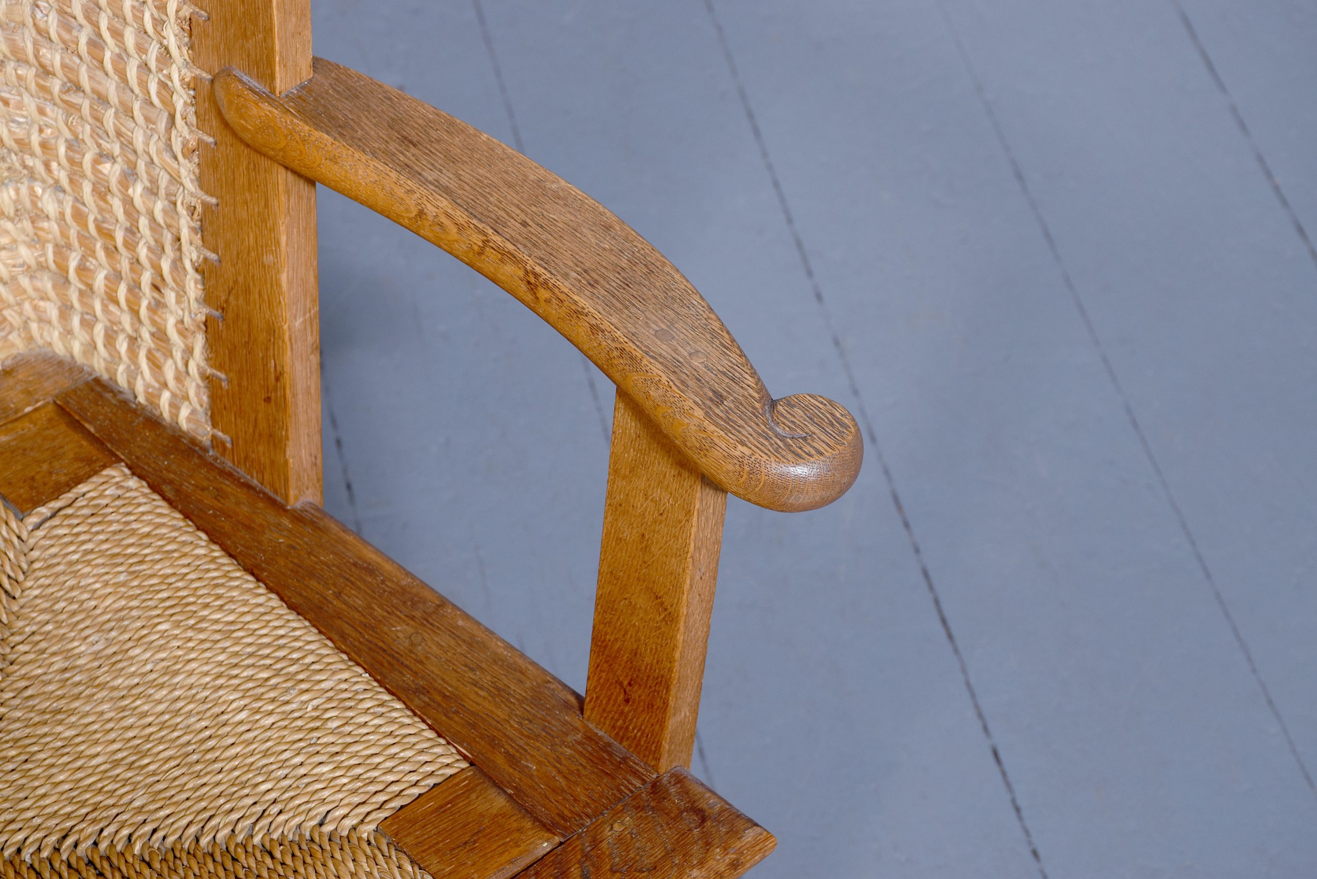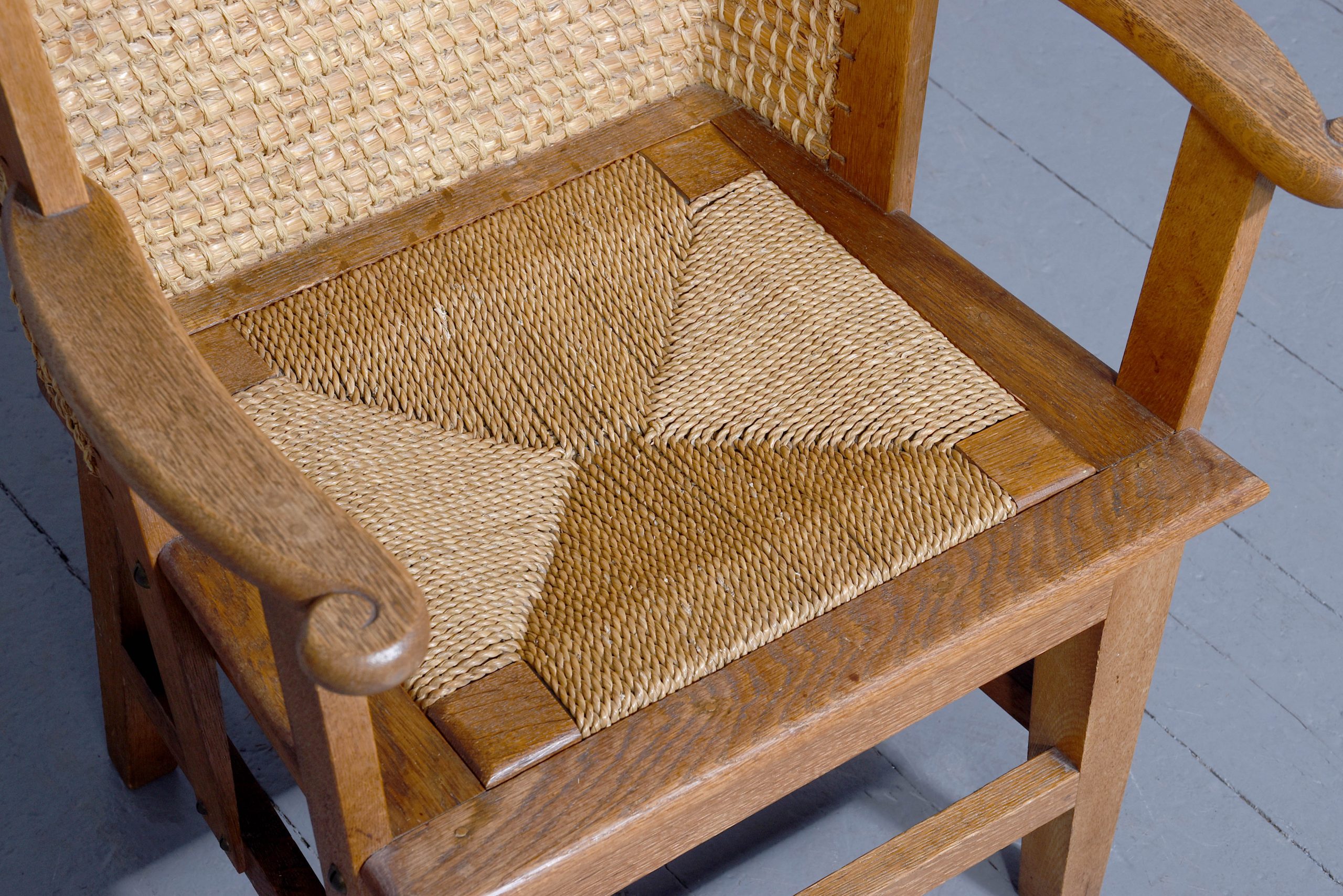 Circa 1920s. A neat sized oak framed child’s Orkney chair, probably by ‘David Kirkness’, of traditional form with old straw back tied with marram grass, the drop in seat with a classic Orcadian pattern in marram grass, with shaped arms with visible peg joints and curved ends supported on simple uprights with brass bolts to the sides, resting on four square legs, the back both slightly splayed and the front legs square and tapering, all braced by conforming stretchers.