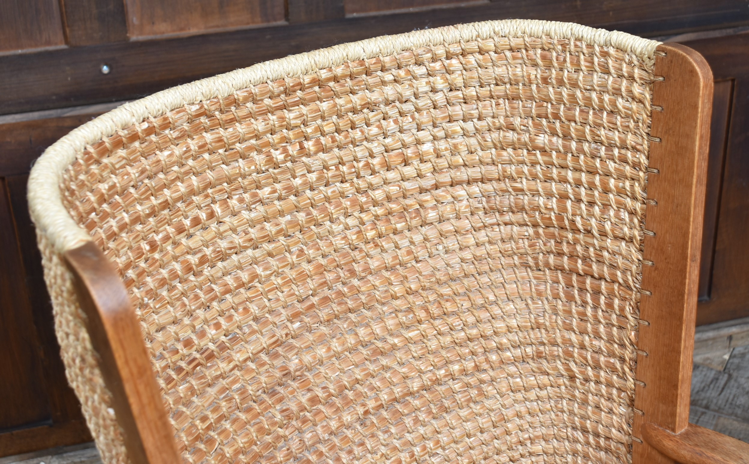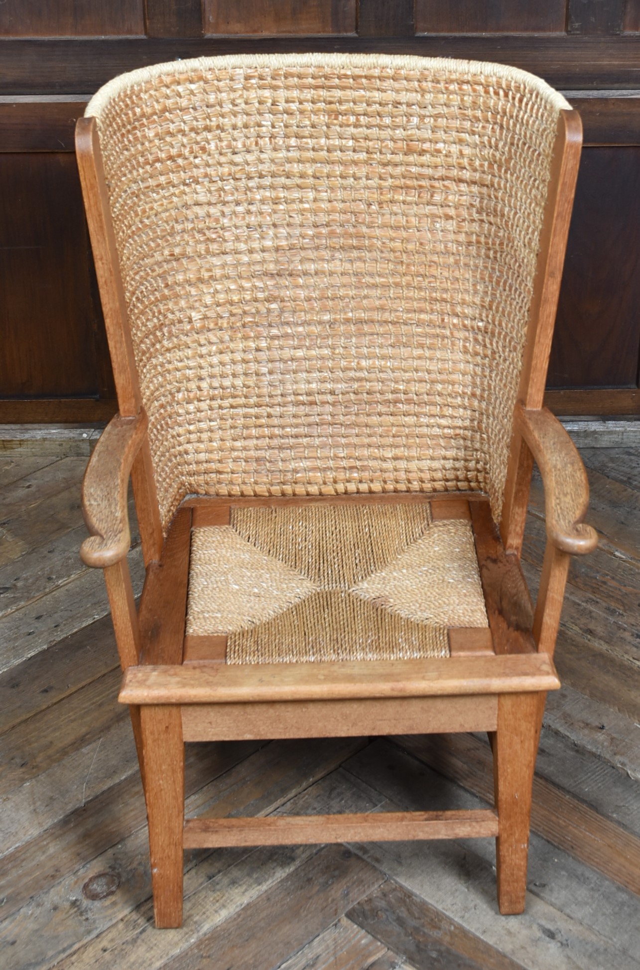 A charming and rare Edwardian child’s Orkney chair with a beautifully grained oak frame in a warm, honeyed tone. The hand-woven straw back is in superb condition, showcasing the traditional craftsmanship that defines Orkney furniture. Its drop-in rattan seat is equally pristine, offering both comfort and authenticity. The chair features two shaped arms with the classic Kirkness-style curve, supported by simple uprights. It stands on square tapering legs united by square stretchers, giving it a sturdy yet elegant silhouette. This decorative little chair is not only a delightful piece of Scottish heritage but will also make a striking accent in any home—whether placed in a hallway, bedroom, or as part of a curated collection.
