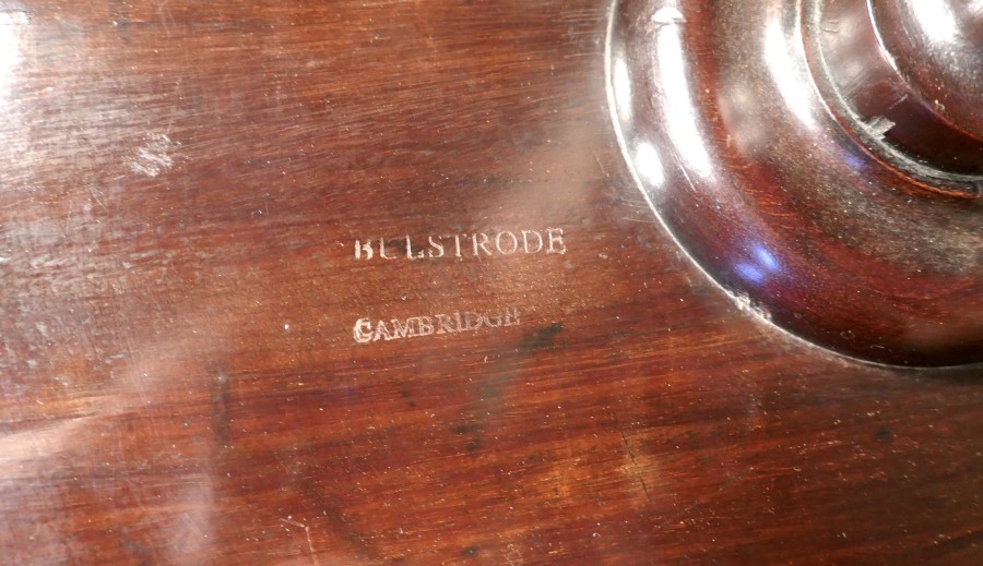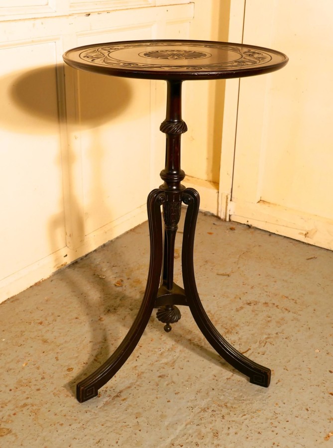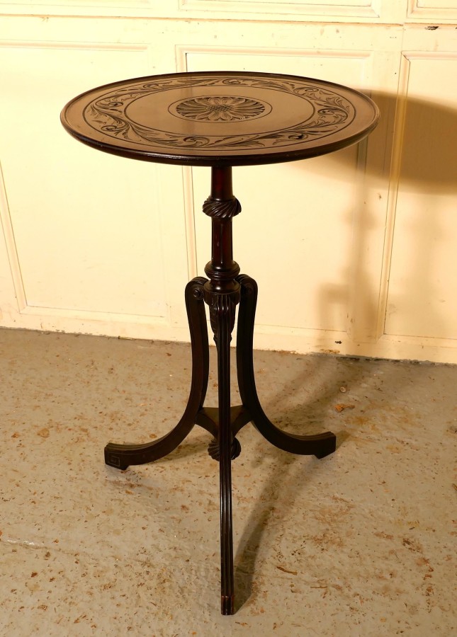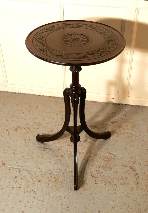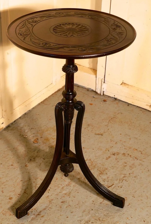 Decorative 2 tone Art Nouveau Wine Table by Bulstrode of Cambridge This lovely table stands on a very unusual three footed base it has an exquisitely turned centre column with the reeded splayed legs scrolling out from quite a high point The round top is made from a single piece of wood which has a raised edge and a wide carved border with a large sunflower at its centre A Fantastic looking piece and the finest quality and craftsman ship possible The table is in good condition it stands 29” high and it is 17” in diameter SH189 Manufacture Date : 1890 Materials : Walnut