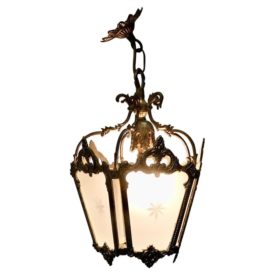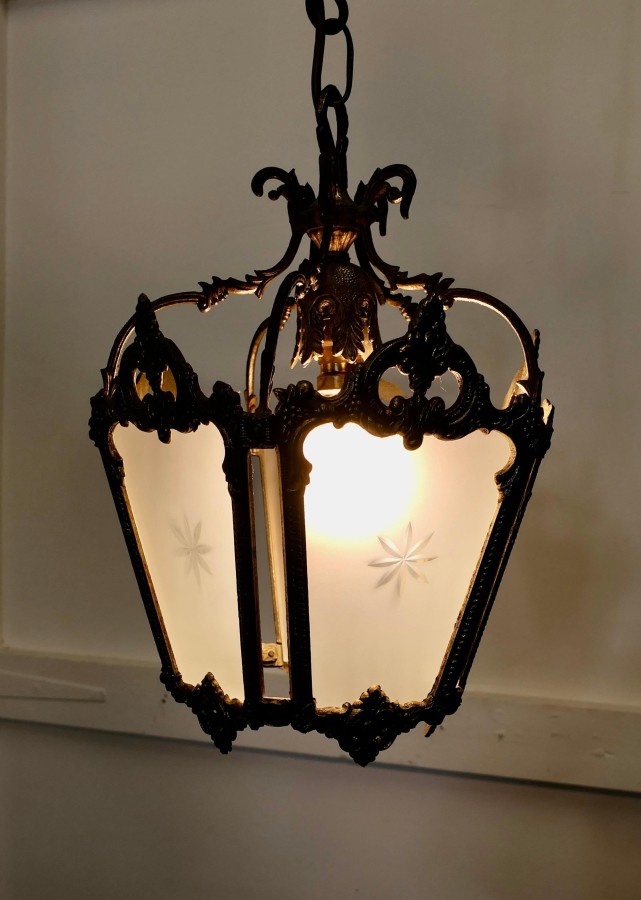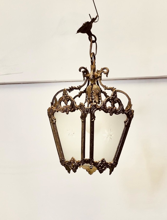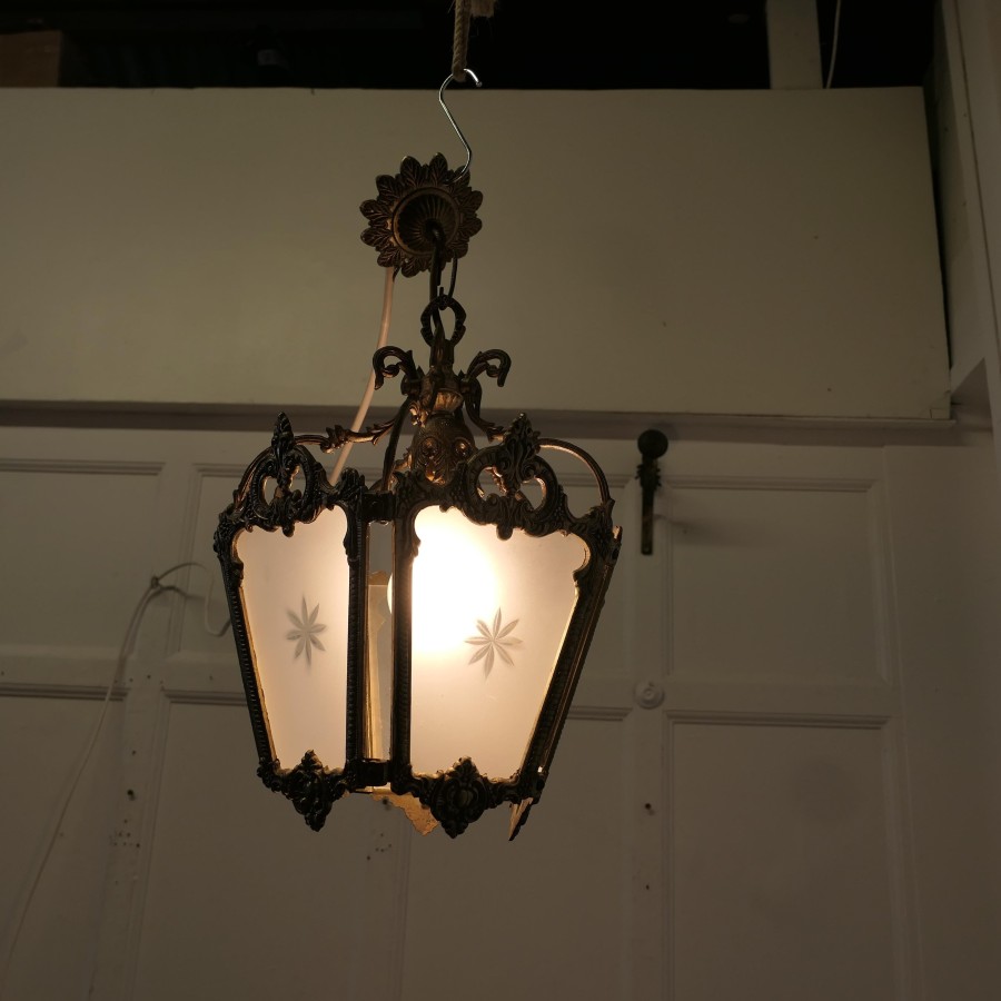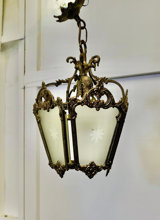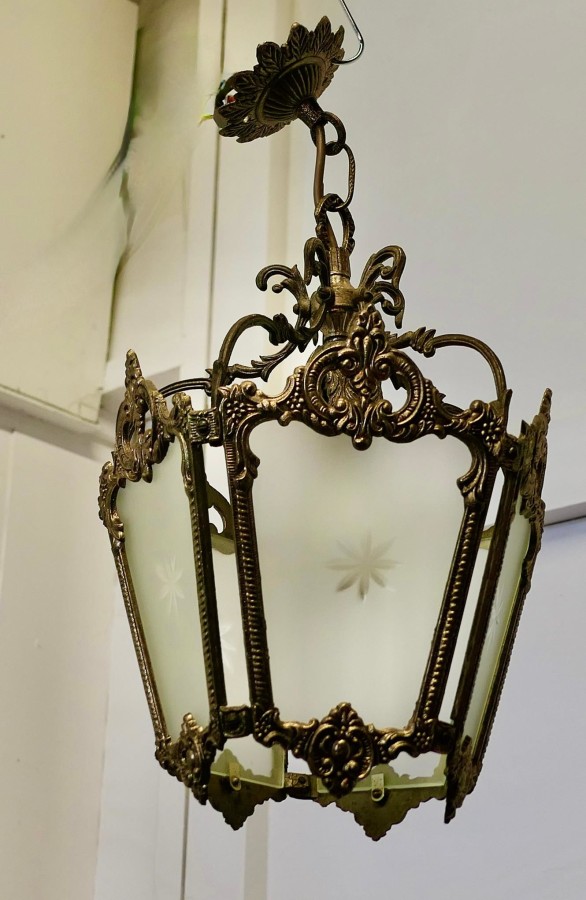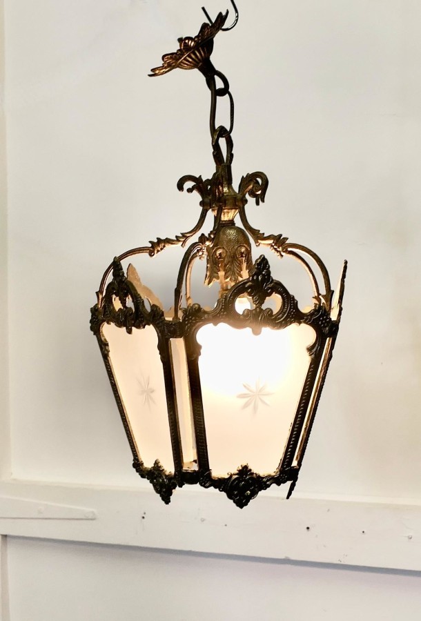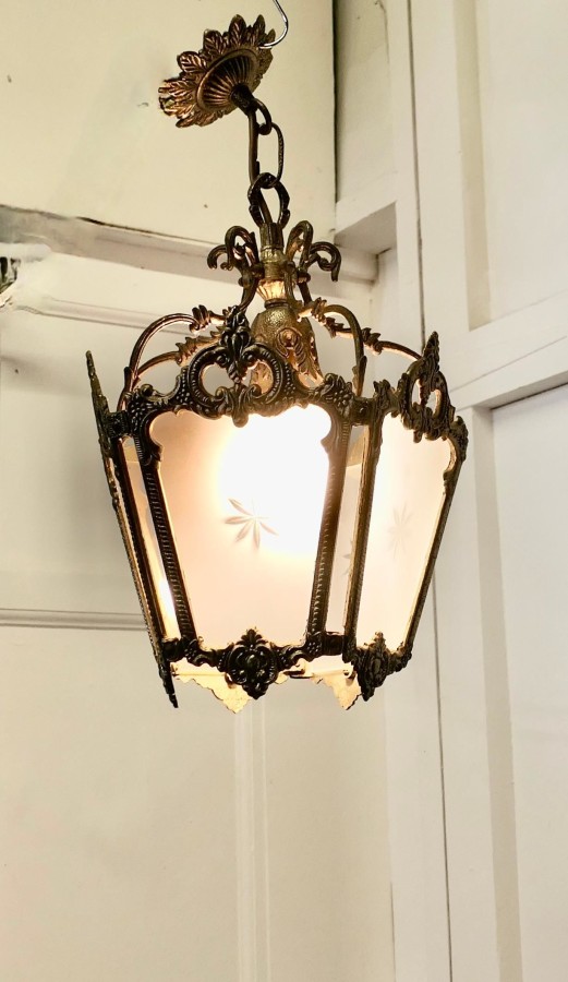 Decorative French Gilt Brass Lantern Pendant Light A superb quality brass lantern, the light has 6 glass panels each etched with a star at the centre. The Lamp is decorated in the French style with leaves and it hangs from a short chain on a brass ceiling rose The lantern gives a pleasant light when lit and is in good working condition and will need to be fitted to an electrical supply The Lantern is 18” high and 10” across VY172 Manufacture Date : 1920 Materials : Brass
