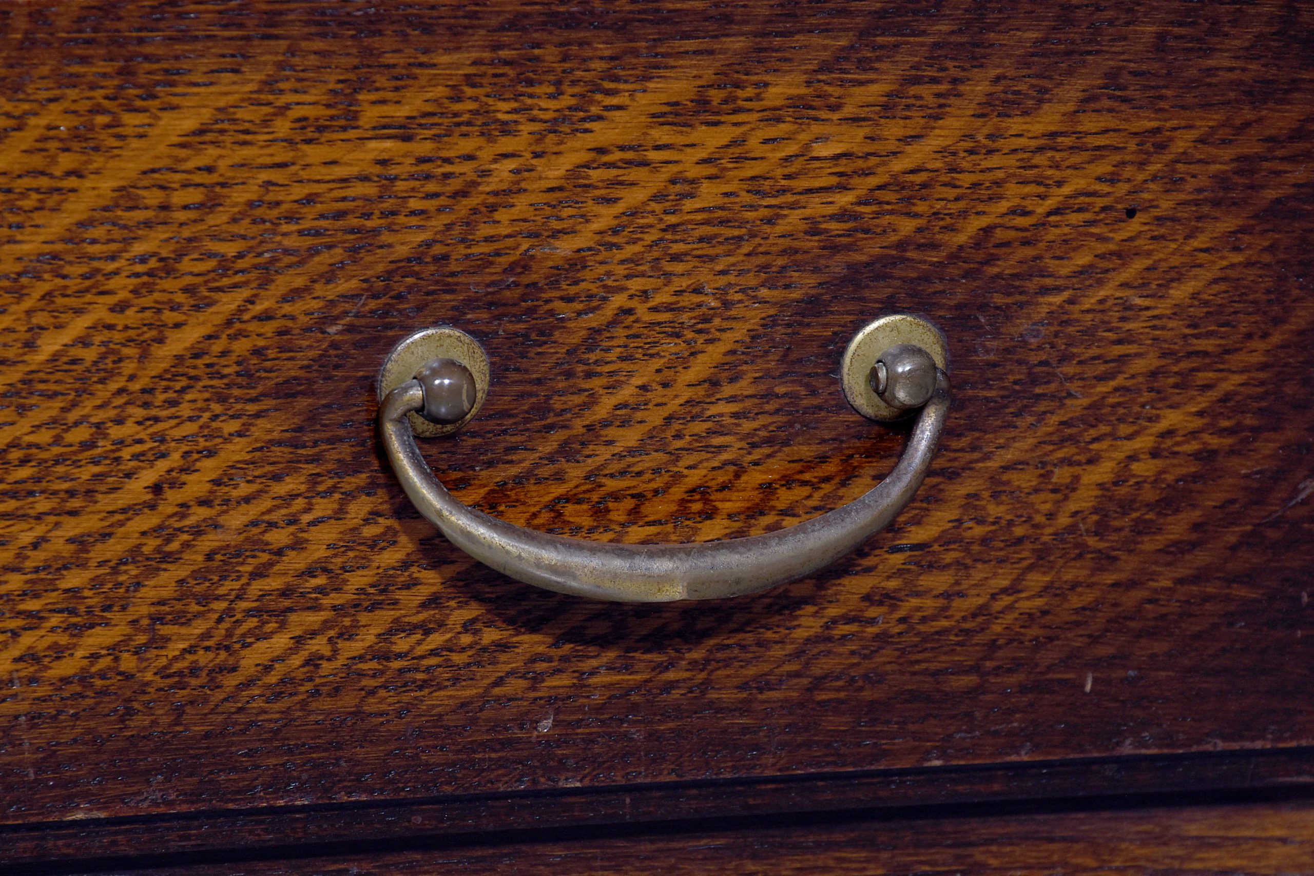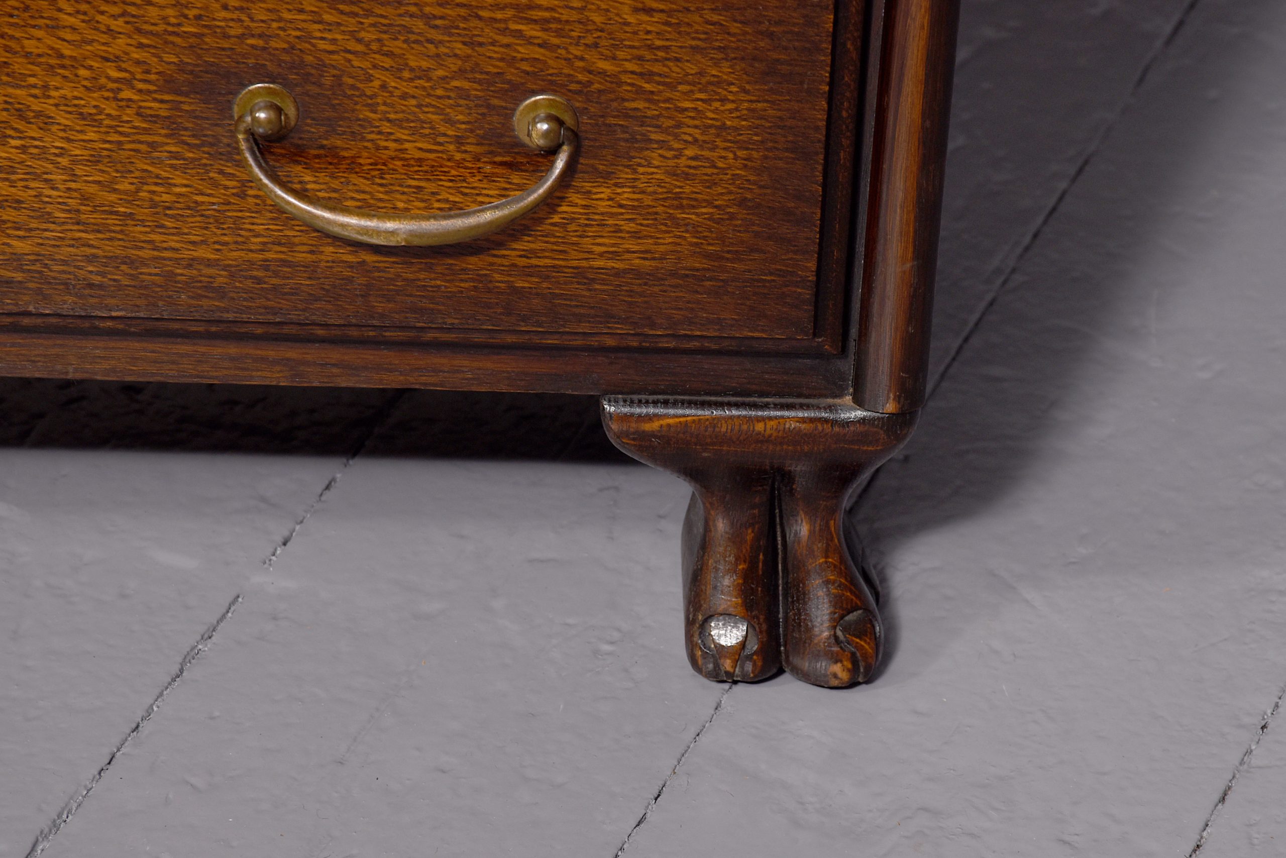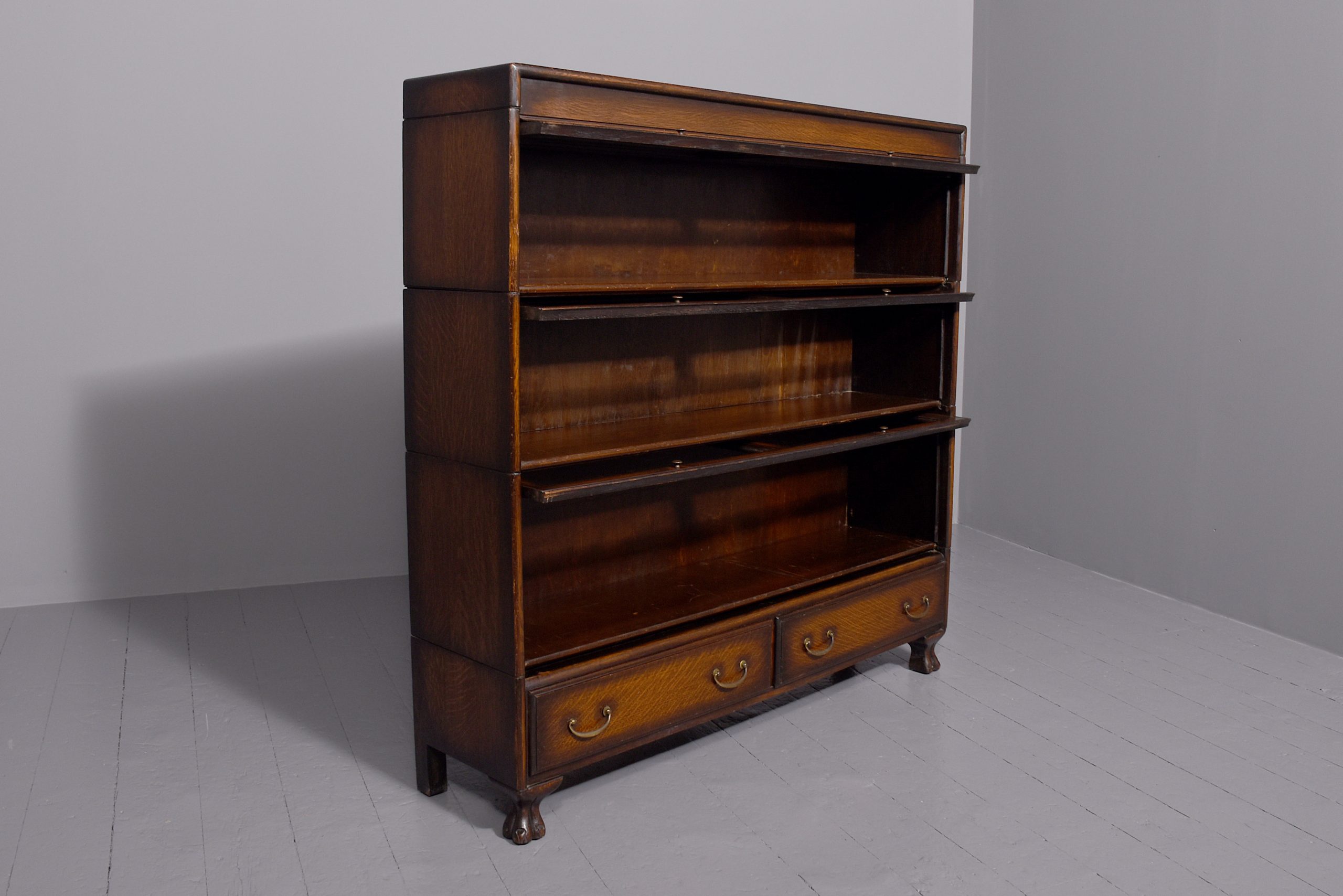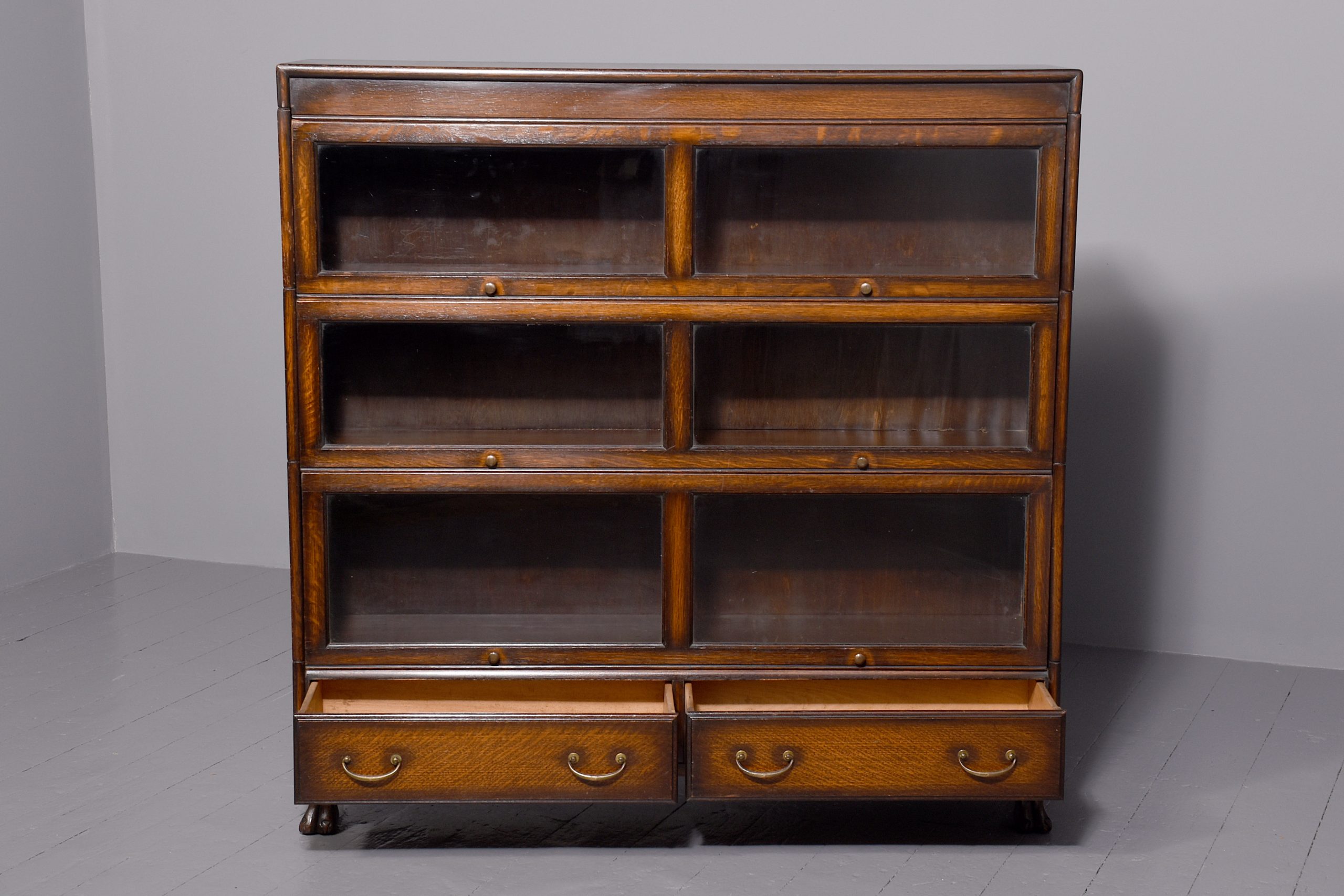 Circa 1900. A three-tier oak section bookcase, the polished top with a moulded fore-edge and simple frieze, the front with three pairs of double-glazed doors, each has a pair brass knob handle, beneath the bottom door is a pair of oak drawers each with cast brass D shaped handles, resting on square legs at the back and a ball and claw foot at the front, comes in 5 sections.