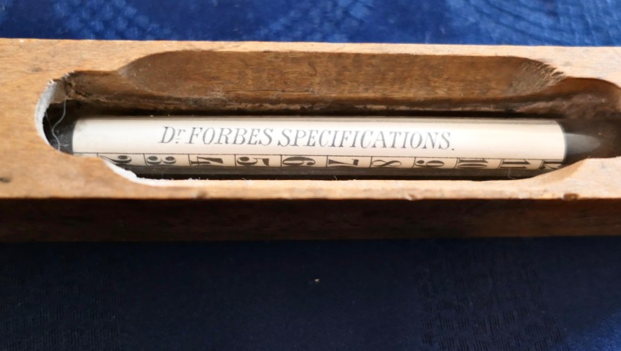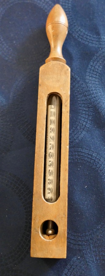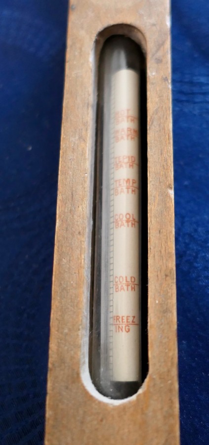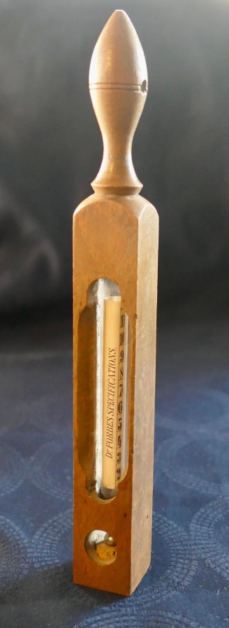 Dr Forbes Specifications Bath Thermometer A great piece, the thermometer has a beech Case so that it can be floated to show the numerical temperature and also the recommended from “ Freezing” through to “HOT” in red print The Thermometer is in good sound condition The thermometer is 10” long and 1.25” square SW120 Manufacture Date : 1900 Materials : Beech