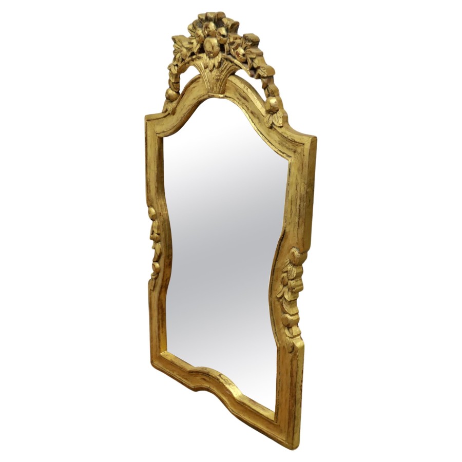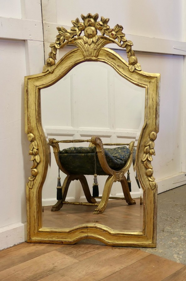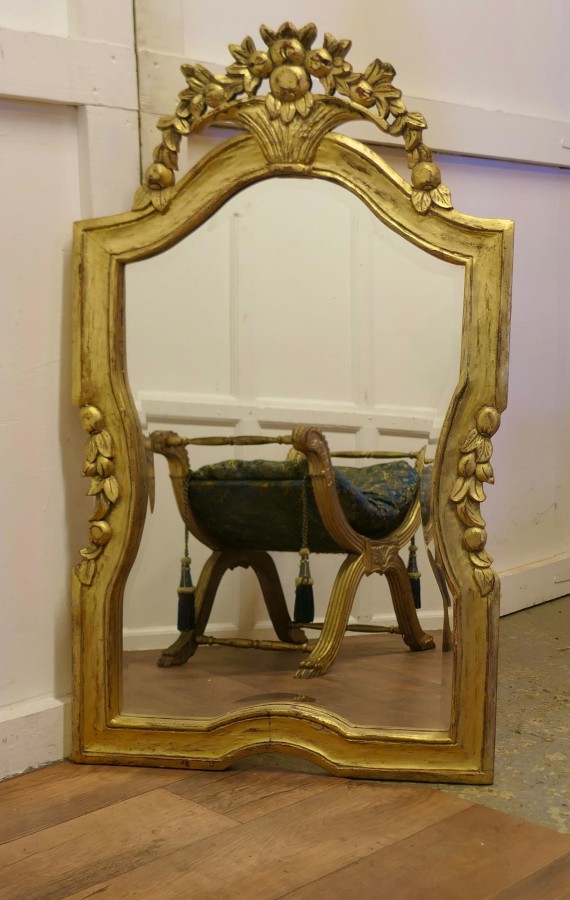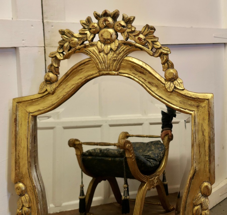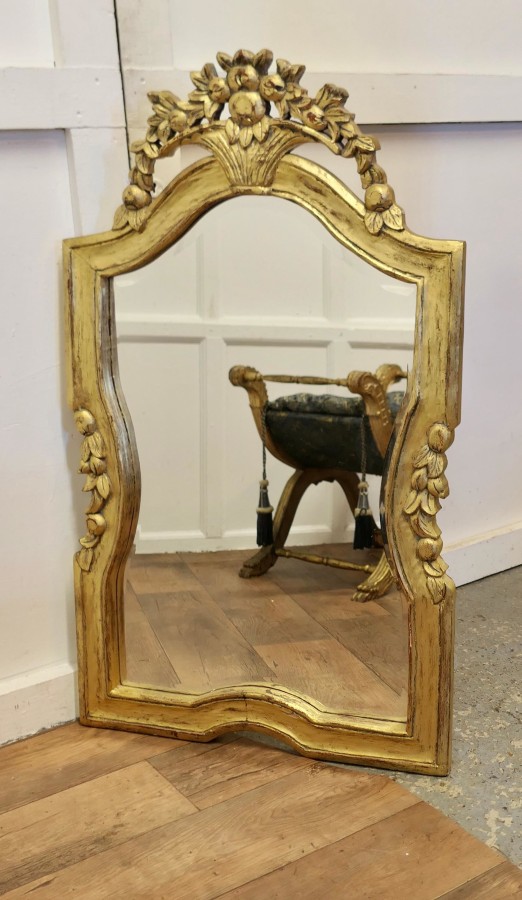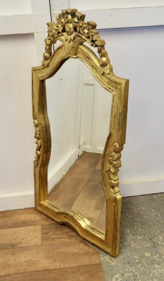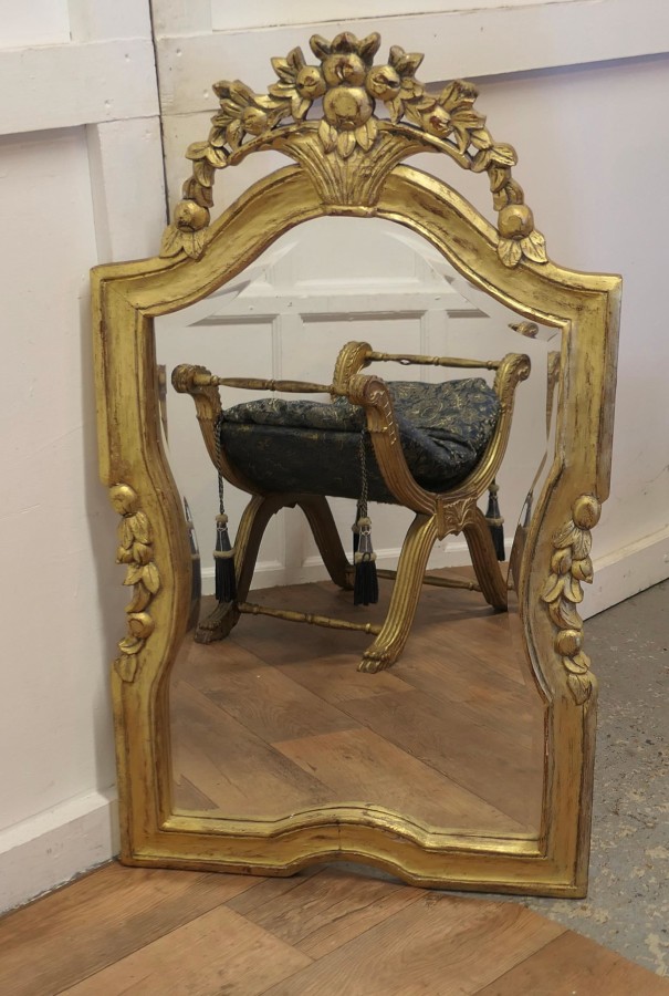 Dramatic Gilt-wood French Wall Mirror The Mirror has a simple carved gilt Frame set with a basket of flowers at the top and at he waist of the unusual shape, the original glass is bevelled All in good antique condition The mirror is 27” wide and 46” tall CS26 Manufacture Date : 19th century Materials : Giltwood