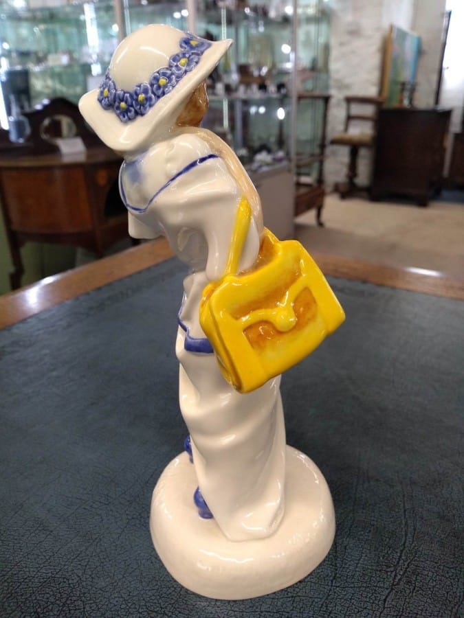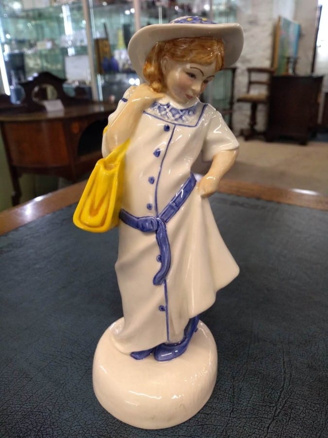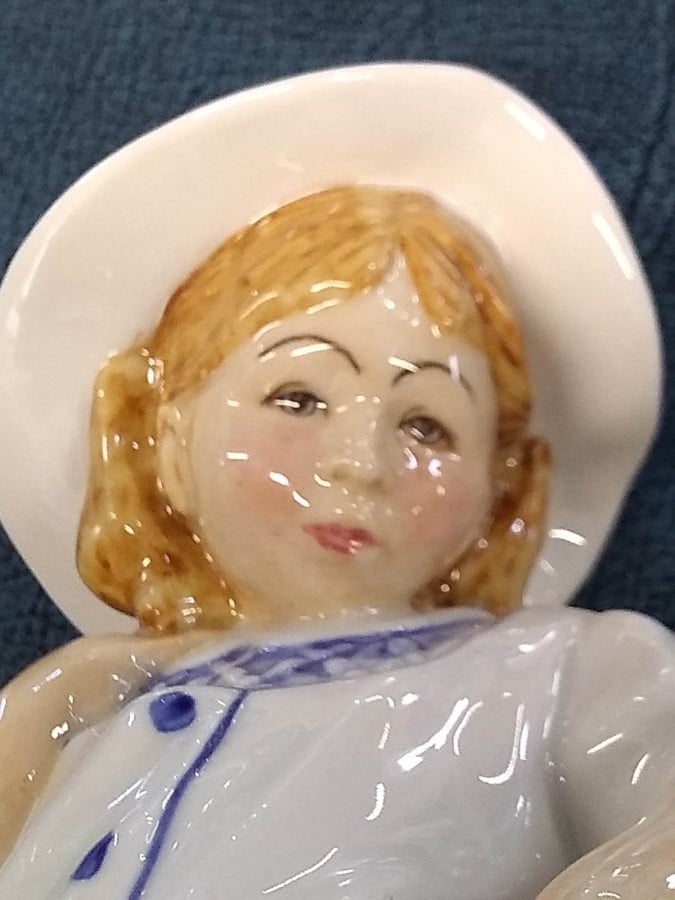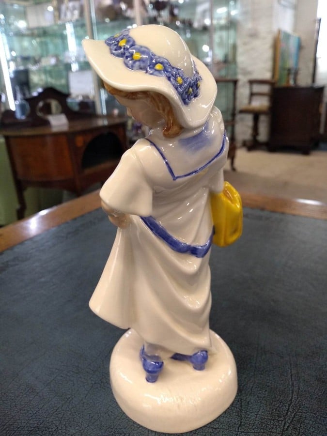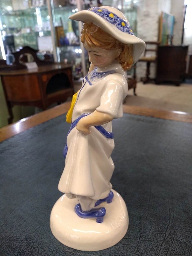 A Royal Doulton figure of a child ‘Dressing Up’ in bright white, yellow and blue colours. Hand made and hand decorated. Signed Kgb, number H. N 2964. Dated 1981