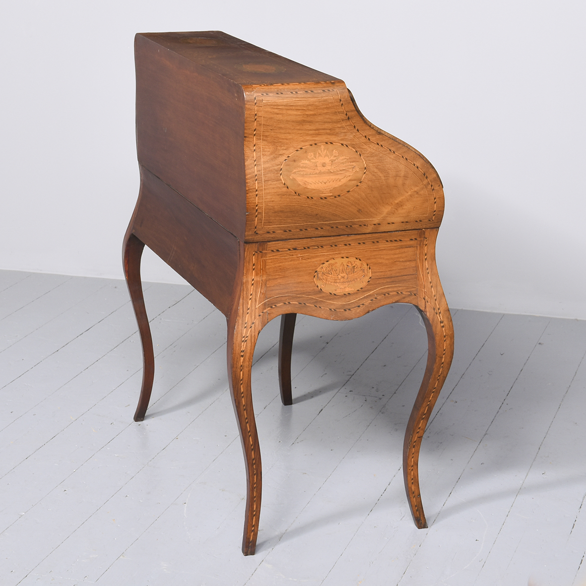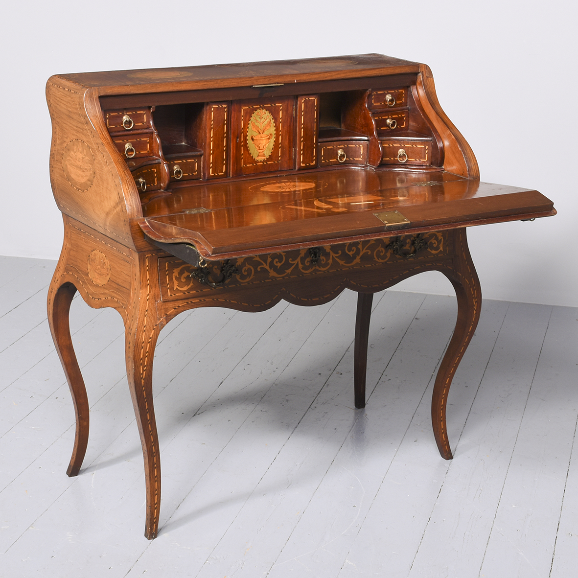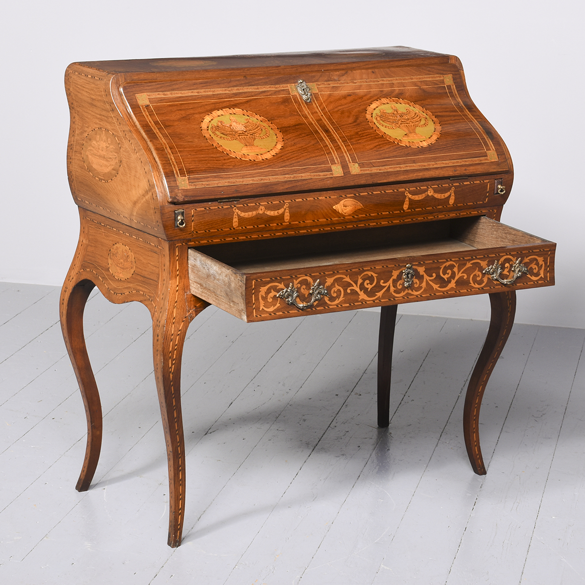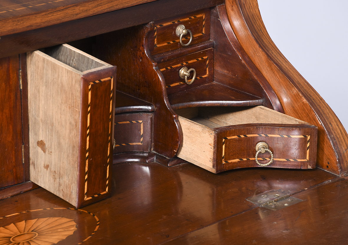 Circa 1830. An interesting Dutch walnut and marquetry bombe shaped bureau. The top with two large inlaid panels with shells, chequered and boxwood inlay. The serpentine flap with further inlaid panels with classical urns, with a well fitted interior with a pictorial panel on the writing surface, further shell inlay and a combination of serpentine inlaid shaped drawers, pigeon holes and inlaid door. The loppers which hold the flap in place are shaped to accommodate the bombe shaped flap. A full-length drawer (oak lined) with a flared inlaid frieze beneath, which continues around the sides, which have inlaid panels, all resting on four elegant cabriole legs with chequered inlay running down each of the facings.