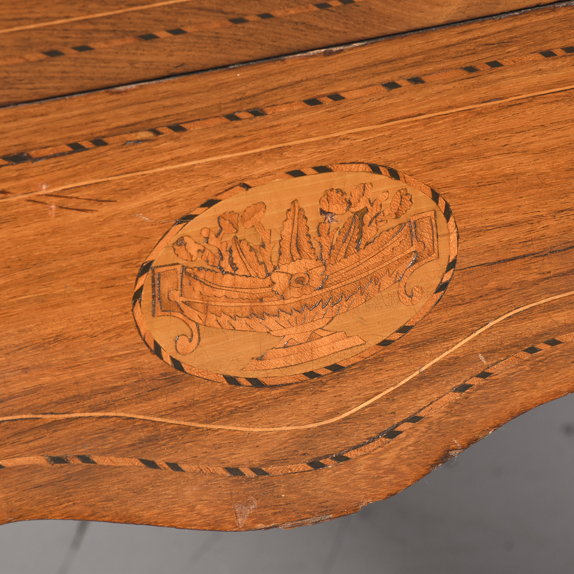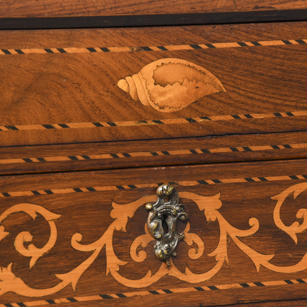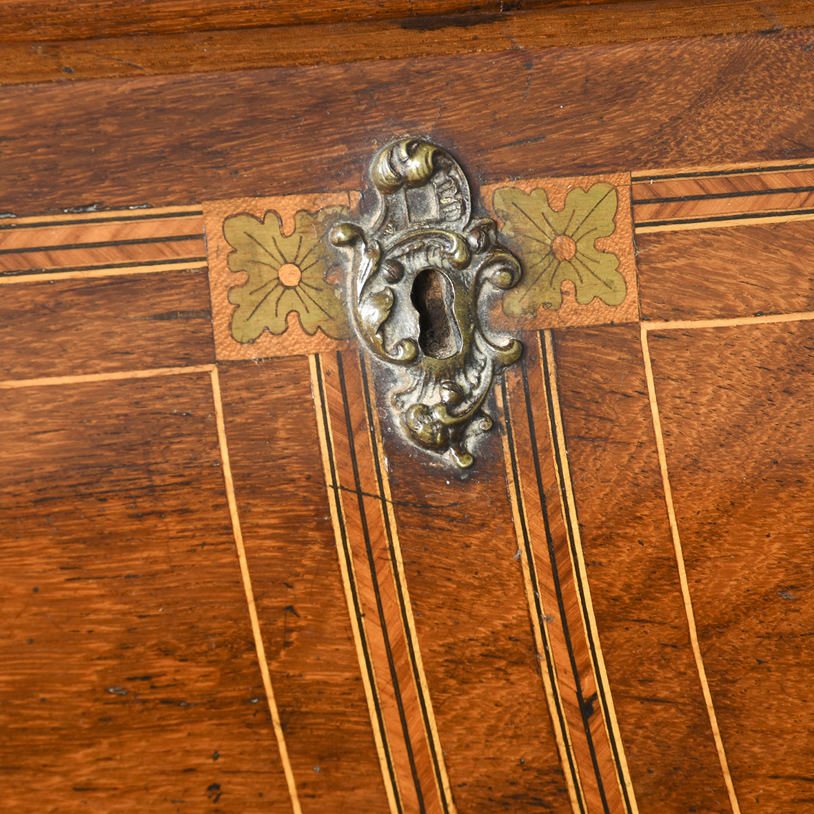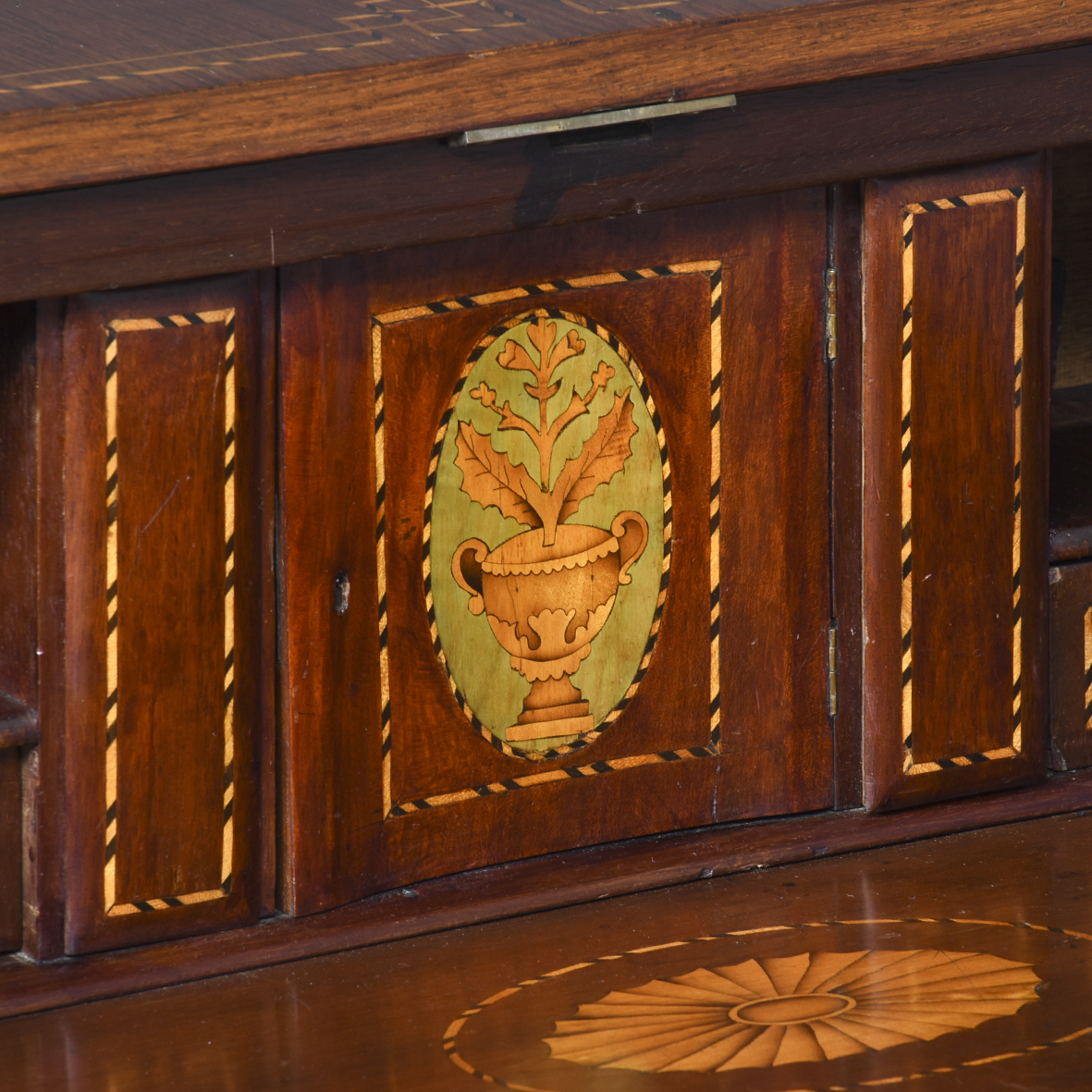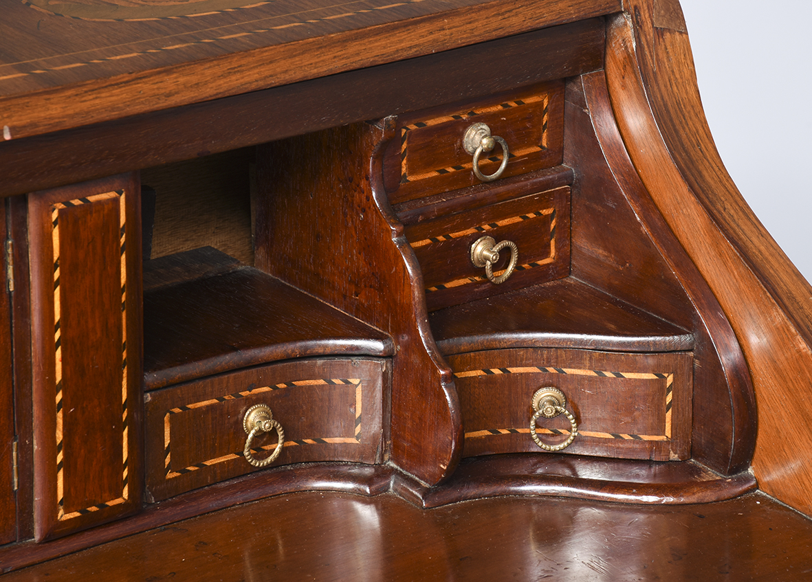 Circa 1830. An interesting Dutch walnut and marquetry bombe shaped bureau. The top with two large inlaid panels with shells, chequered and boxwood inlay. The serpentine flap with further inlaid panels with classical urns, with a well fitted interior with a pictorial panel on the writing surface, further shell inlay and a combination of serpentine inlaid shaped drawers, pigeon holes and inlaid door. The loppers which hold the flap in place are shaped to accommodate the bombe shaped flap. A full-length drawer (oak lined) with a flared inlaid frieze beneath, which continues around the sides, which have inlaid panels, all resting on four elegant cabriole legs with chequered inlay running down each of the facings.