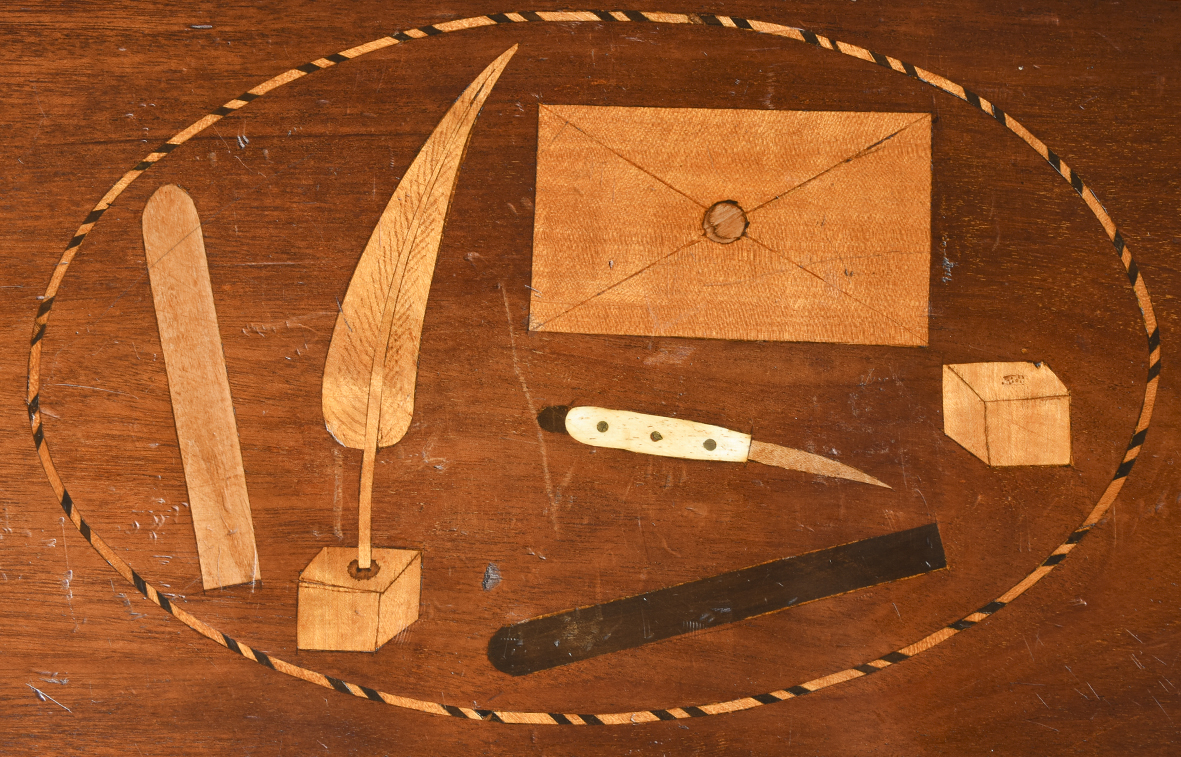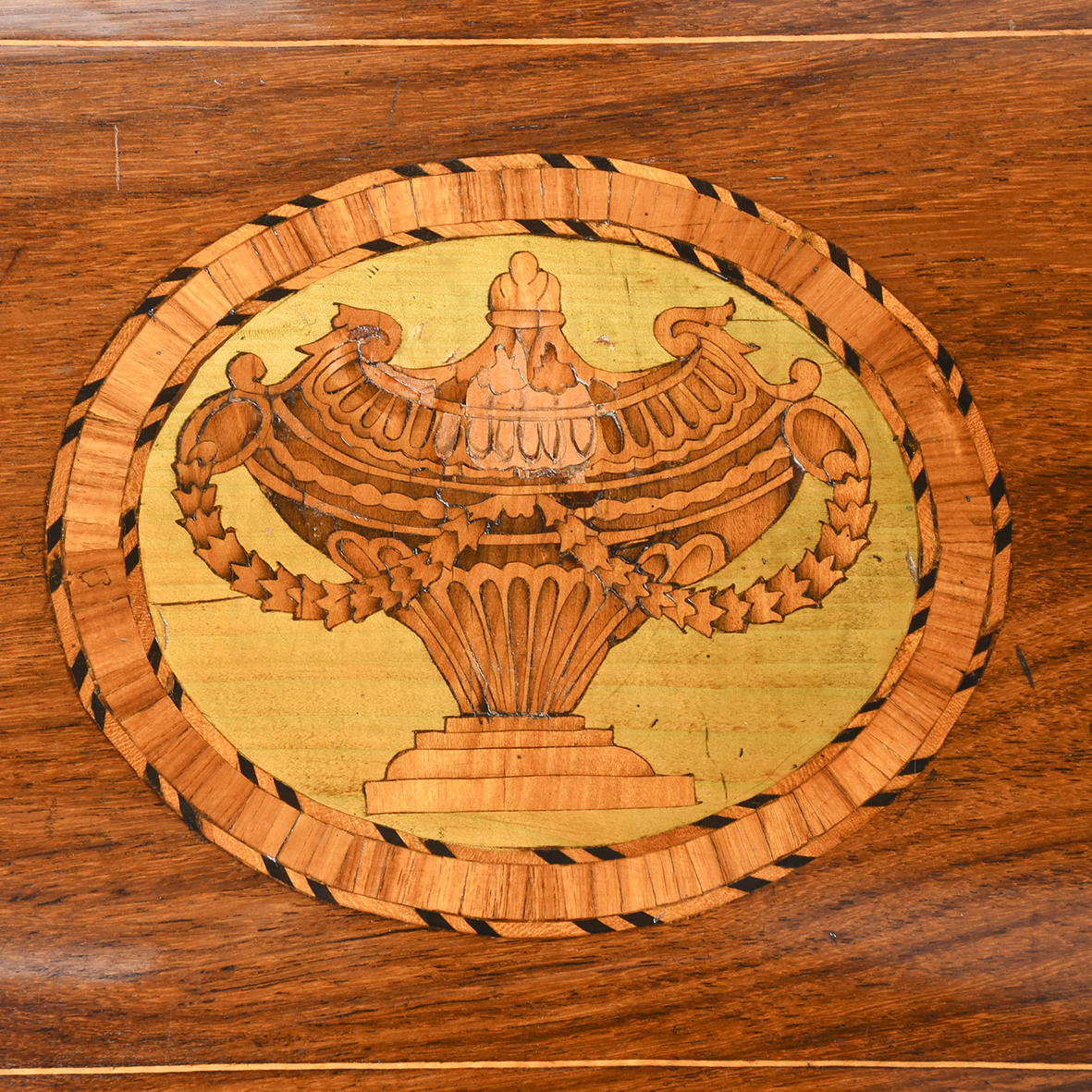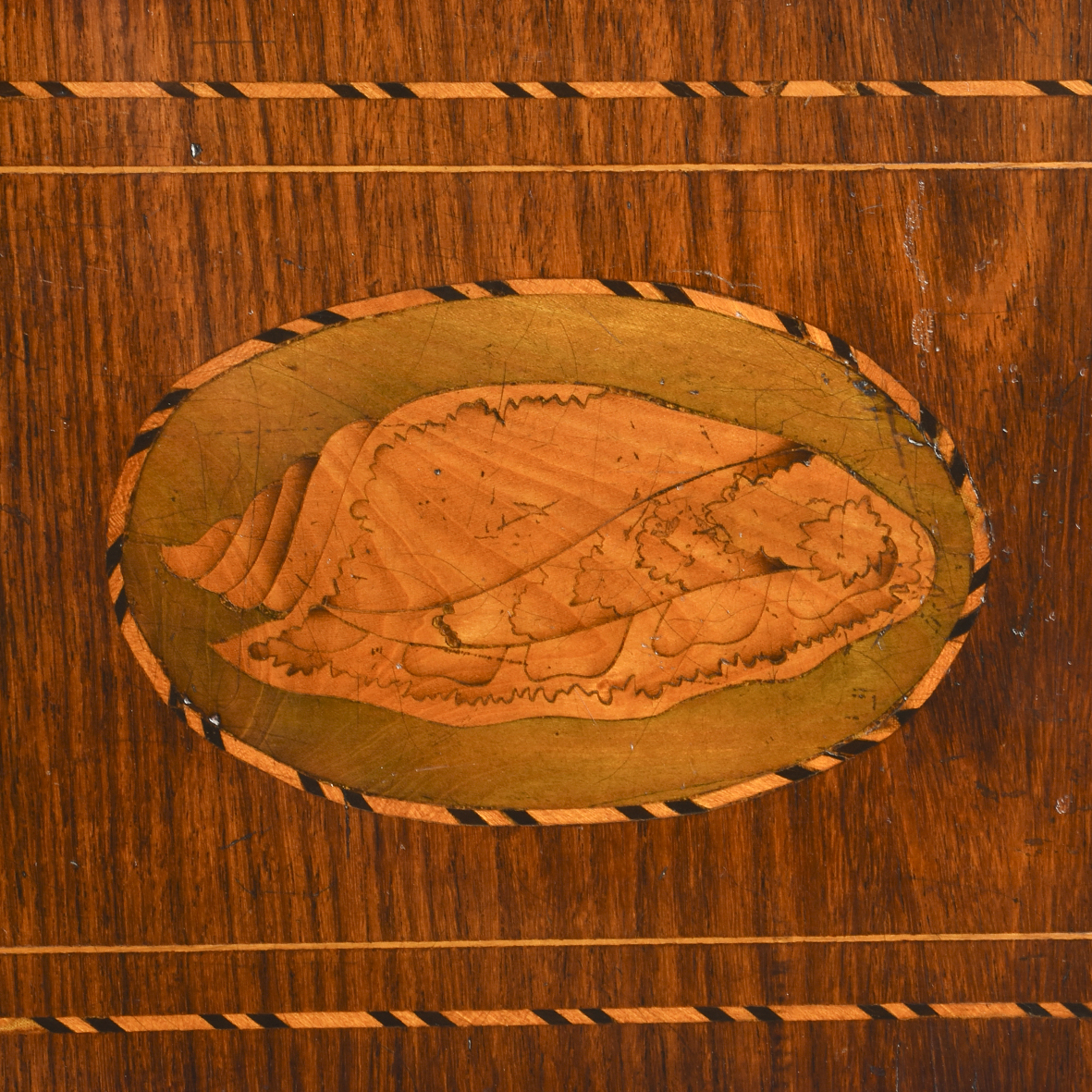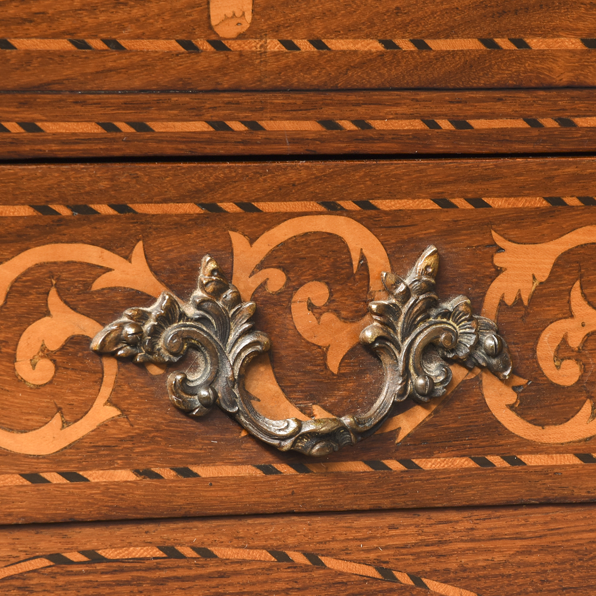 Circa 1830. An interesting Dutch walnut and marquetry bombe shaped bureau. The top with two large inlaid panels with shells, chequered and boxwood inlay. The serpentine flap with further inlaid panels with classical urns, with a well fitted interior with a pictorial panel on the writing surface, further shell inlay and a combination of serpentine inlaid shaped drawers, pigeon holes and inlaid door. The loppers which hold the flap in place are shaped to accommodate the bombe shaped flap. A full-length drawer (oak lined) with a flared inlaid frieze beneath, which continues around the sides, which have inlaid panels, all resting on four elegant cabriole legs with chequered inlay running down each of the facings.
