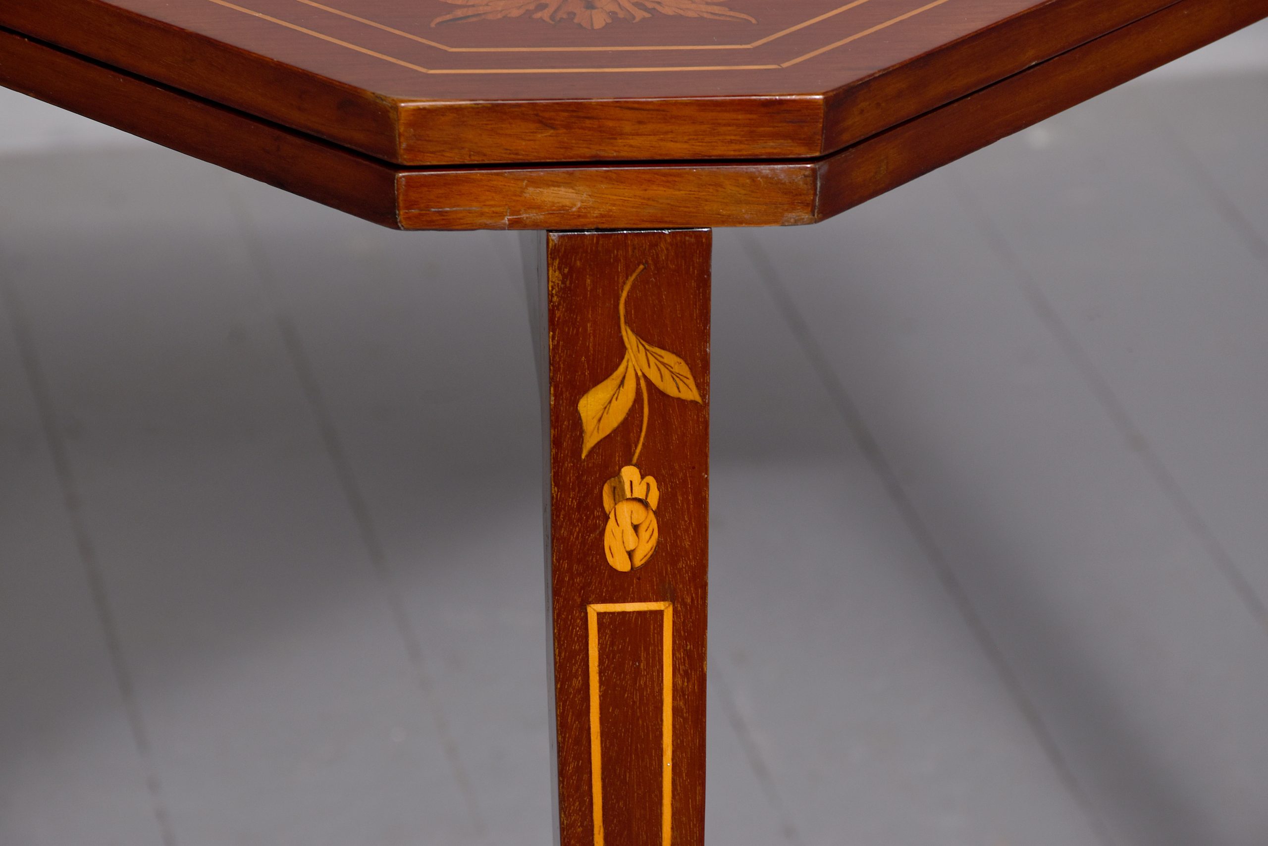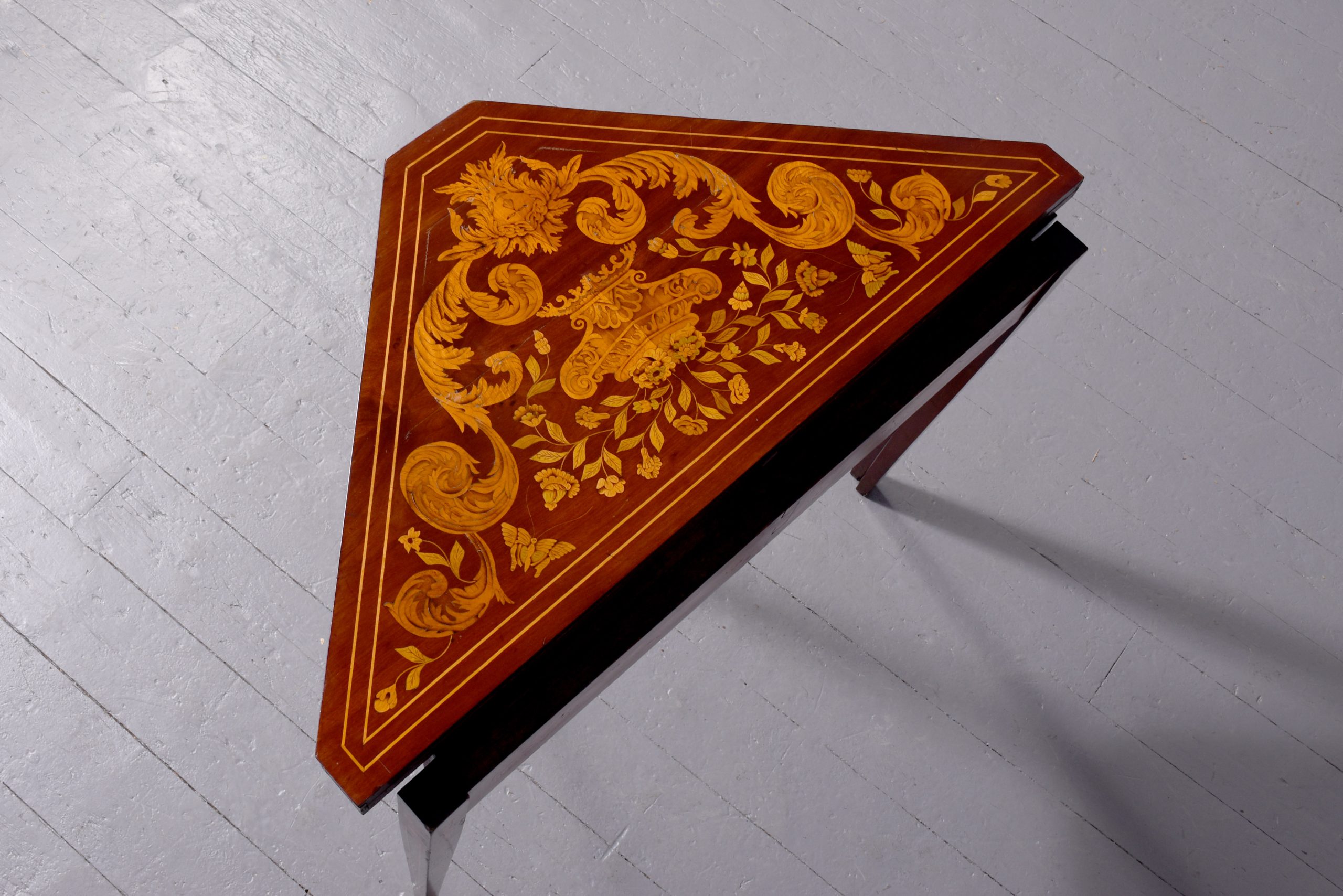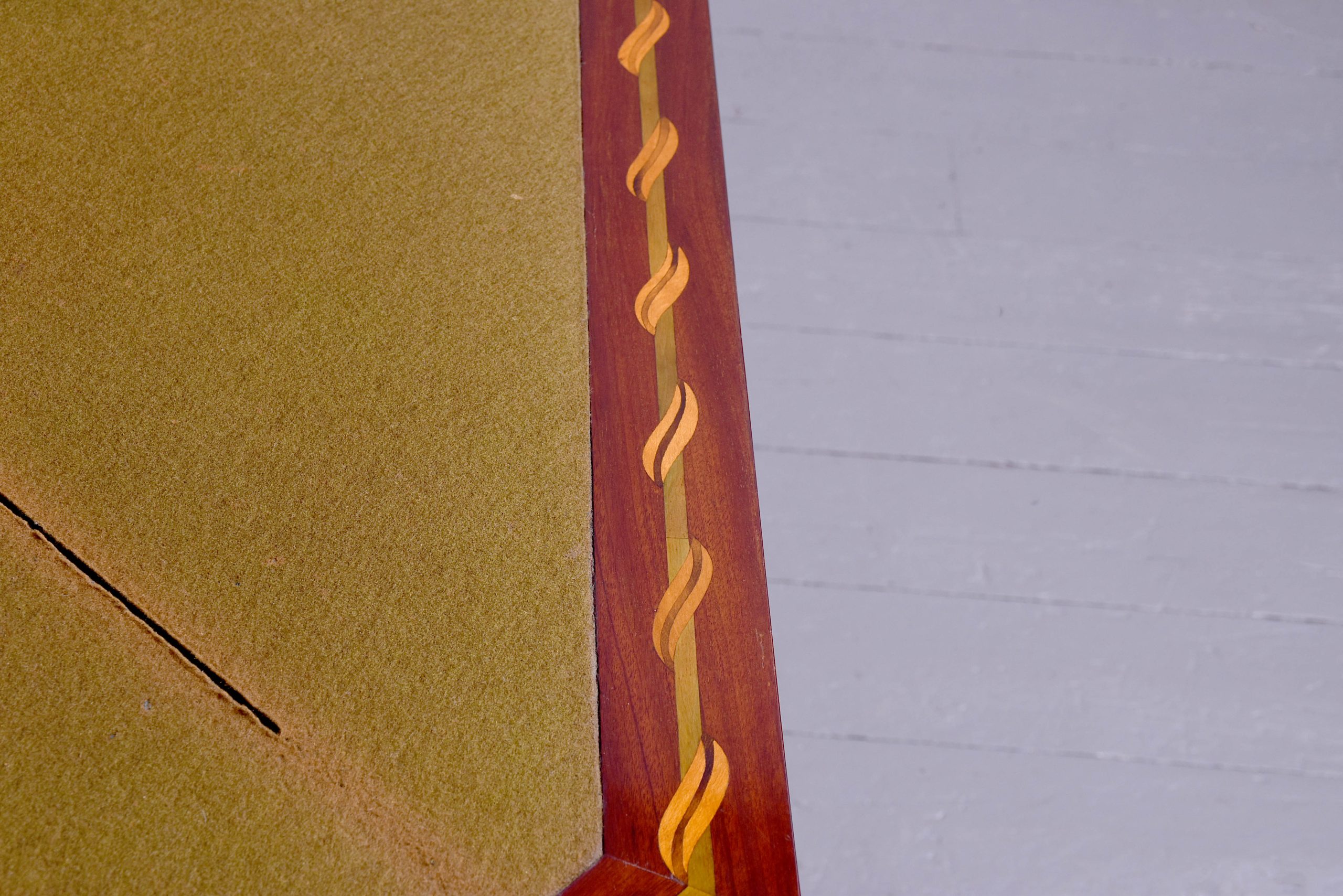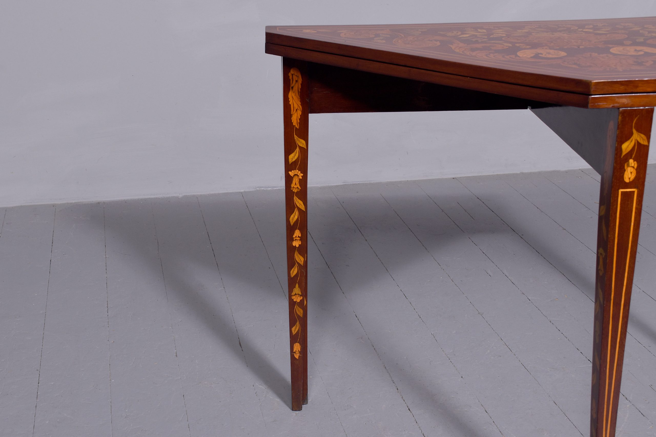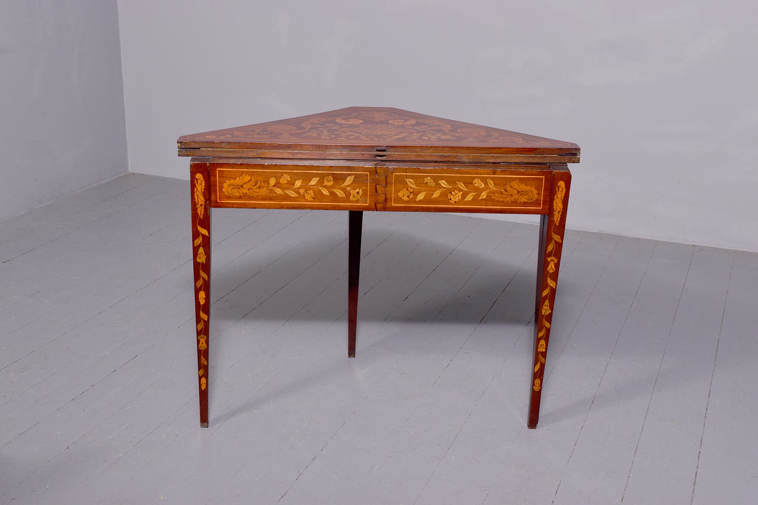 Circa 1820. An unusual interesting and stylish Dutch triangular shaped fold over card table, the top with canted corners, smothered in marquetry framed with double satinwood banding, the hinged top opens to reveal a green baize lined interior, inlaid with green wood and entwined with foliate inlay, resting on four square tapering legs which are smothered in marquetry as are the two hinged back rails which swing out to support the top when open. The interesting thing is the table can be folded down flat when not being used.