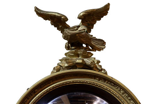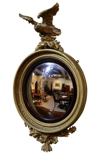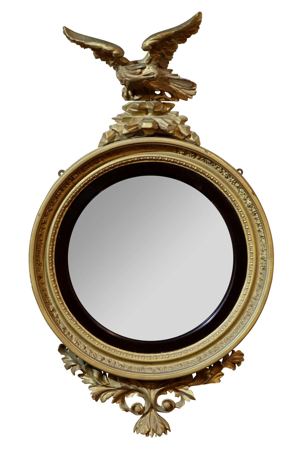 The mirror is set within a giltwood frame with a moulded surround and ebonised slip, retaining its original convex plate which provides a wonderfully atmospheric reflection. The frame is surmounted by a well-carved and expressive spread-wing eagle perched upon a rocky outcrop, a classic motif of the Regency period symbolising strength and vigilance.