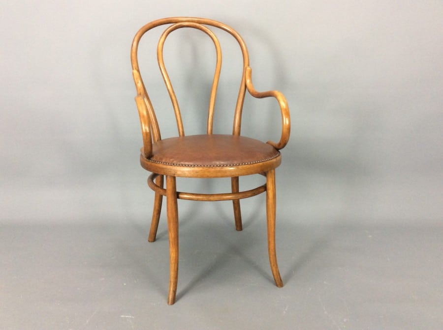 Thonet bentwood armchair/desk chair No 18 by Michael Thonet, early 20th century and manufactured in Austria. Made of beech having a backrest of a larger curved outer hoop, with a smaller curved inner hoop converging at the top and connects at the bottom to the circular seat. The original seat was rattan, but at some point in its life the chair has had a padded seat fitted. Newly upholstered with antique leather.