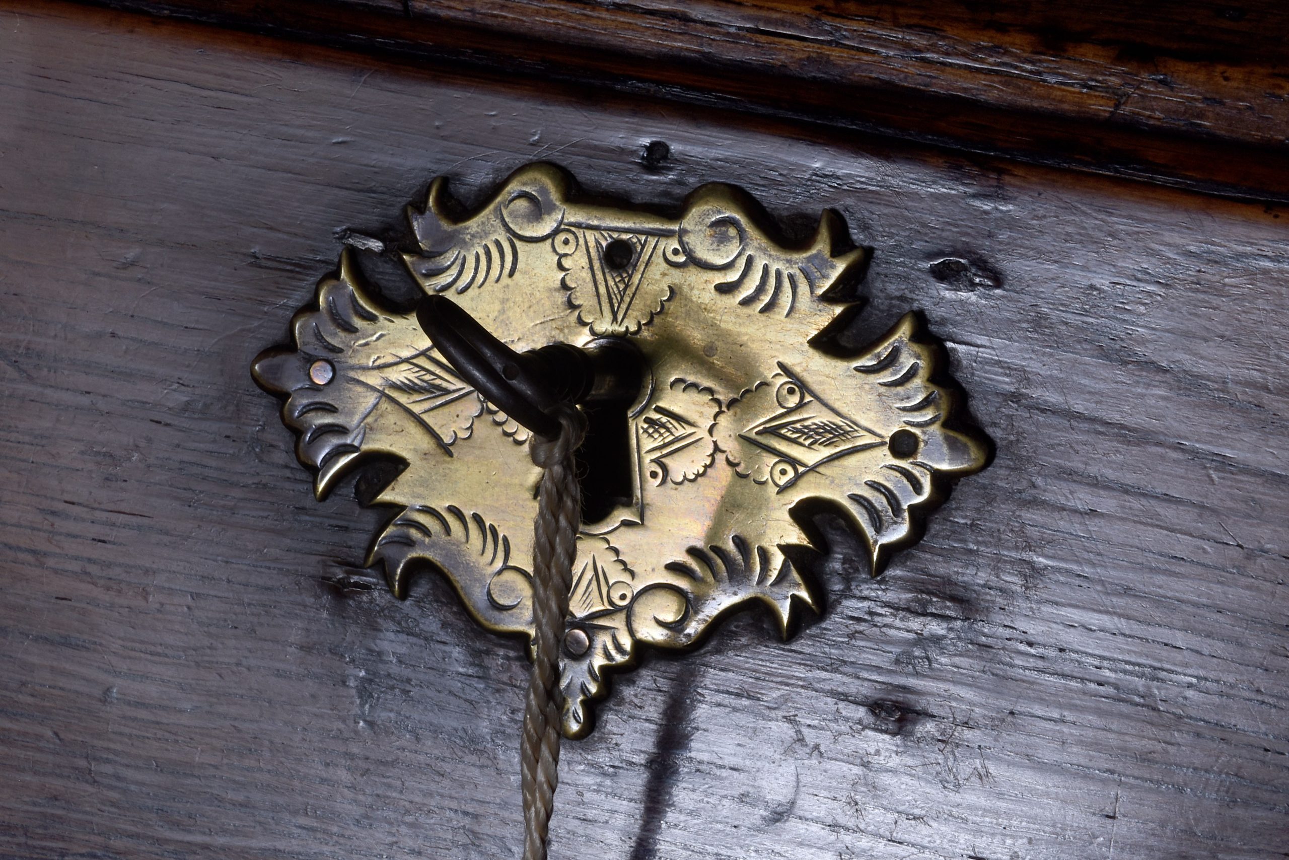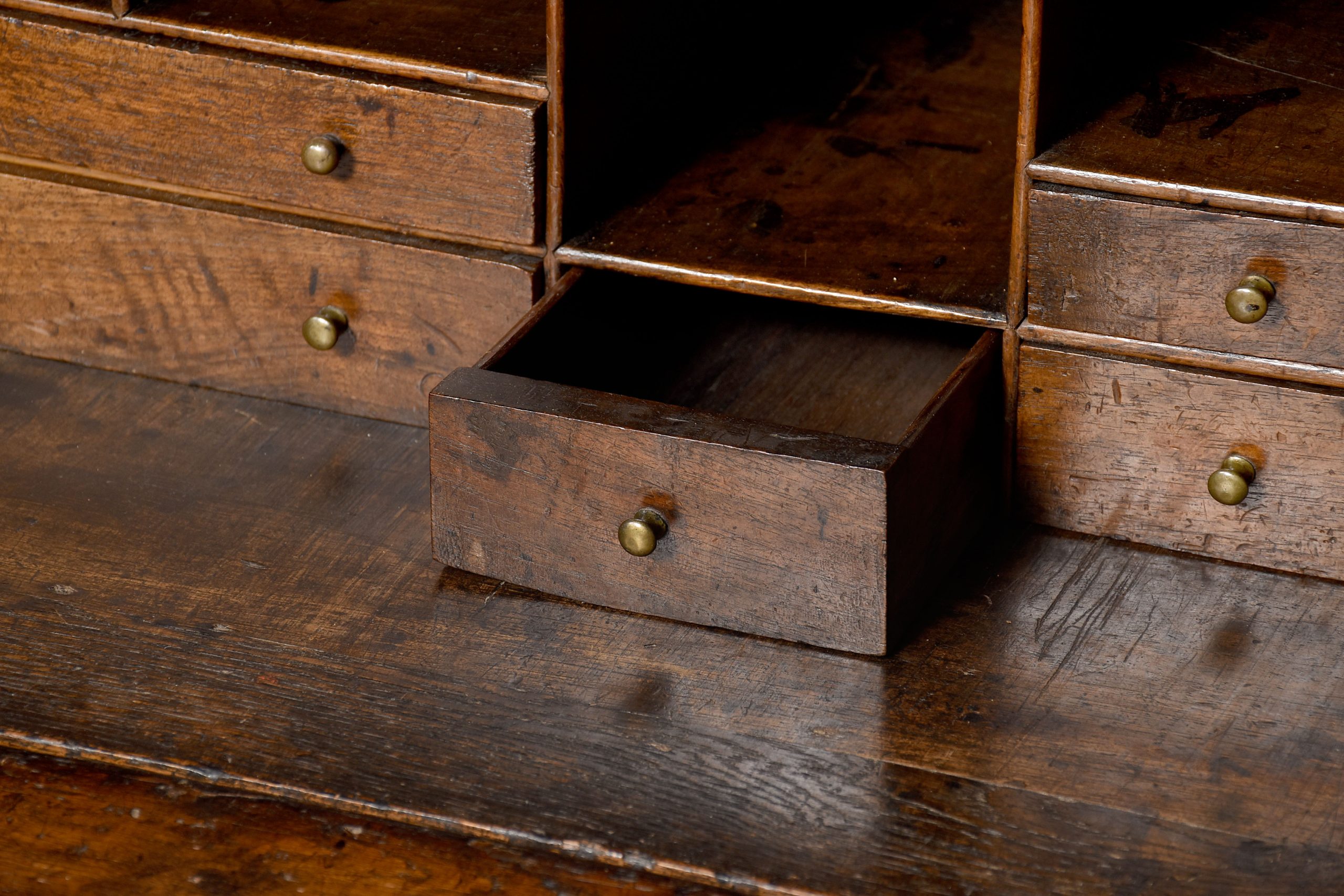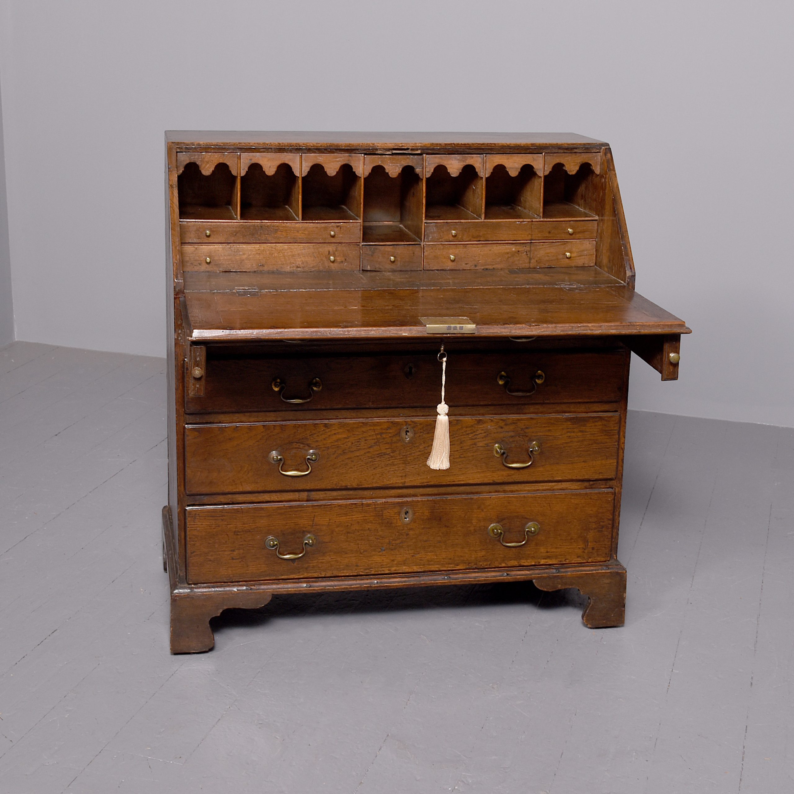 Circa 1860, an early George III oak bureau of desirable proportions, the flap with a very elegant engraved escutcheon, inside is well appointed, with wavy arches, three which are disguise drawers, various pigeonholes and drawers of various lengths, and a solid oak writing surface, beneath the flap left and right is a pair of lopers and four graduating drawers, each with oval escutcheons and swan neck cast brass handles with oval back plates, all resting on bracket feet.