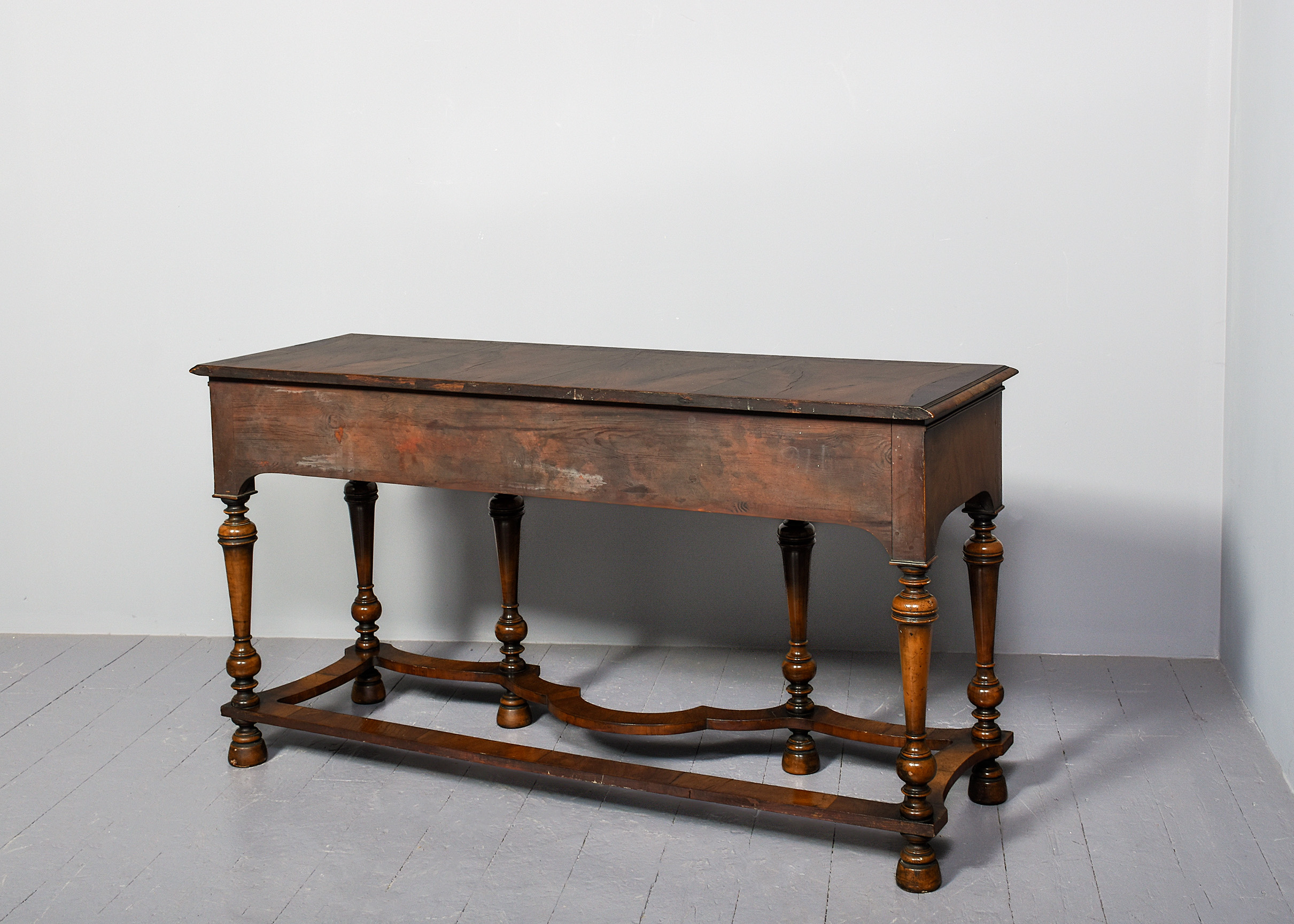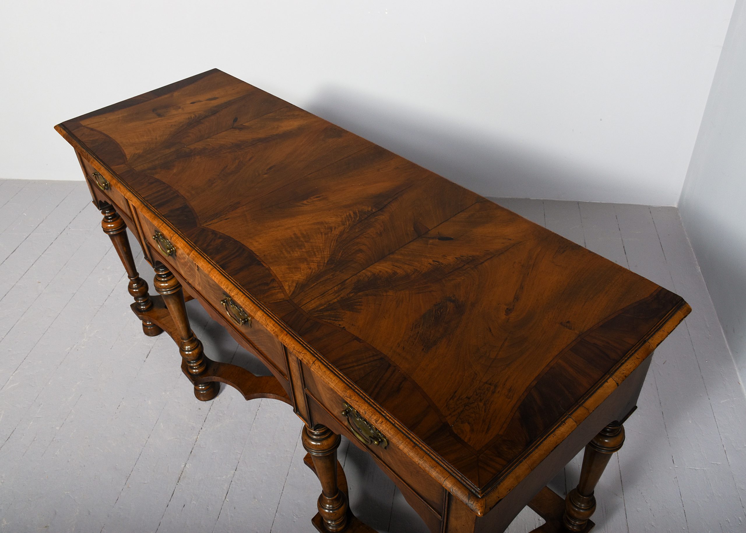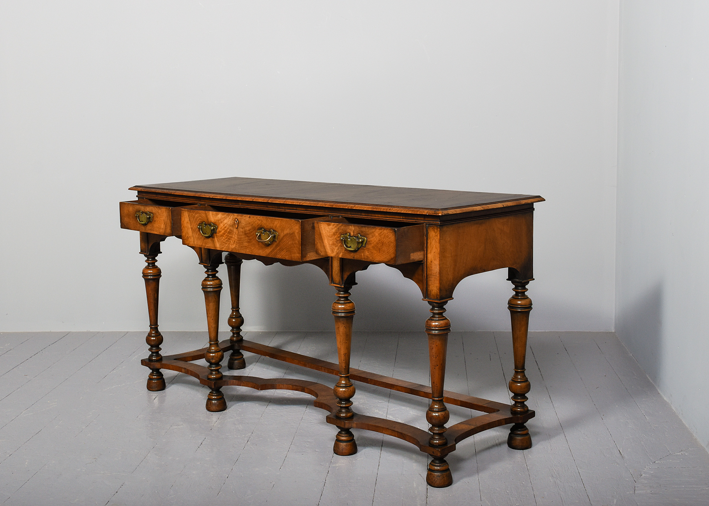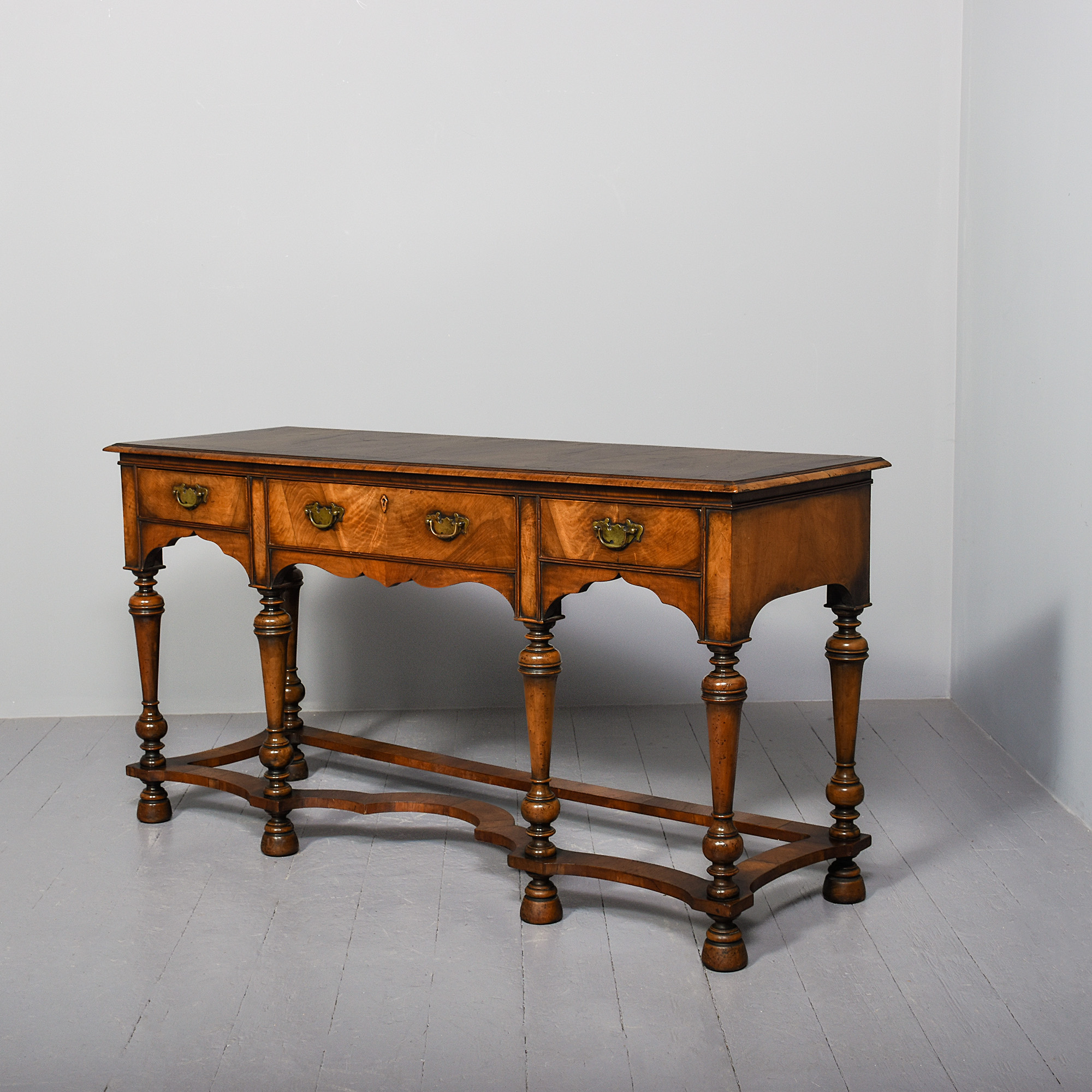 Circa 1900. Early Georgian-style figured walnut hall or side table. The rectangular top with sections of highly figured walnut contained within shaped crossbanding and inlay, all with a lovely colour and patina. The three frieze drawers with solid oak drawer linings and engraved cut brass handles and all supported on tapered ring turned baluster legs with shaped crinoline stretchers above tapering bun feet.