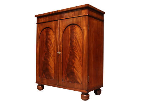 A fine early Victorian flame mahogany chiffonier dating from circa 1860. The well-figured flame mahogany doors are beautifully bookmatched and framed with gently arched panels, showcasing the rich colour and grain for which this period is admired.