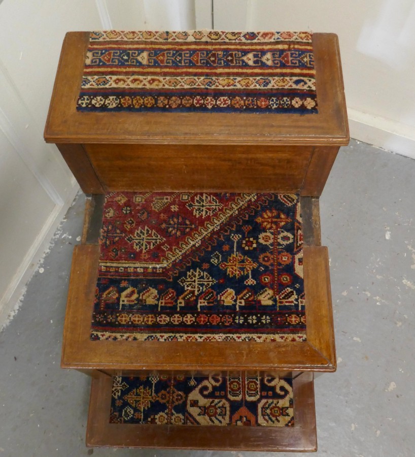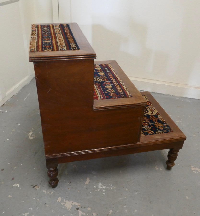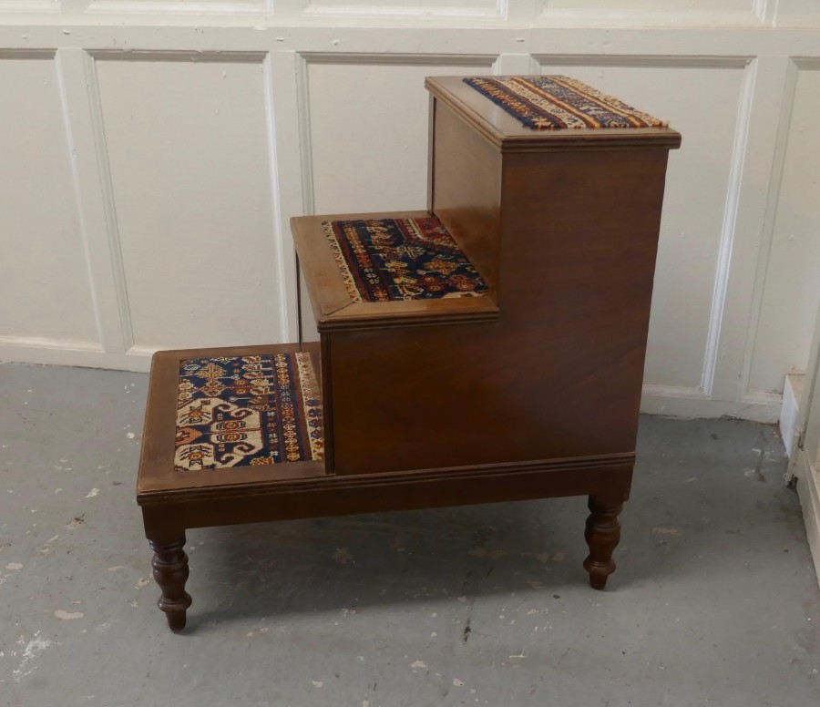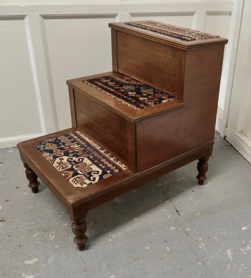 Early Victorian Library Steps on Turned Legs A great set of Early Victorian Library steps This set of steps is in good condition, the top step and the middle step have hinged lids. The centre step slides out so that and can be used for storage The upper surfaces of the steps are upholstered in antique carpet An attractive and rare piece, the step is 27” high, 20” wide and 30” deep AC60. Manufacture Date : 1850 Materials : Mahogany