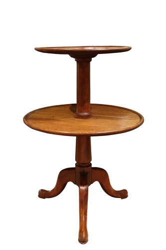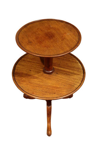 The piece features two circular revolving tiers, raised on a turned central column and supported by a classic tripod base with shaped legs, offering both stability and elegance.