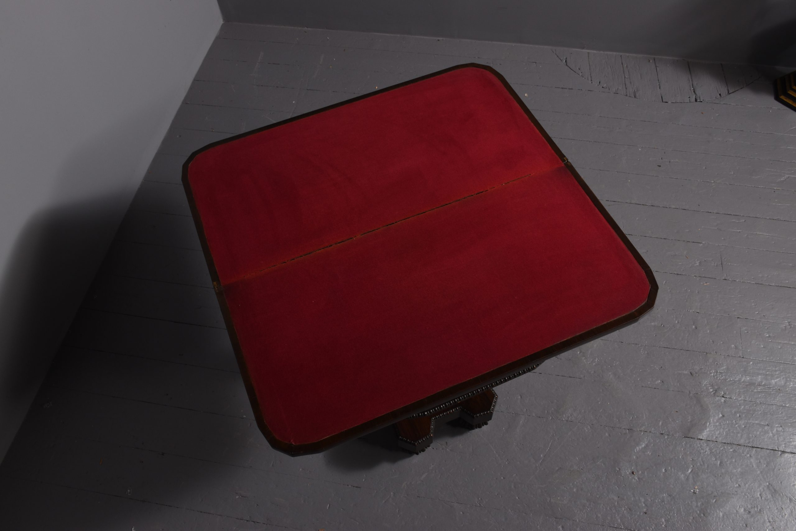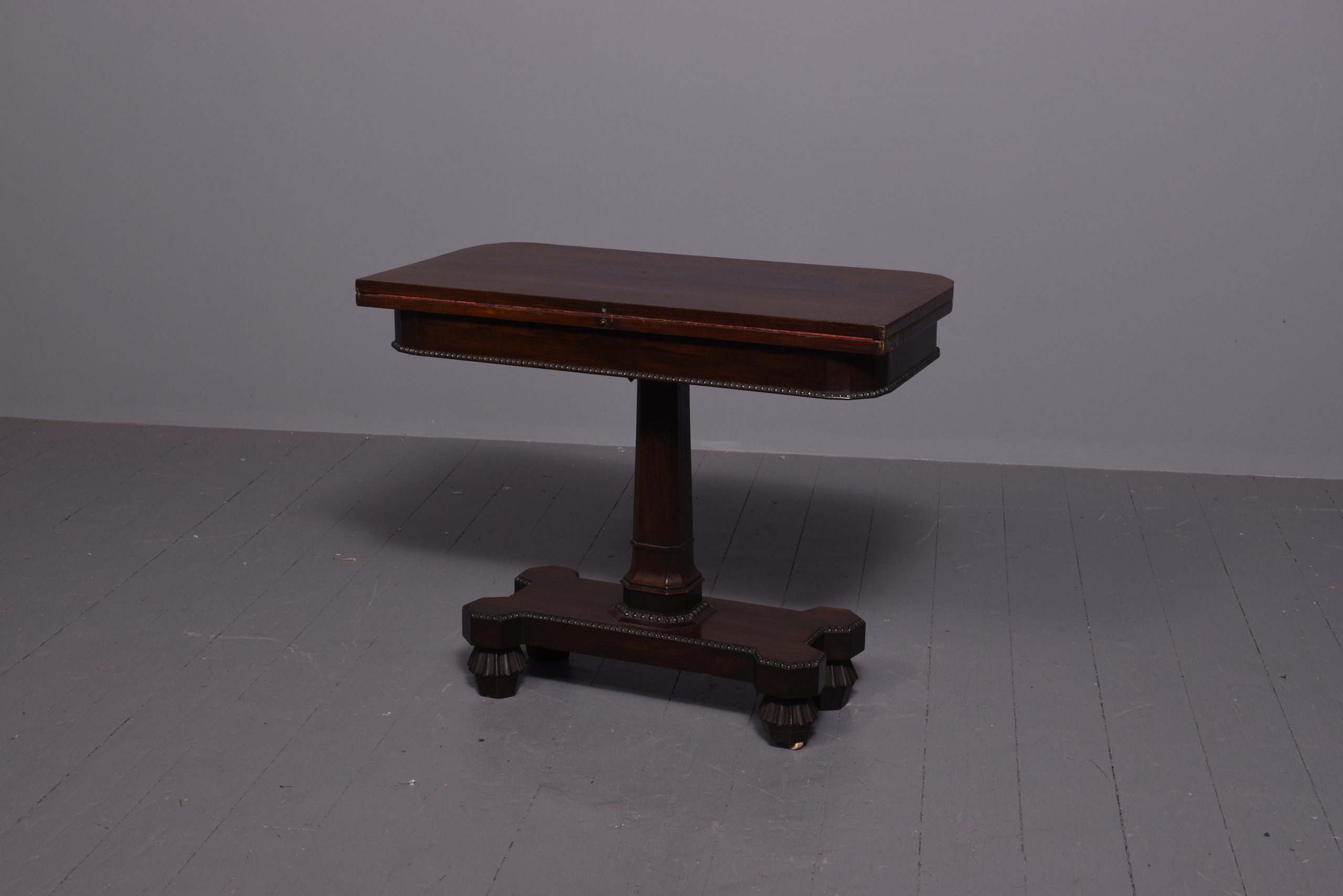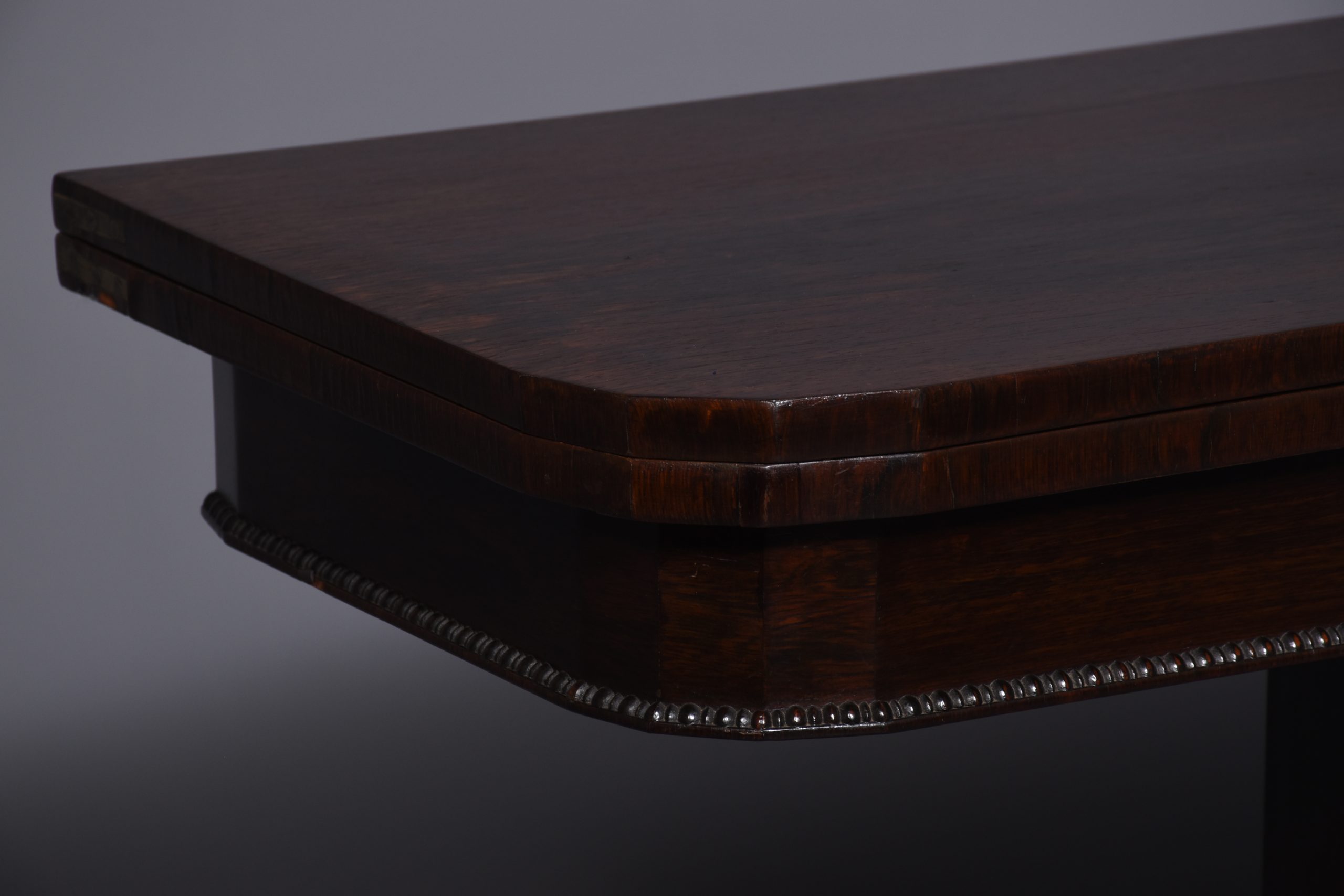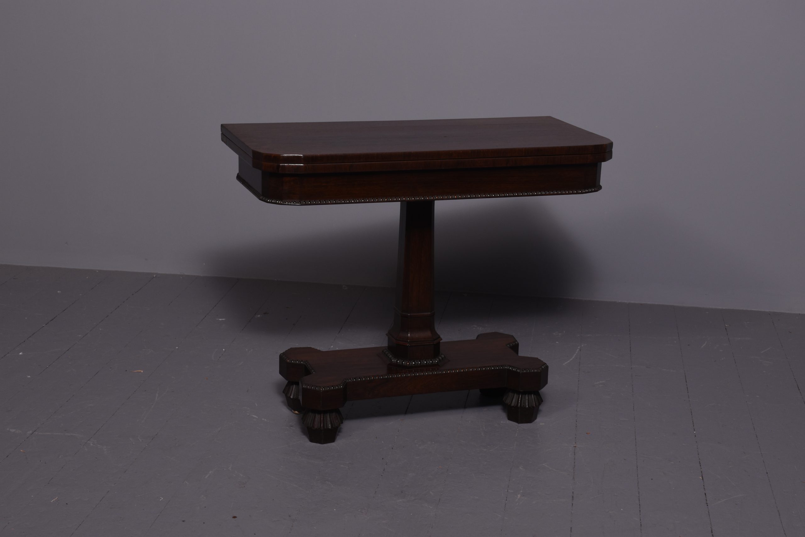 Circa 1850. Early Victorian rosewood games table with unusual faceted corners to front and beaded decoration to frieze, standing on a tapered stem above a shaped platform base with beaded decoration, on fluted supports.