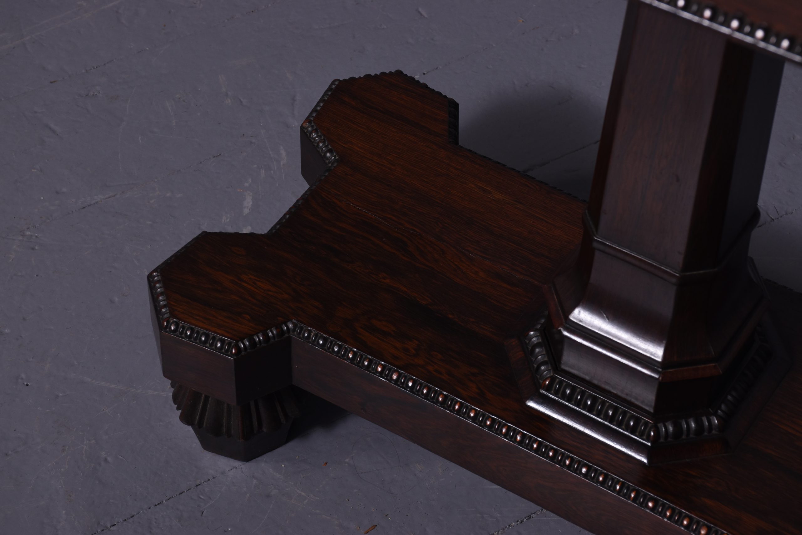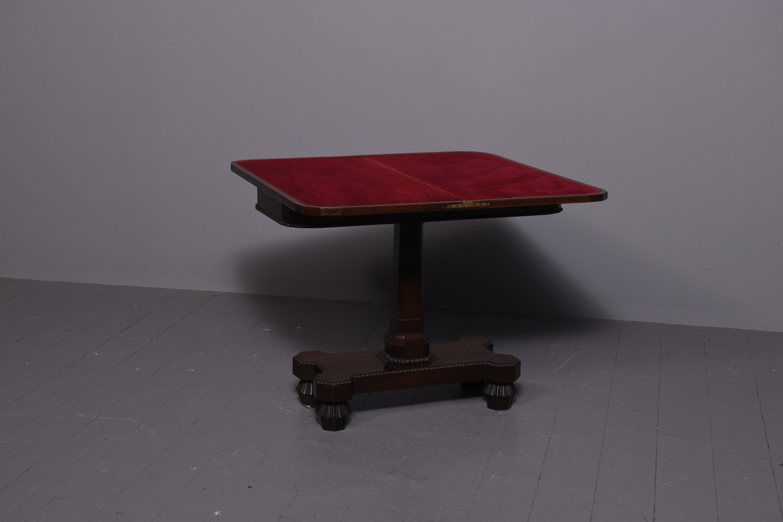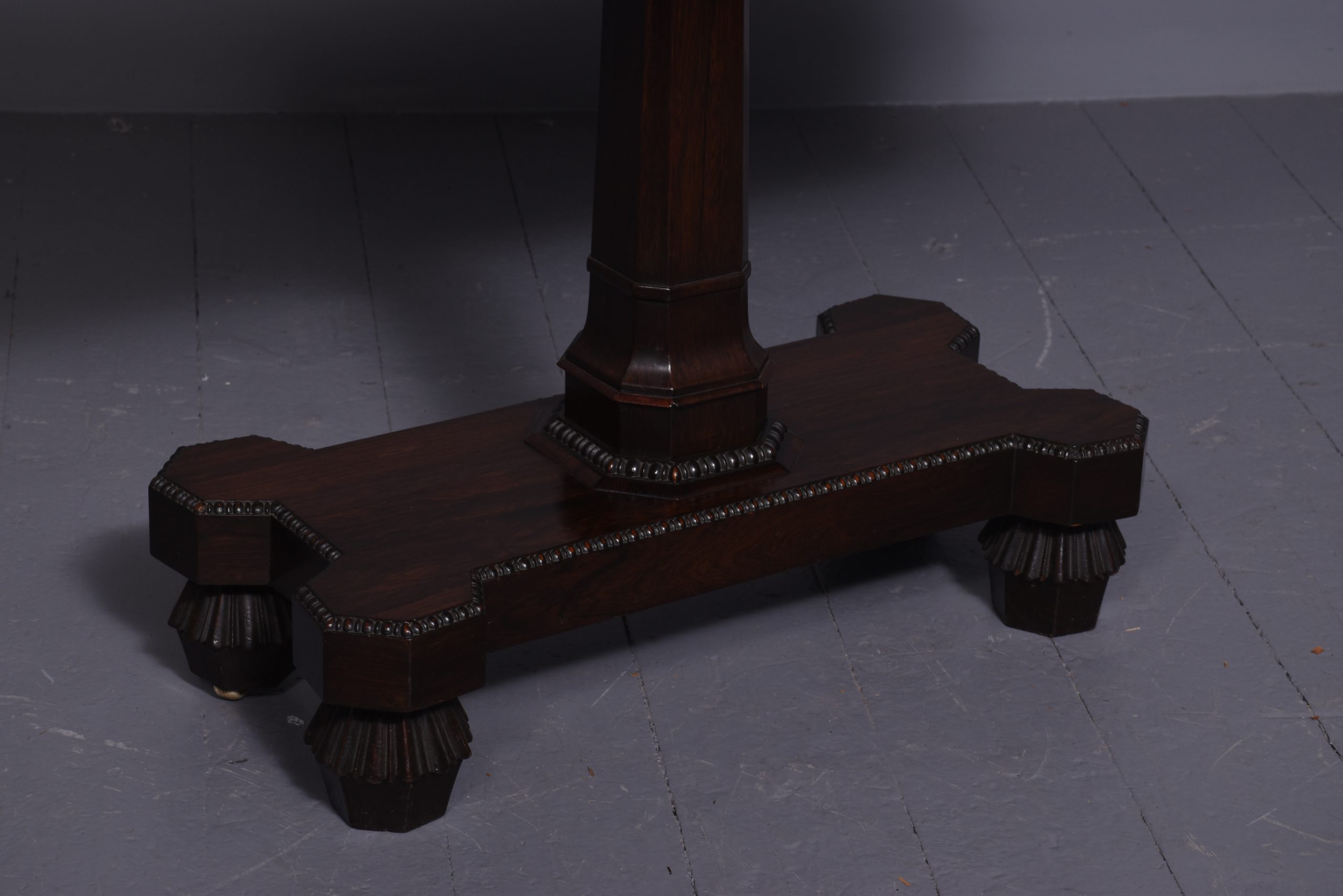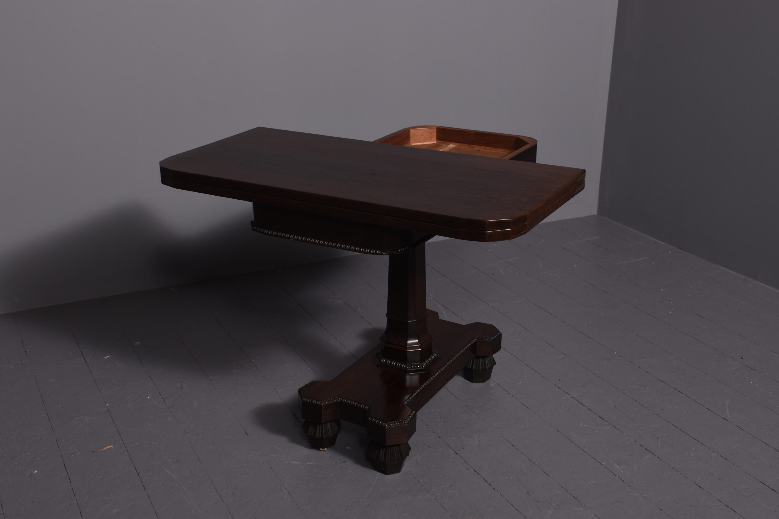 Circa 1850. Early Victorian rosewood games table with unusual faceted corners to front and beaded decoration to frieze, standing on a tapered stem above a shaped platform base with beaded decoration, on fluted supports.