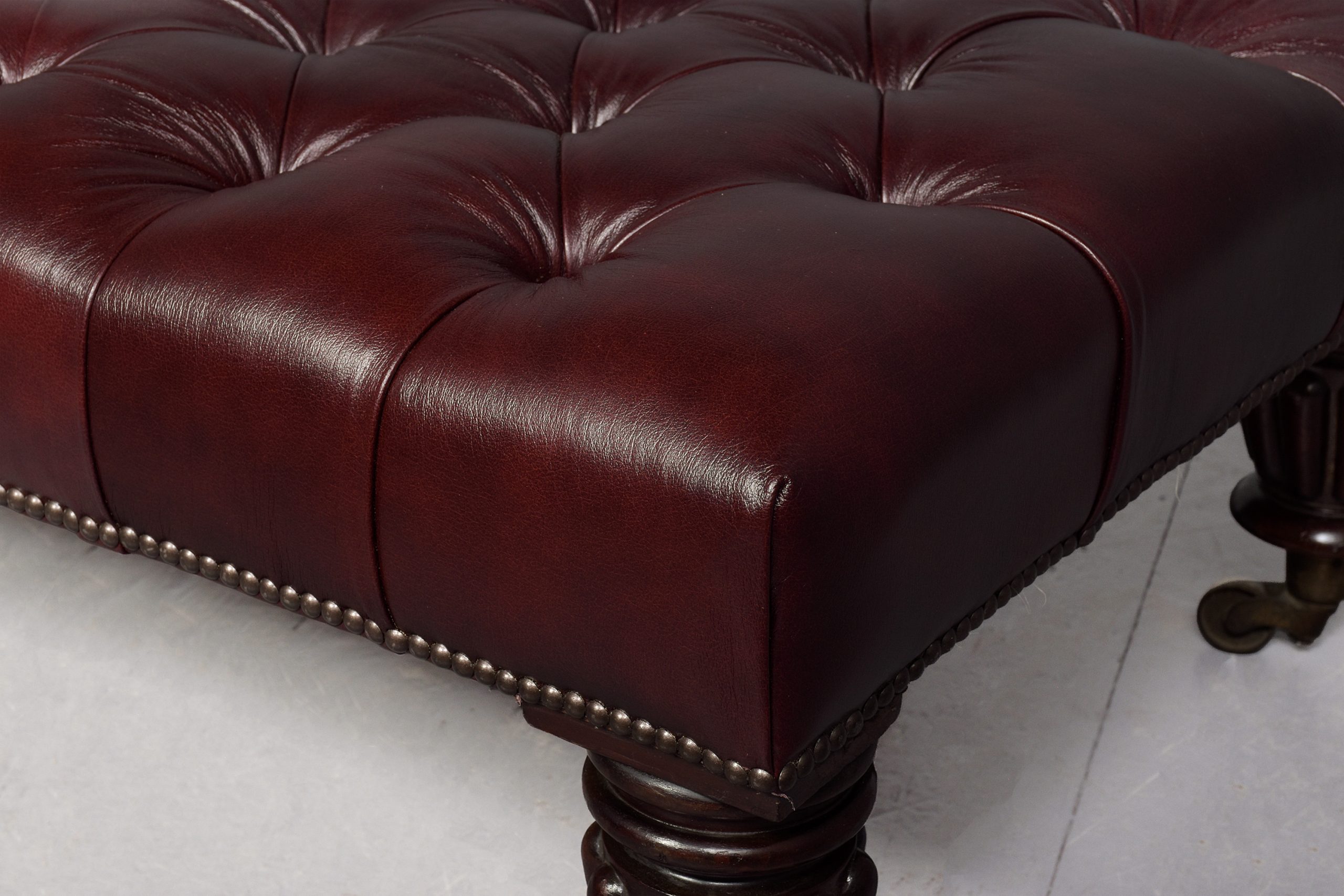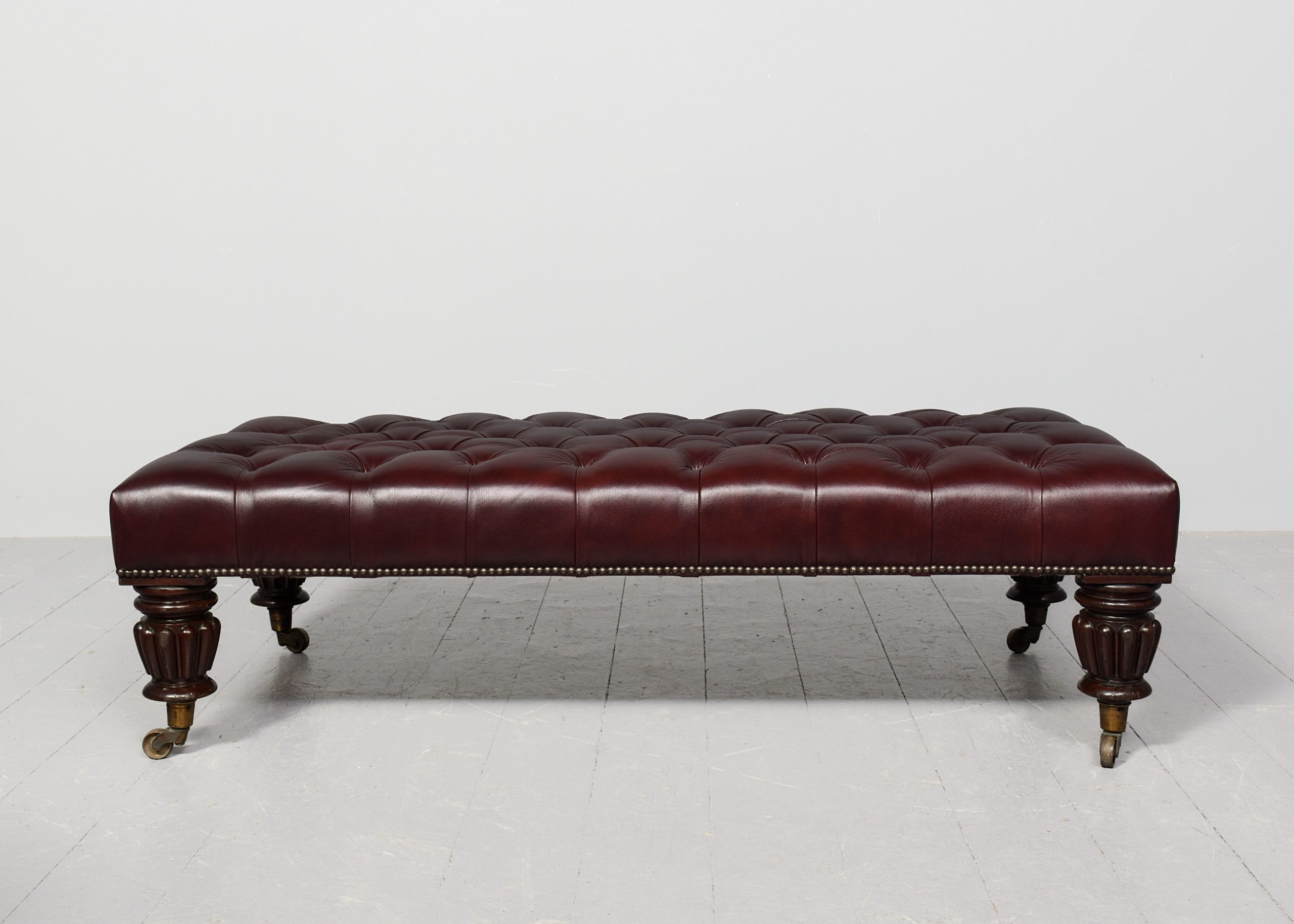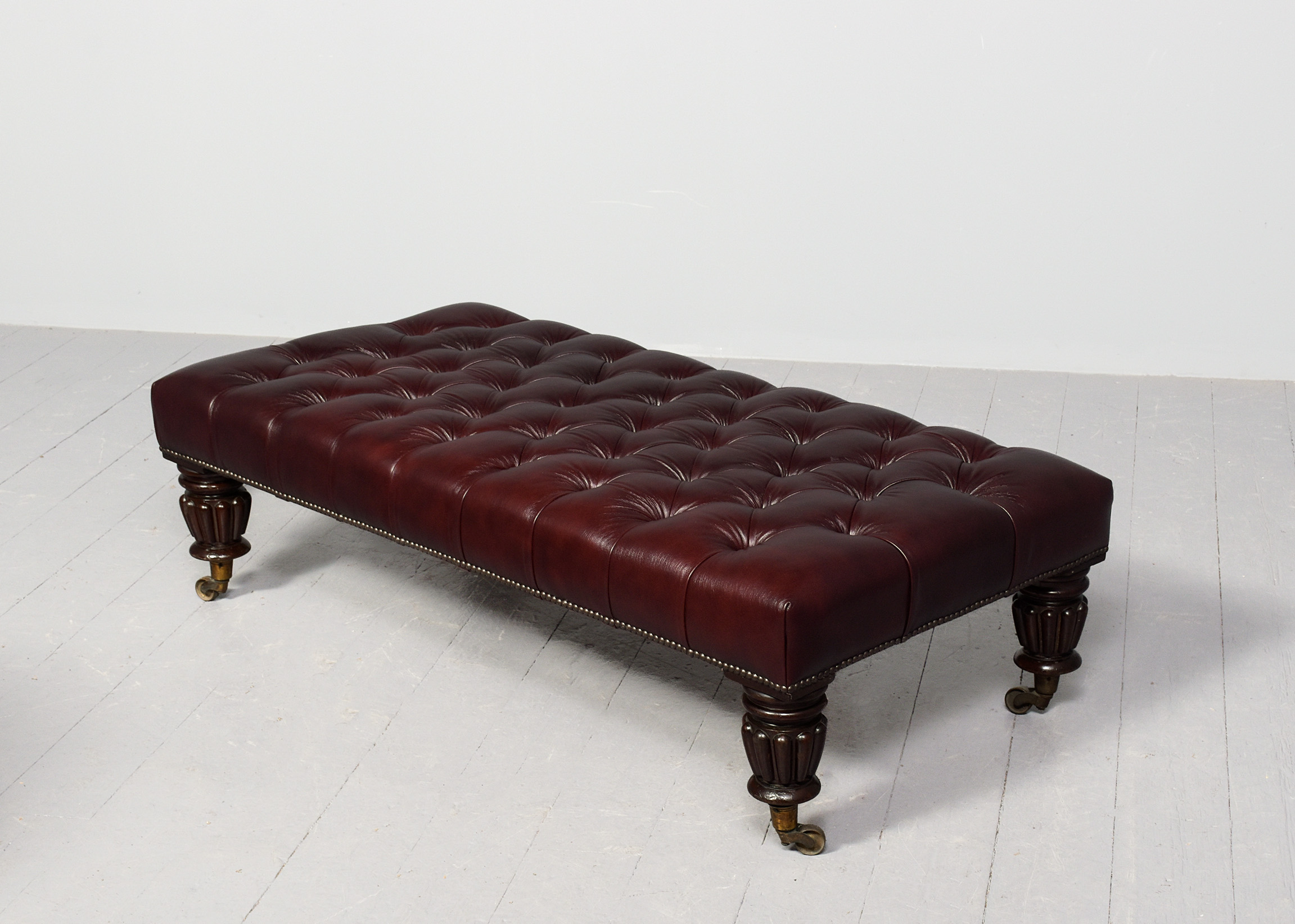 Circa 1830 with adaptations. Early Victorian, unusual, large mahogany-framed buttoned leather stool. The rectangular top with deep buttoned quality burgundy hide with brass studding, supported on stylish fluted and turned legs with original brass caps and castors. Rare item, in excellent condition.
