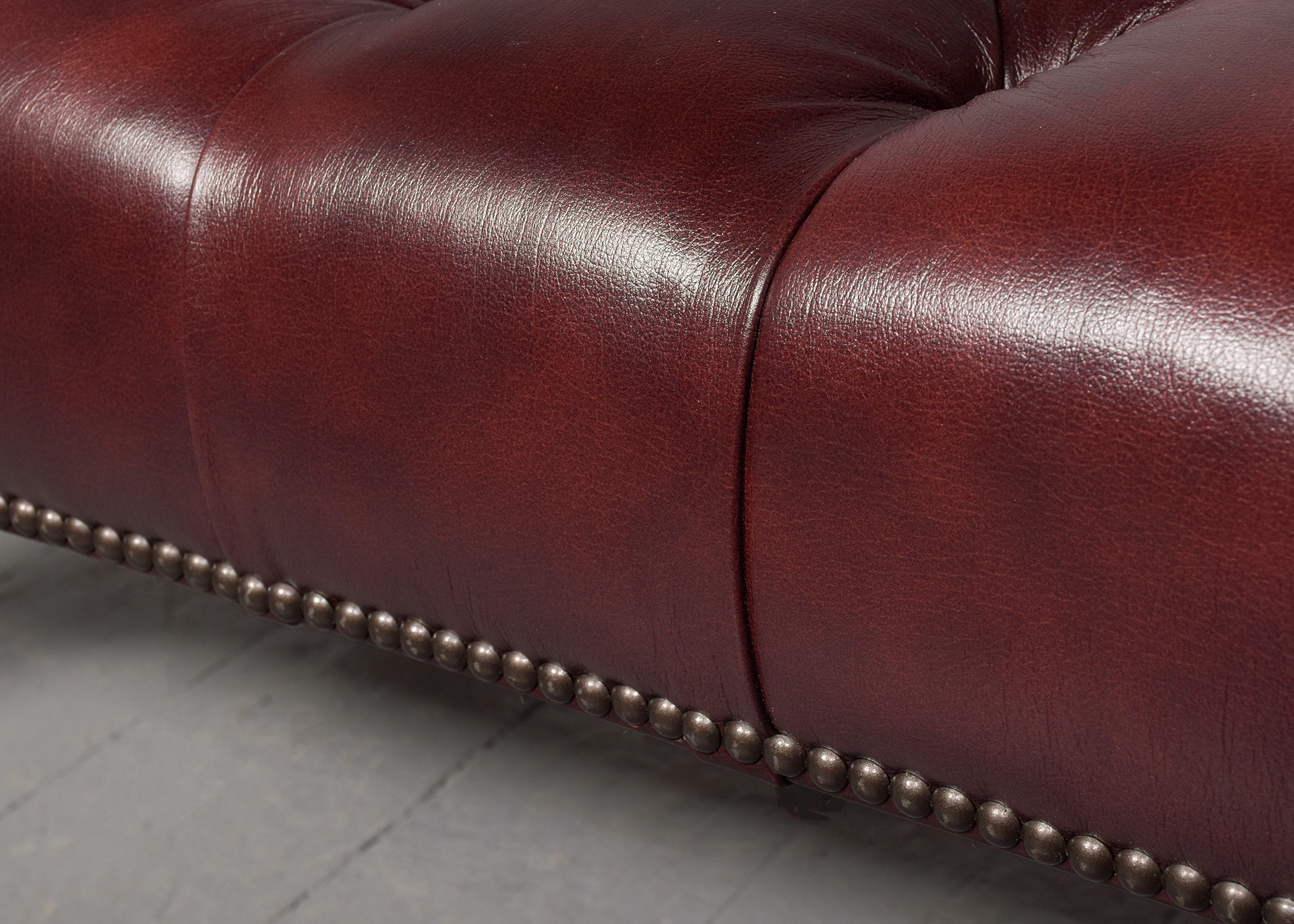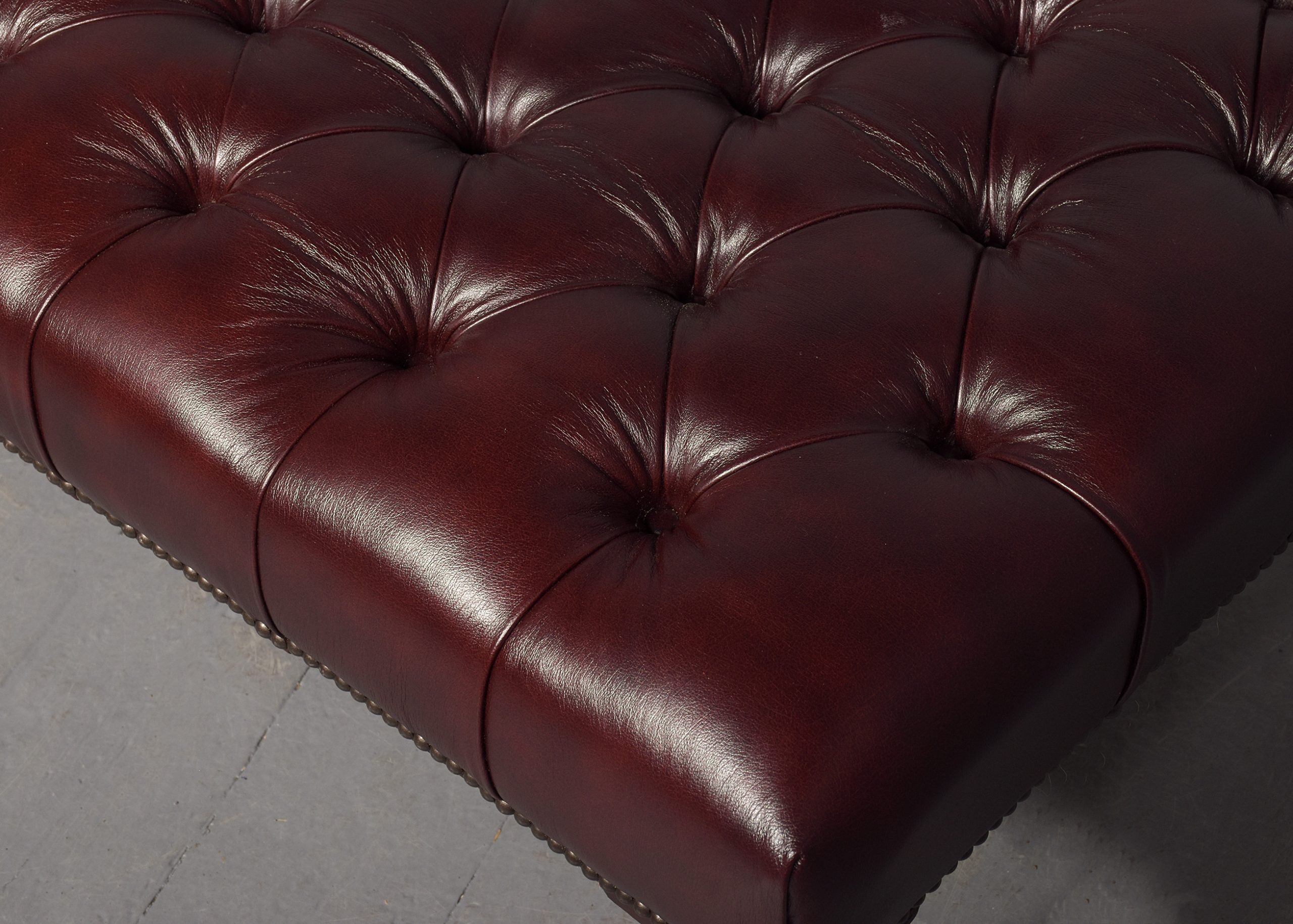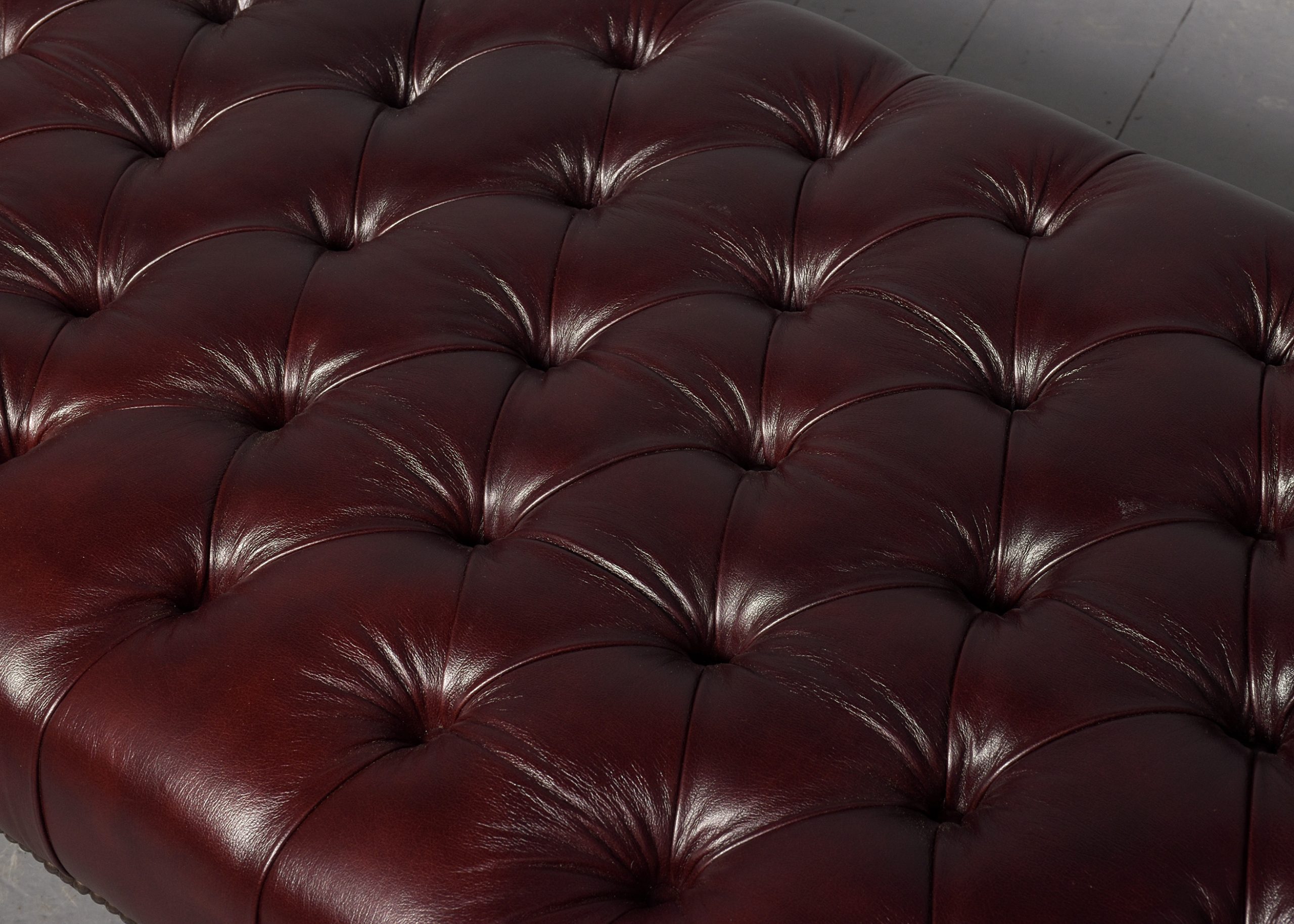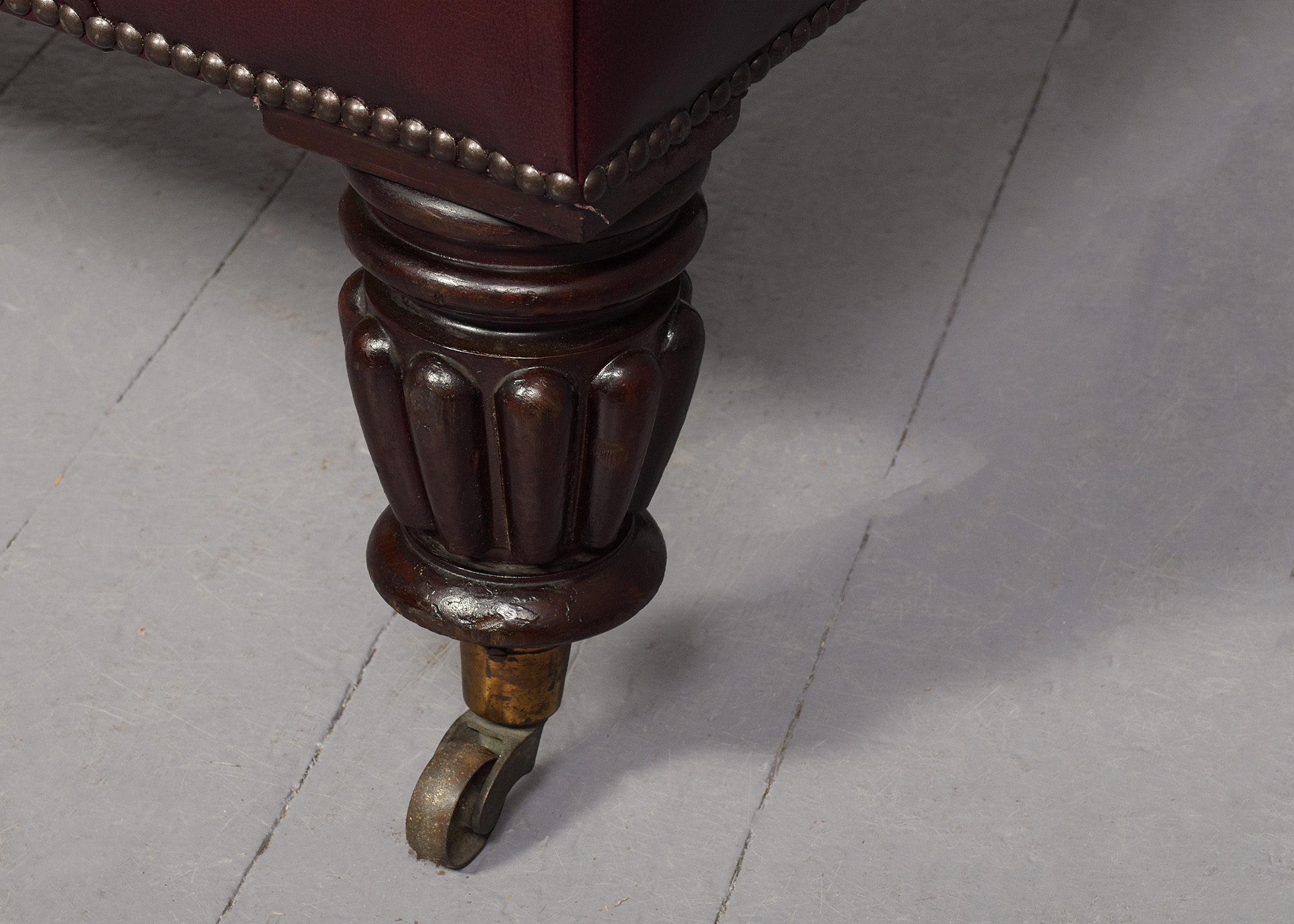Circa 1830 with adaptations. Early Victorian, unusual, large mahogany-framed buttoned leather stool. The rectangular top with deep buttoned quality burgundy hide with brass studding, supported on stylish fluted and turned legs with original brass caps and castors. Rare item, in excellent condition.