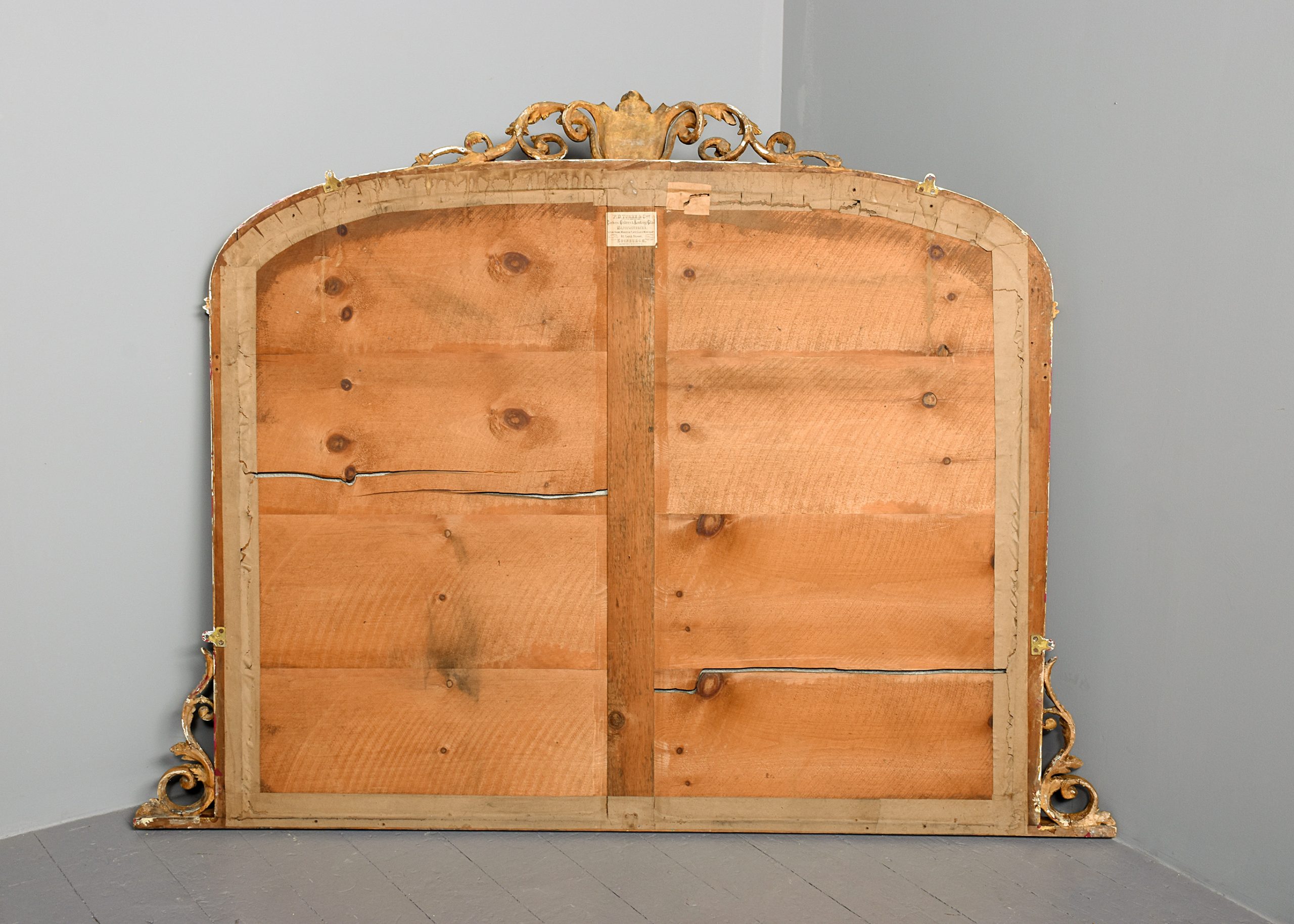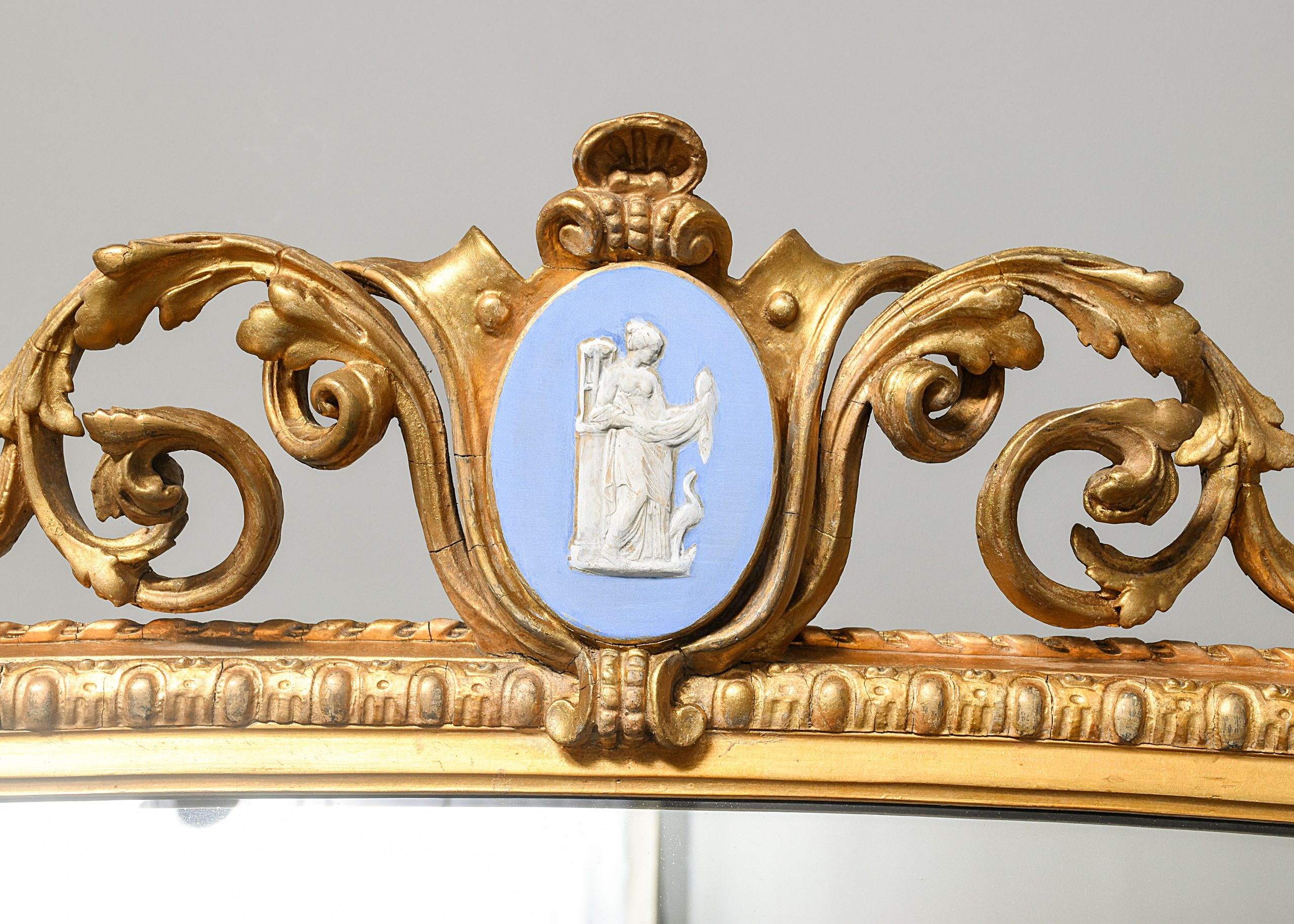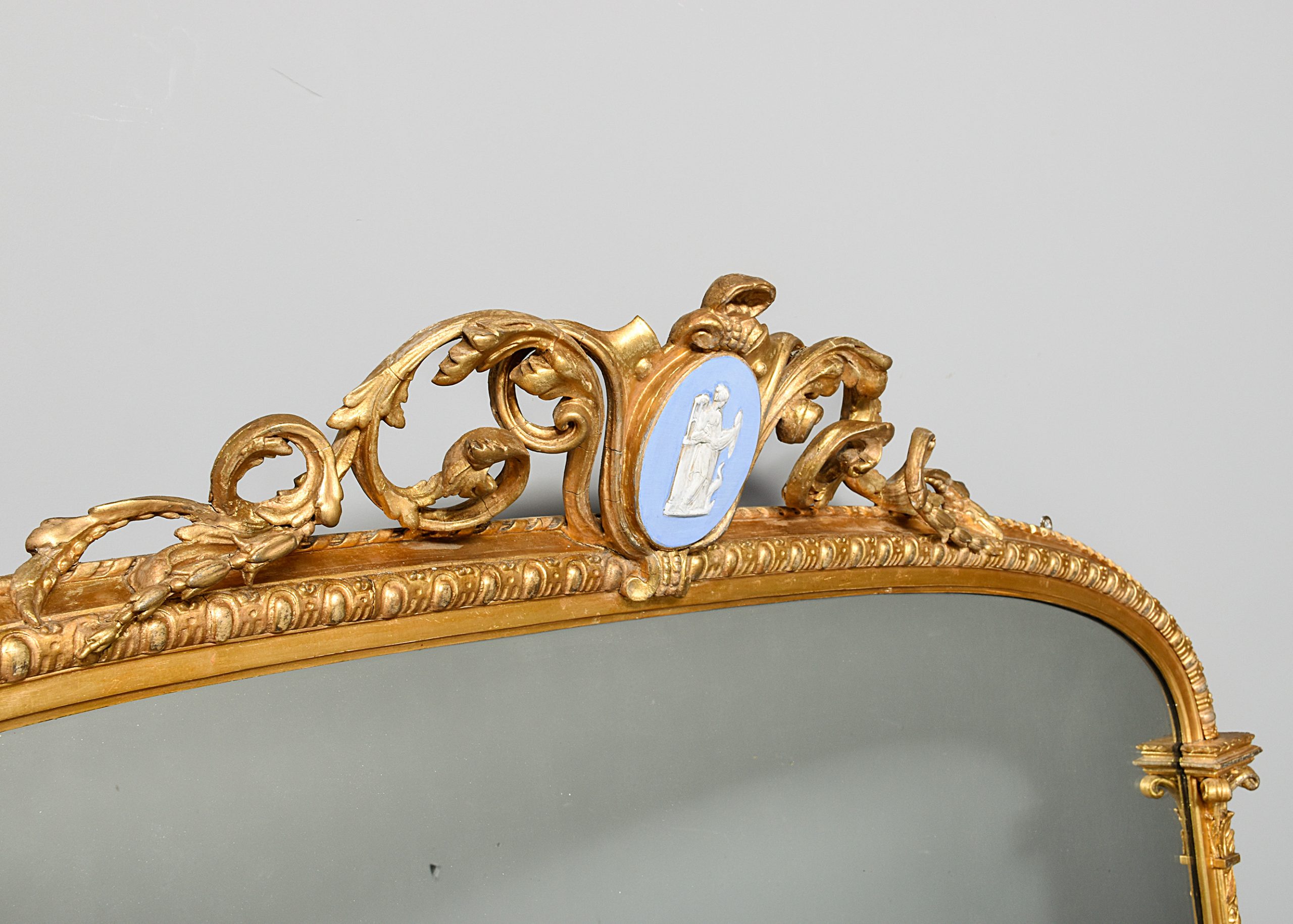Circa 1880. Victorian carved and gilded overmantel mirror with Edinburgh makers label on the back, the mirror with a stylish pediment including an oval Wedgewood Jasper plaque, with foliate carving on each side, containing its original mirror plate with a simple slip with a moulded section, the uprights with carved capped pilasters with a flowerhead on the base, and scrolling foliate casting to the sides. The trade label on the back is P’.D. Torre and Company, Carvers. Gilders and Looking Glass manufacturers, 81 Leith Street Edinburgh’, the mirror is in excellent condition, with slight foxing in one location.