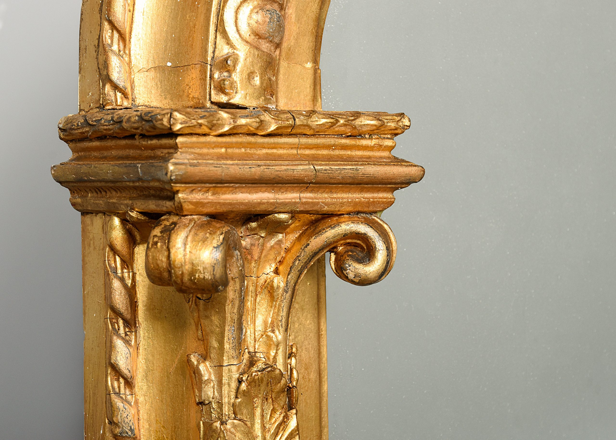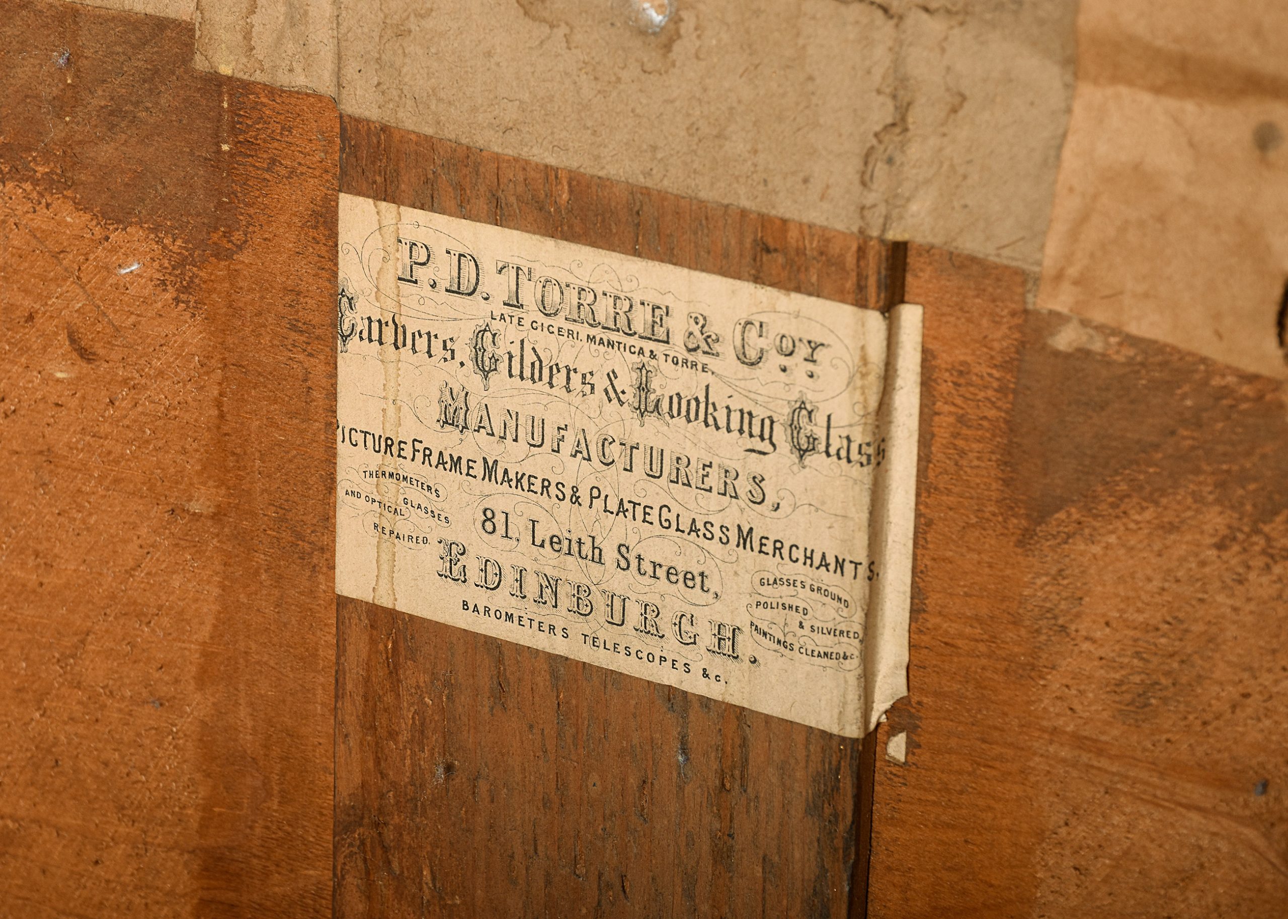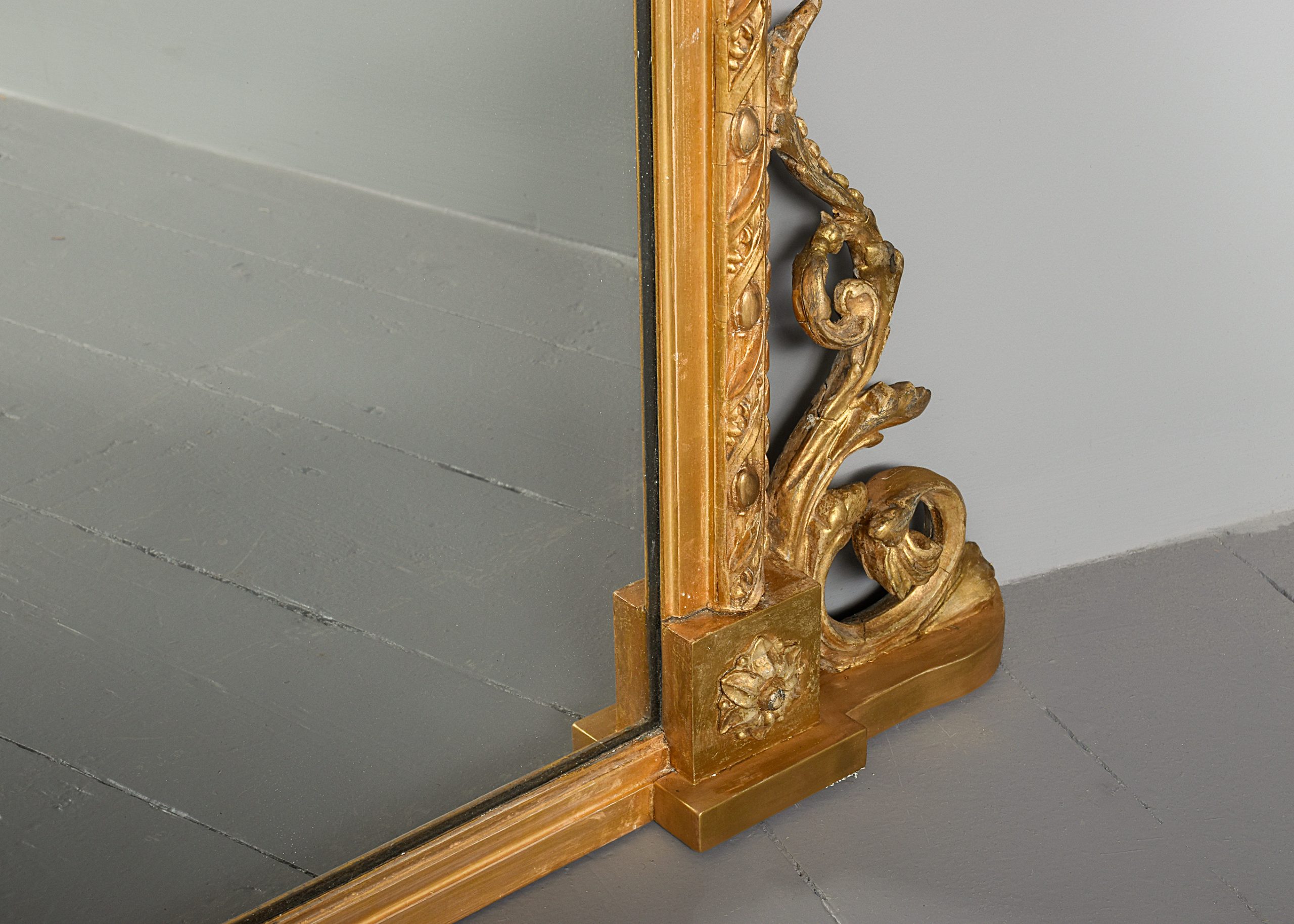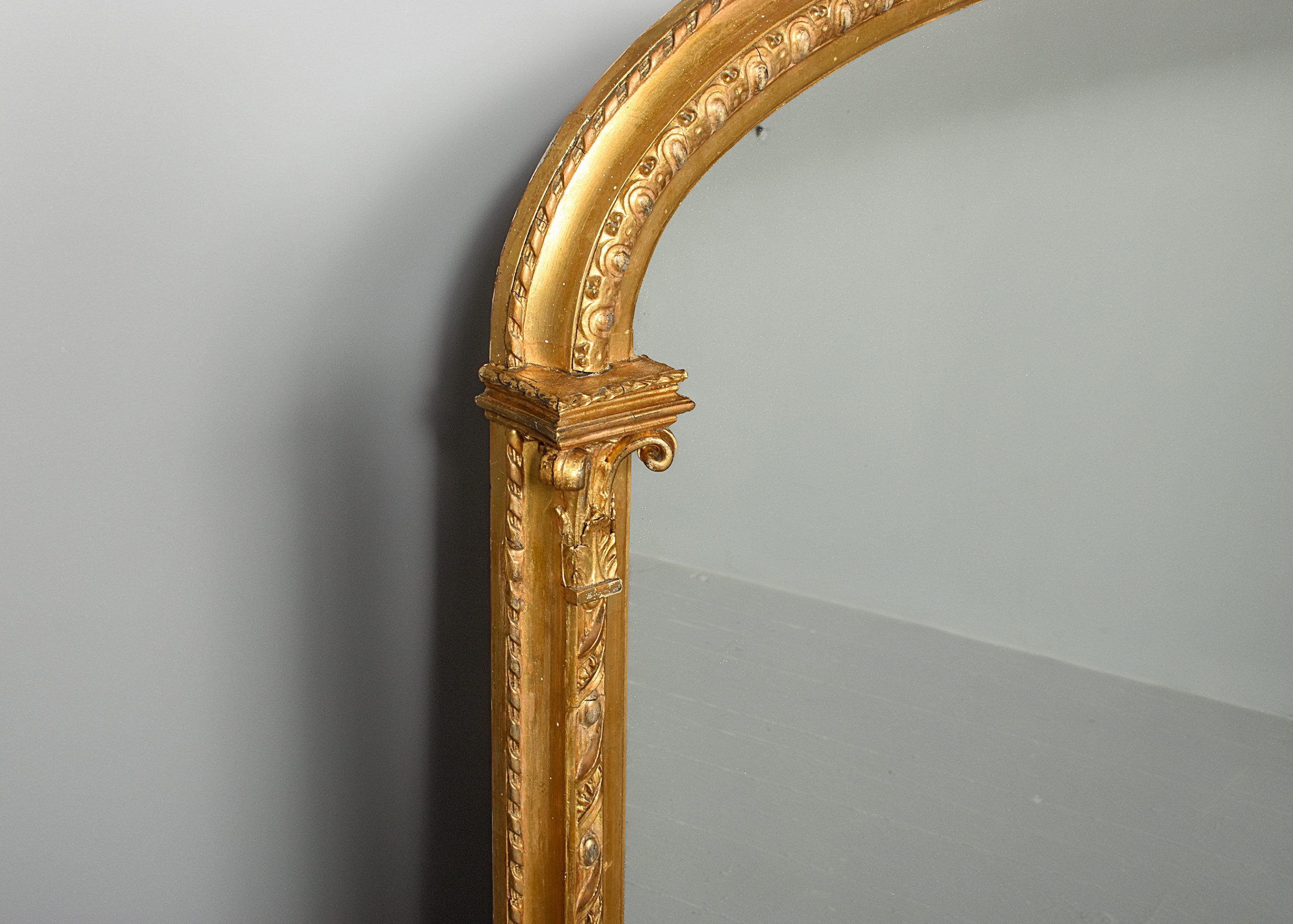 Circa 1880. Victorian carved and gilded overmantel mirror with Edinburgh makers label on the back, the mirror with a stylish pediment including an oval Wedgewood Jasper plaque, with foliate carving on each side, containing its original mirror plate with a simple slip with a moulded section, the uprights with carved capped pilasters with a flowerhead on the base, and scrolling foliate casting to the sides. The trade label on the back is P’.D. Torre and Company, Carvers. Gilders and Looking Glass manufacturers, 81 Leith Street Edinburgh’, the mirror is in excellent condition, with slight foxing in one location.