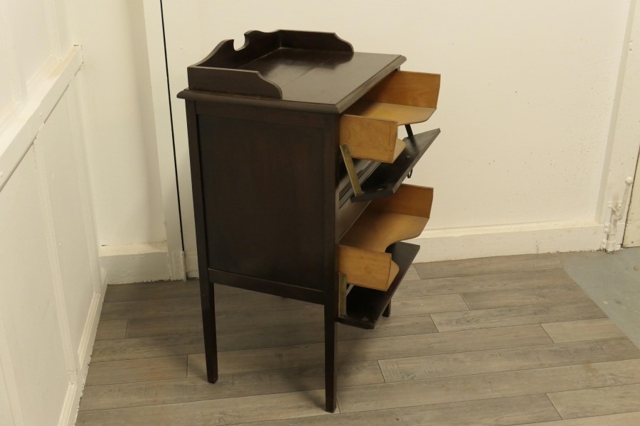Edwardian 4 slide music cabinet. A good looking piece, the cabinet has 4 slides or drawers with fall fronts for the storage of sheet music. The cabinet is in good antique condition, it is 33” high, 20” wide and 15” deep. TGF98 Manufacture Date : 1910 Materials : Beech