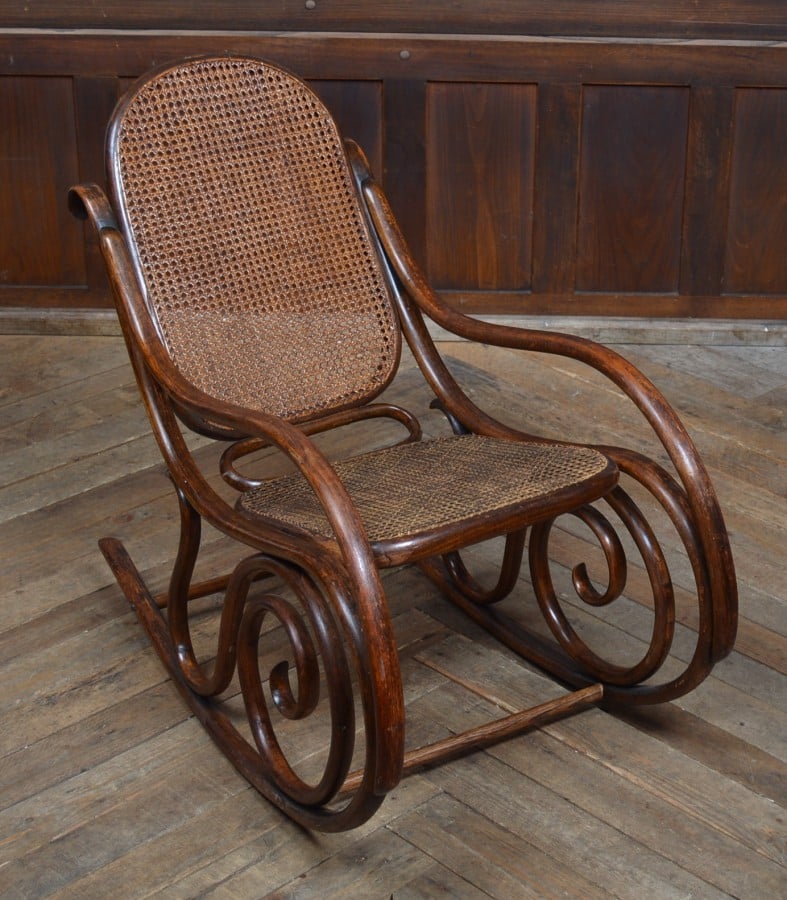 A superb Edwardian bentwood rocking chair featuring a Bergère caned seat and back, both in very good condition with no tears or breaks. The elegant bentwood frame is a standout, with raised arms, coiled side supports, and turned stretchers—all enhanced by a rich colour and outstanding patination. This stylish and well-crafted chair is solid throughout, with no loose or broken joints. It’s a fine example of Edwardian design and would make a graceful addition to any home.