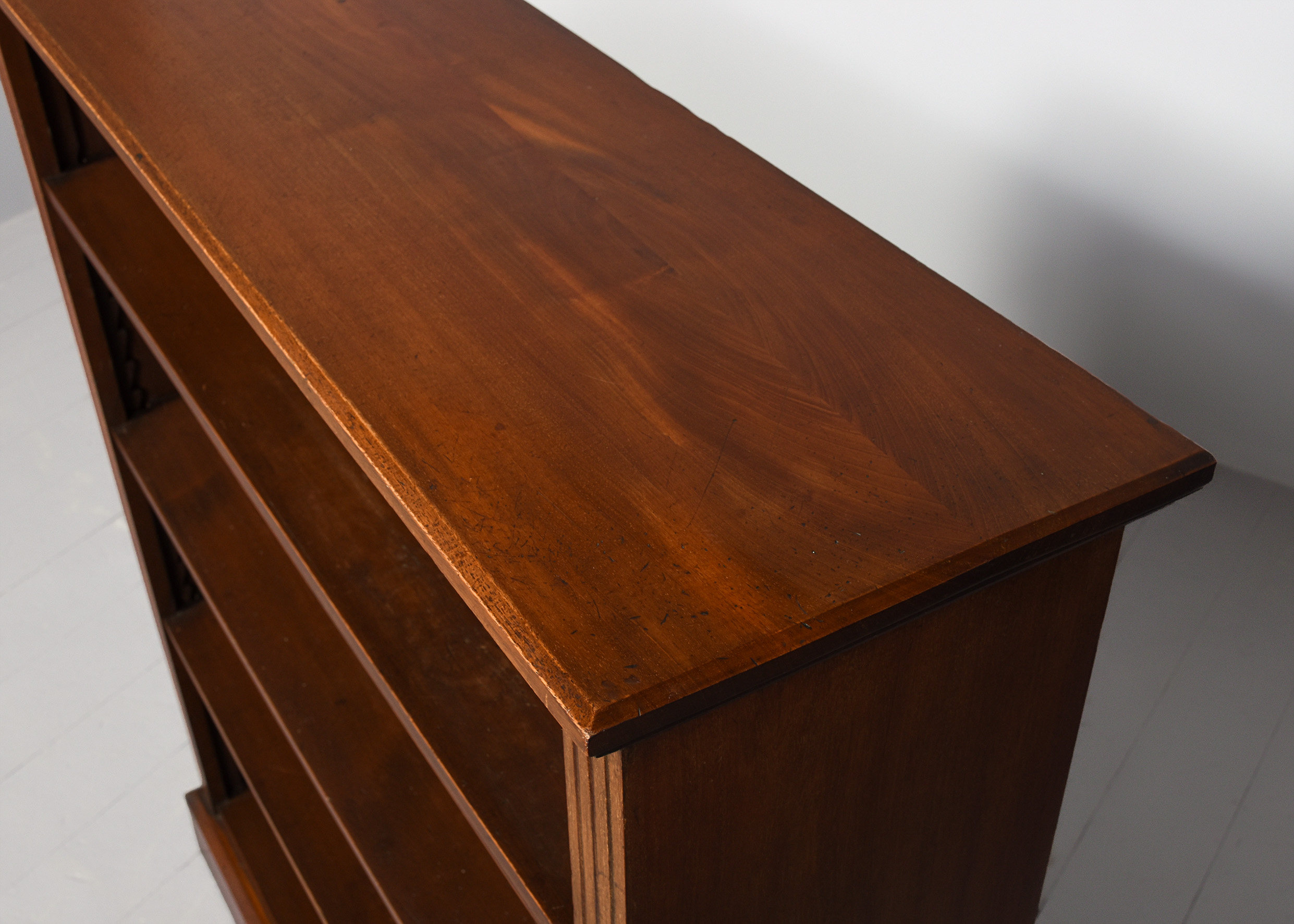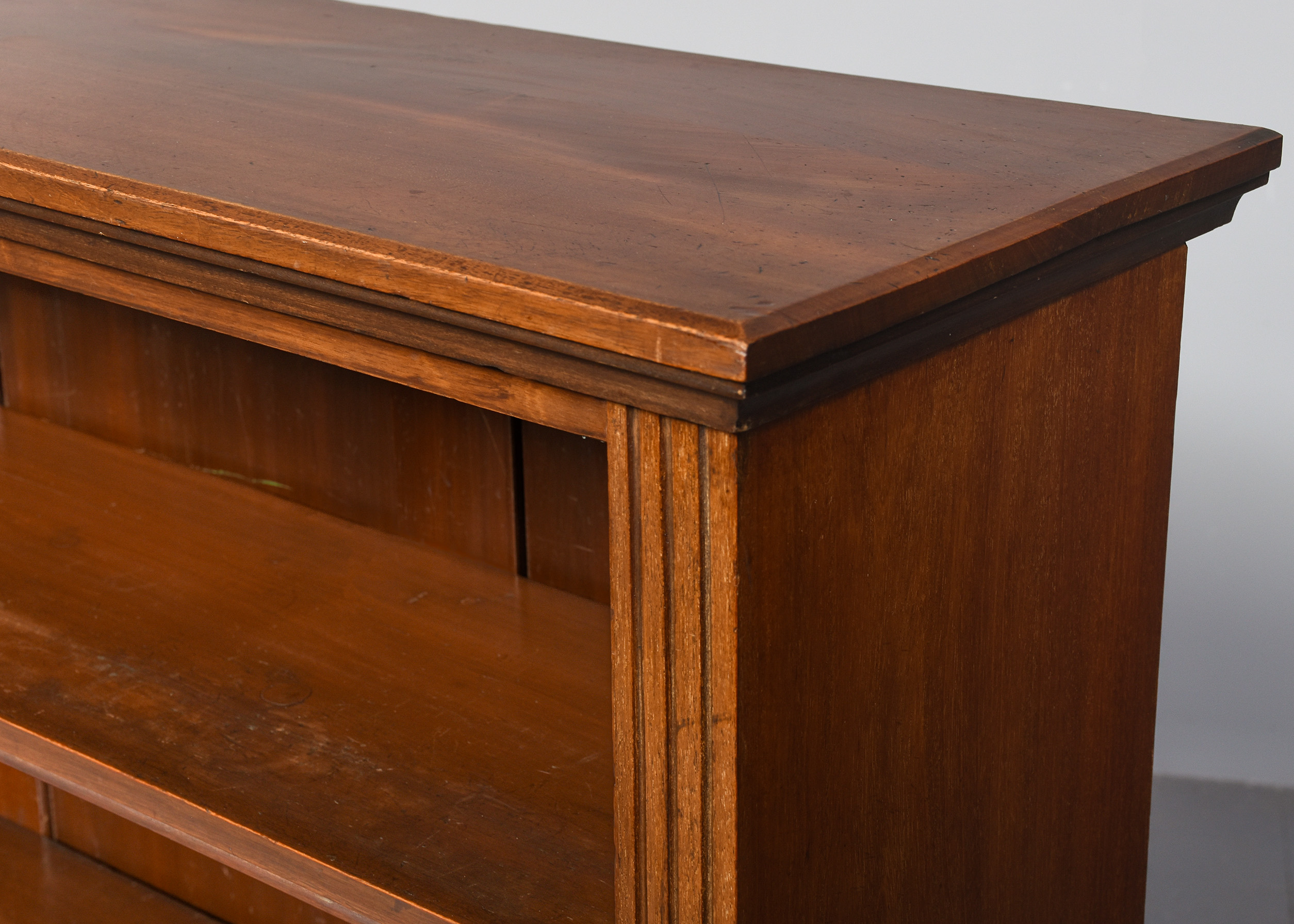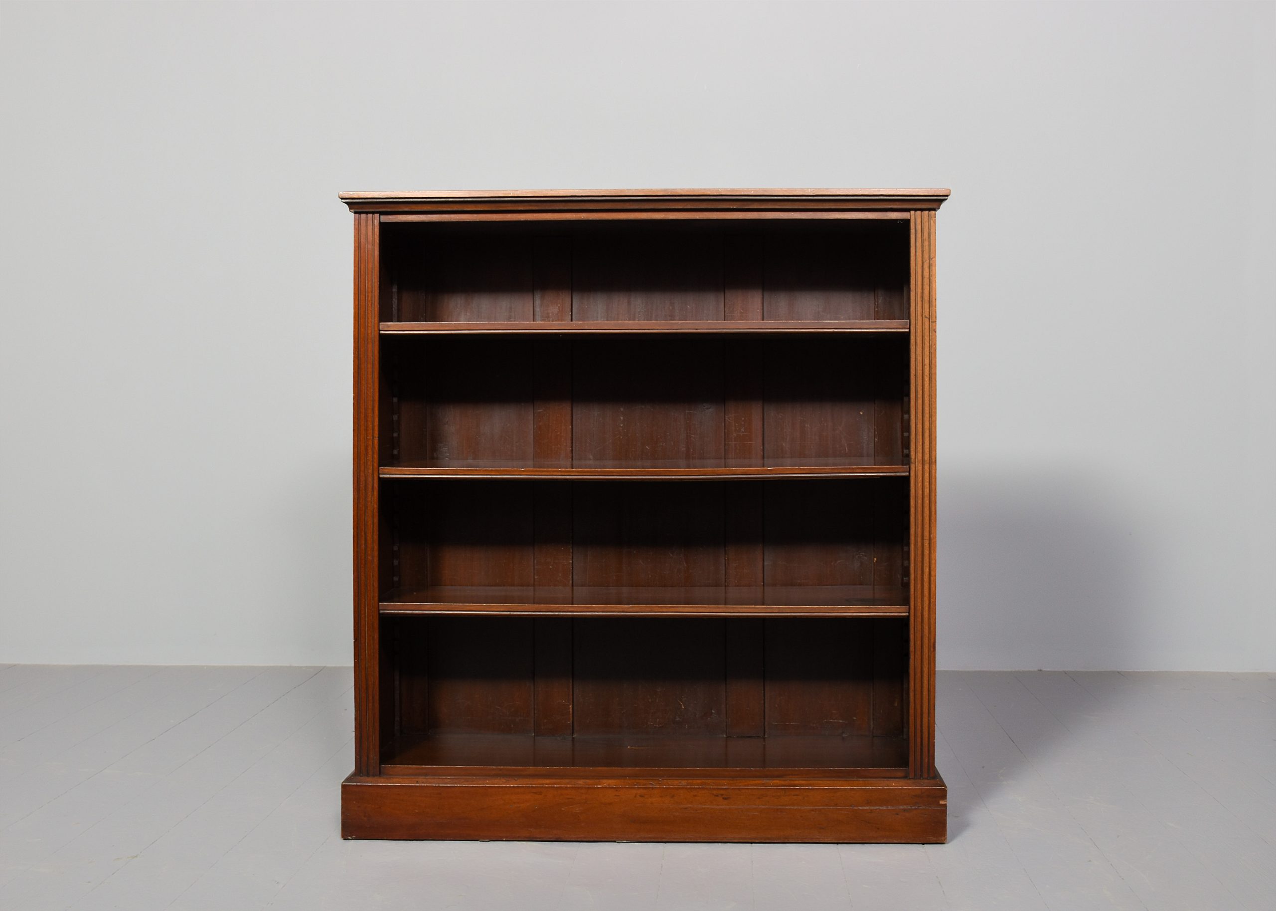 Circa 1900. A neat-sized Edwardian mahogany open bookcase, the solid top with a simple chamfered leading-edge, the front with three adjustable mahogany shelves, the bookcase with ribbed facings on both sides, resting on an enclosed mahogany plinth.