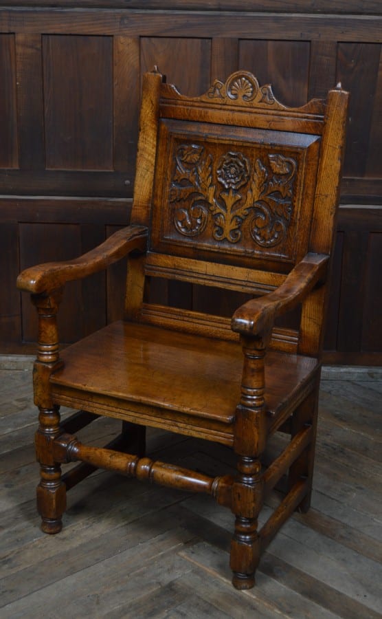 Superb Edwardian carved oak arm chair with polished seat in excellent solid condition. The back rest has a beautifully shaped carved top rail and panel that leads down to square back legs. The two arms are shaped for comfort and sit on two turned uprights leading down to turned and block legs. The legs are united by square stretchers at the side and back with a turned stretcher to the front. It is a fabulous colour with amazing patina which can only be achieved through years of love and use. Like all antique furniture there are some imperfections however these only add to this fantastic looking chair.