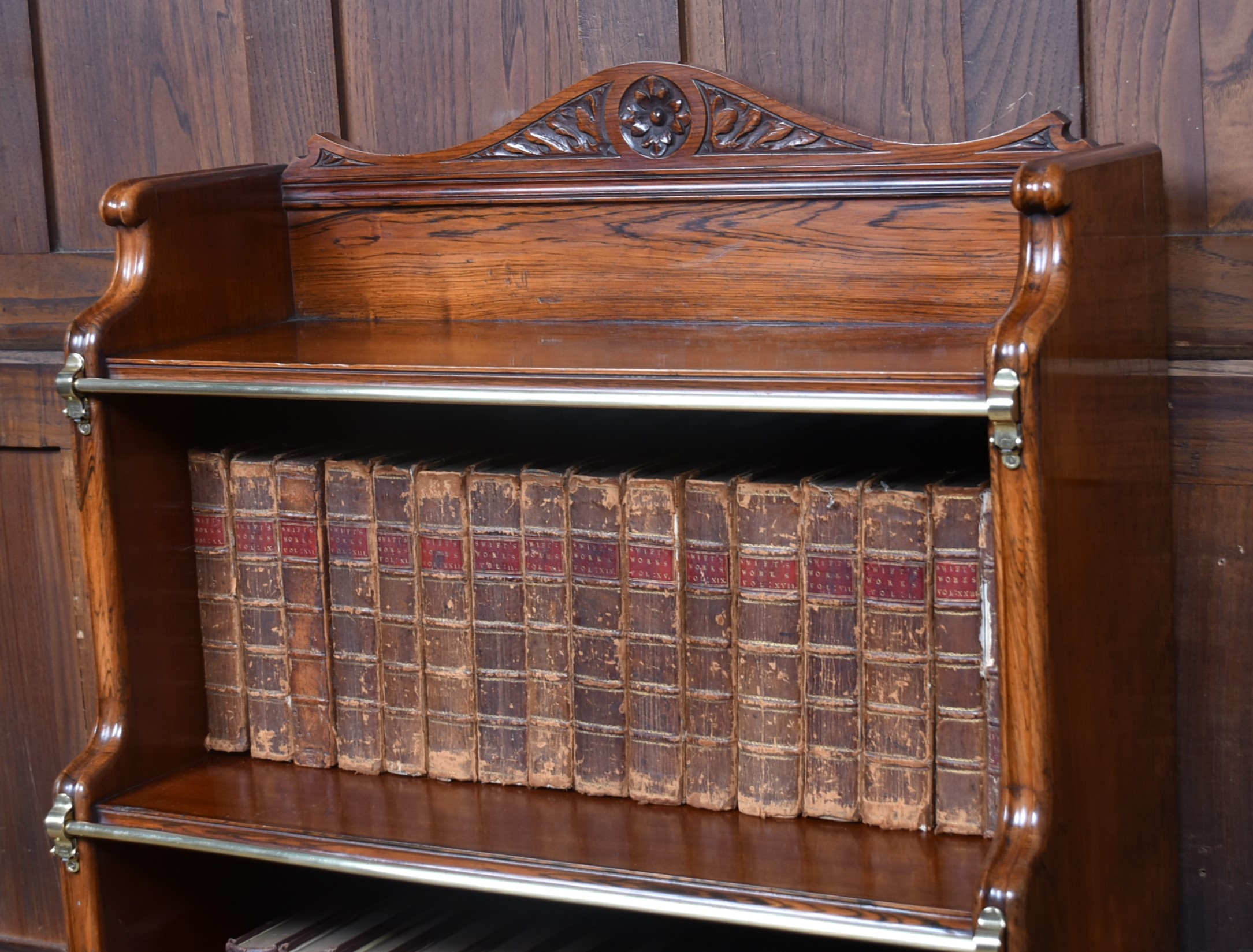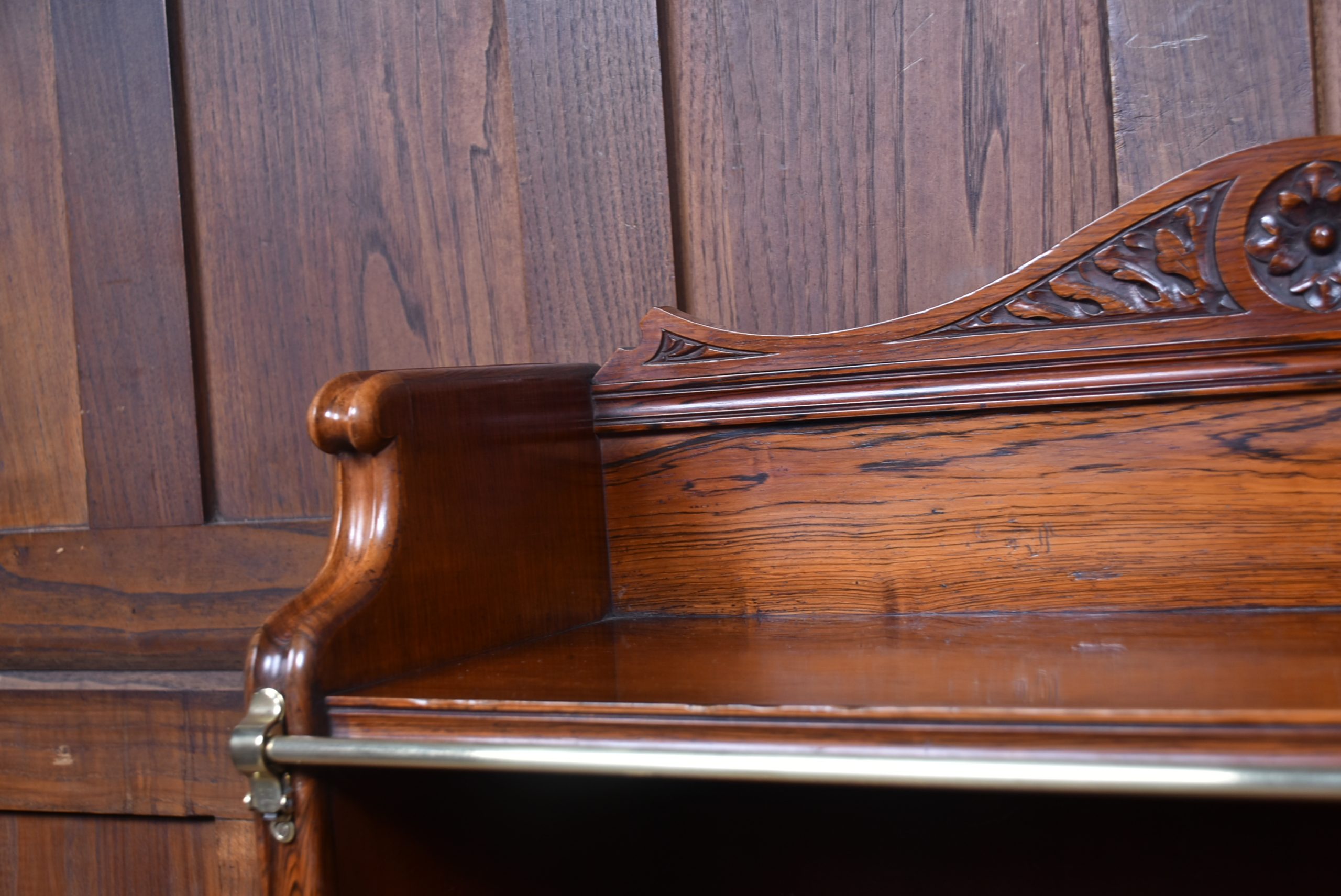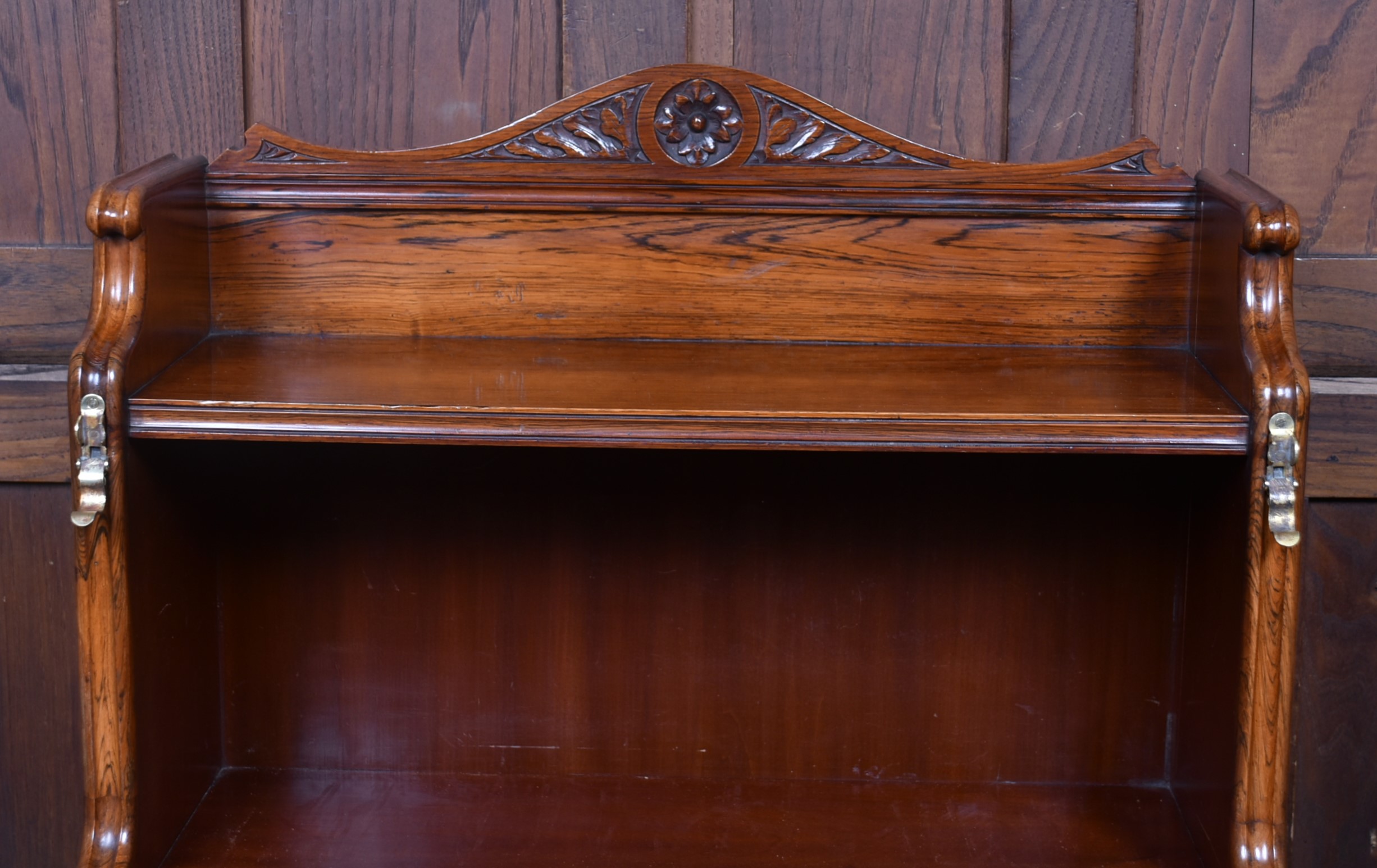 A beautifully proportioned Edwardian waterfall bookcase in excellent antique condition with light, age‑appropriate wear. The bookcase made from high‑quality rosewood with superb graining and a rich, well‑developed patina. The top is crowned with an ornately carved crest, featuring a central roundel with foliate carving and softly scrolling edges — a charming, unmistakably Edwardian touch. Below, the three graduated shelves are each slightly recessed, creating the classic waterfall profile, and are finished with elegant brass gallery rails that add a decorative lift. Shaped, rounded sides give the piece a gentle softness and refined silhouette. Strong and stable, it is ideal for books, small collections, or curated decorative displays. A versatile and characterful bookcase that brings warmth, craftsmanship, and period charm to any interior.