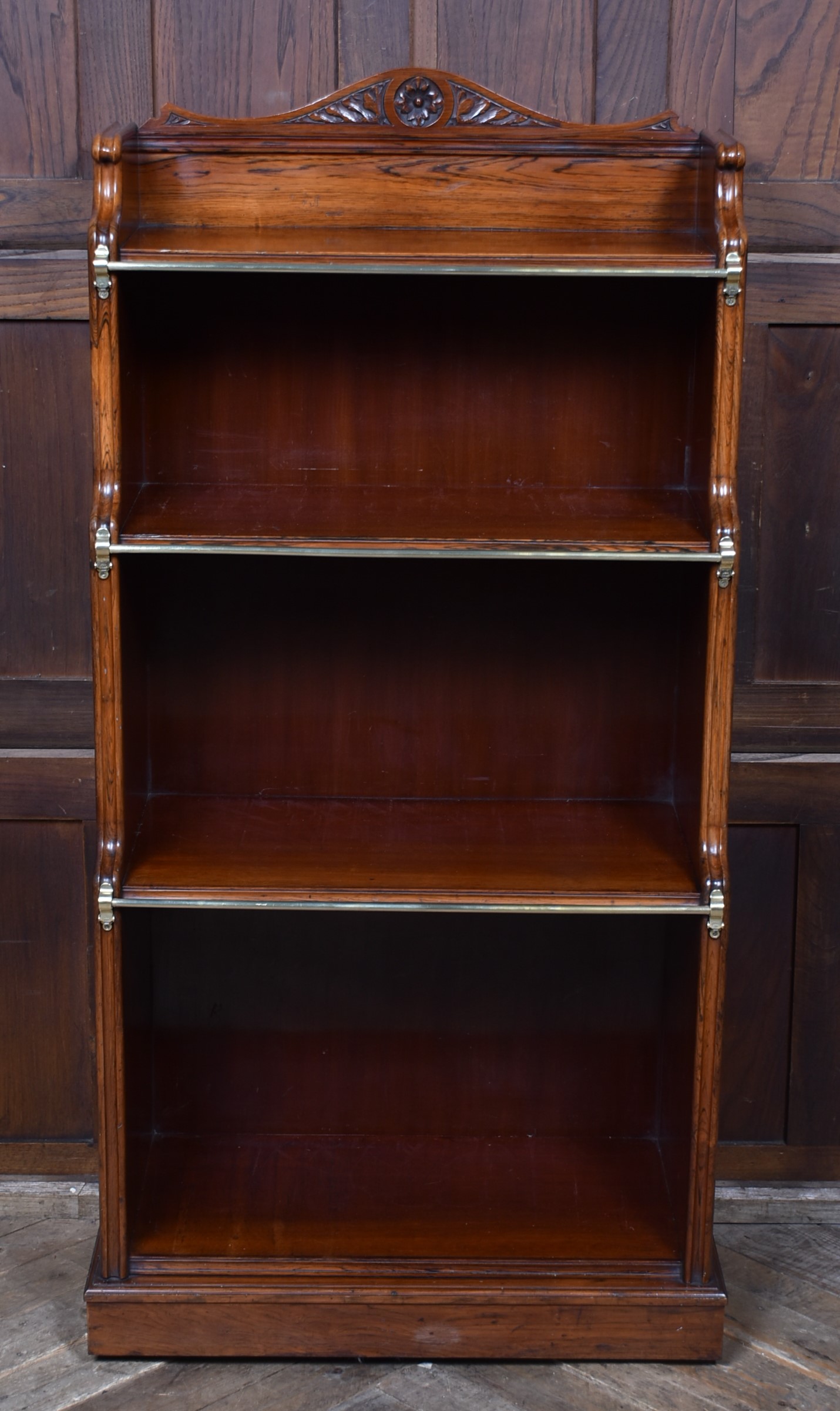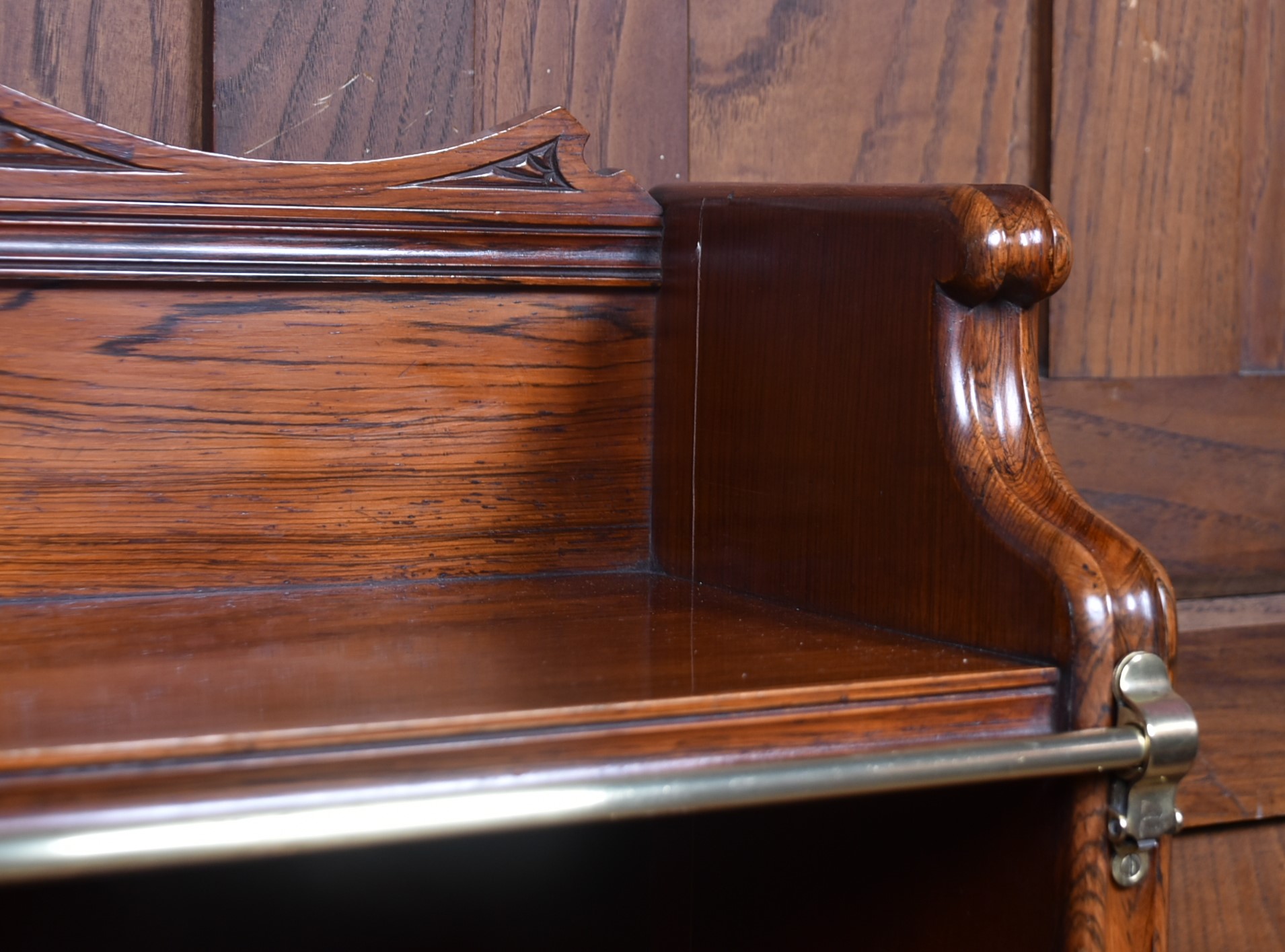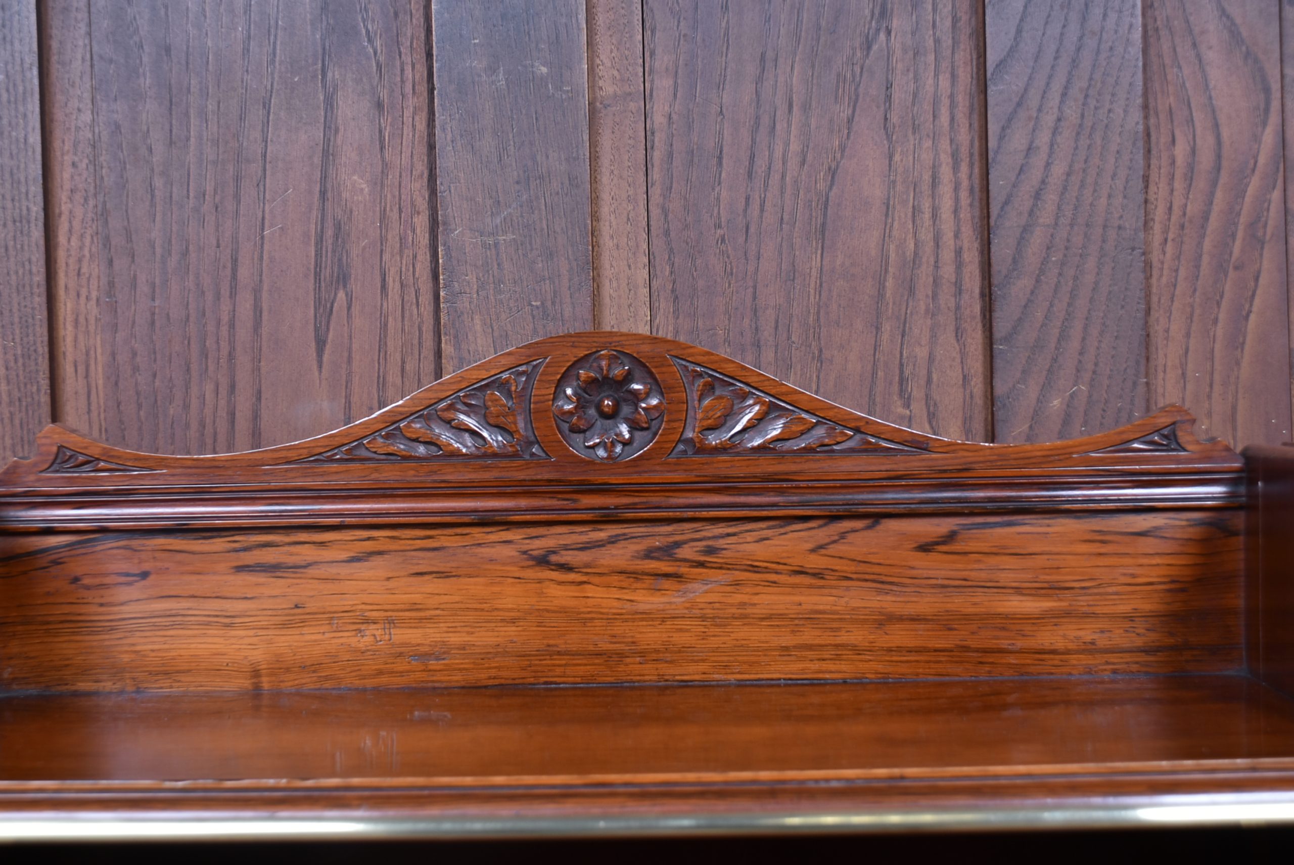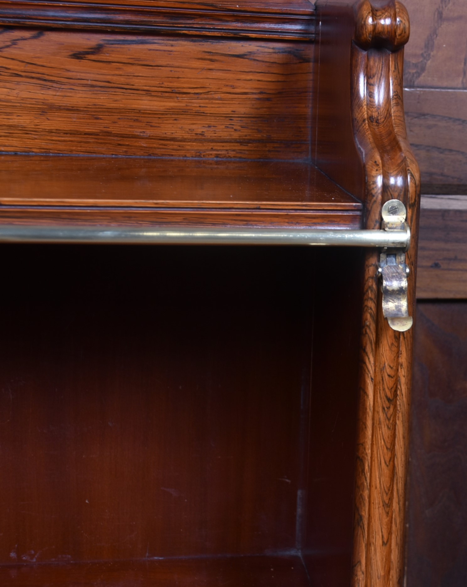 A beautifully proportioned Edwardian waterfall bookcase in excellent antique condition with light, age‑appropriate wear. The bookcase made from high‑quality rosewood with superb graining and a rich, well‑developed patina. The top is crowned with an ornately carved crest, featuring a central roundel with foliate carving and softly scrolling edges — a charming, unmistakably Edwardian touch. Below, the three graduated shelves are each slightly recessed, creating the classic waterfall profile, and are finished with elegant brass gallery rails that add a decorative lift. Shaped, rounded sides give the piece a gentle softness and refined silhouette. Strong and stable, it is ideal for books, small collections, or curated decorative displays. A versatile and characterful bookcase that brings warmth, craftsmanship, and period charm to any interior.