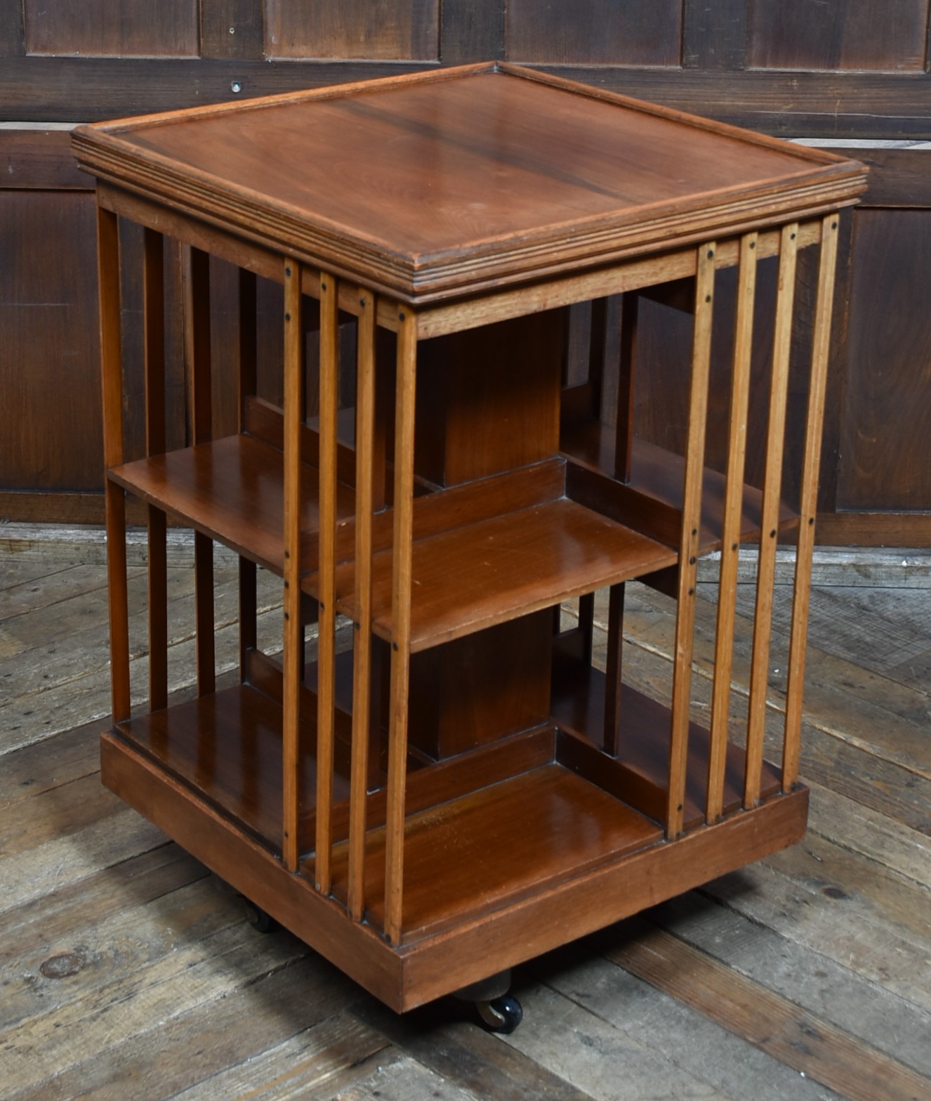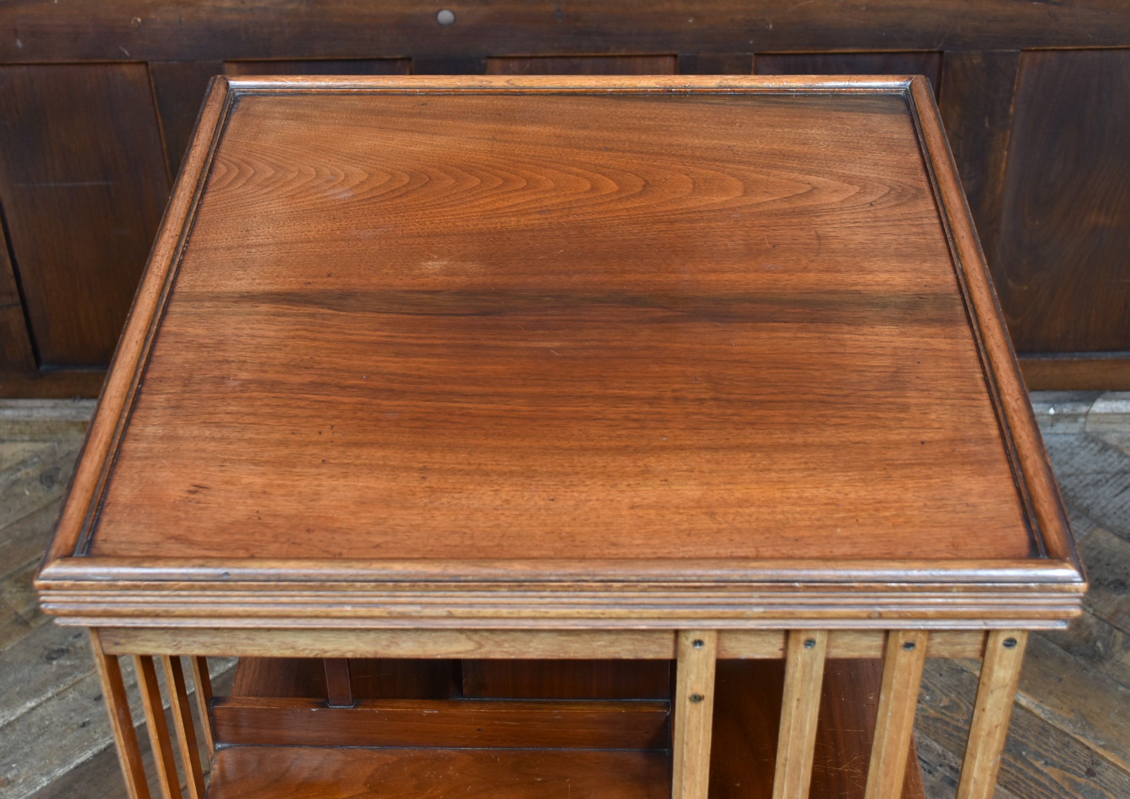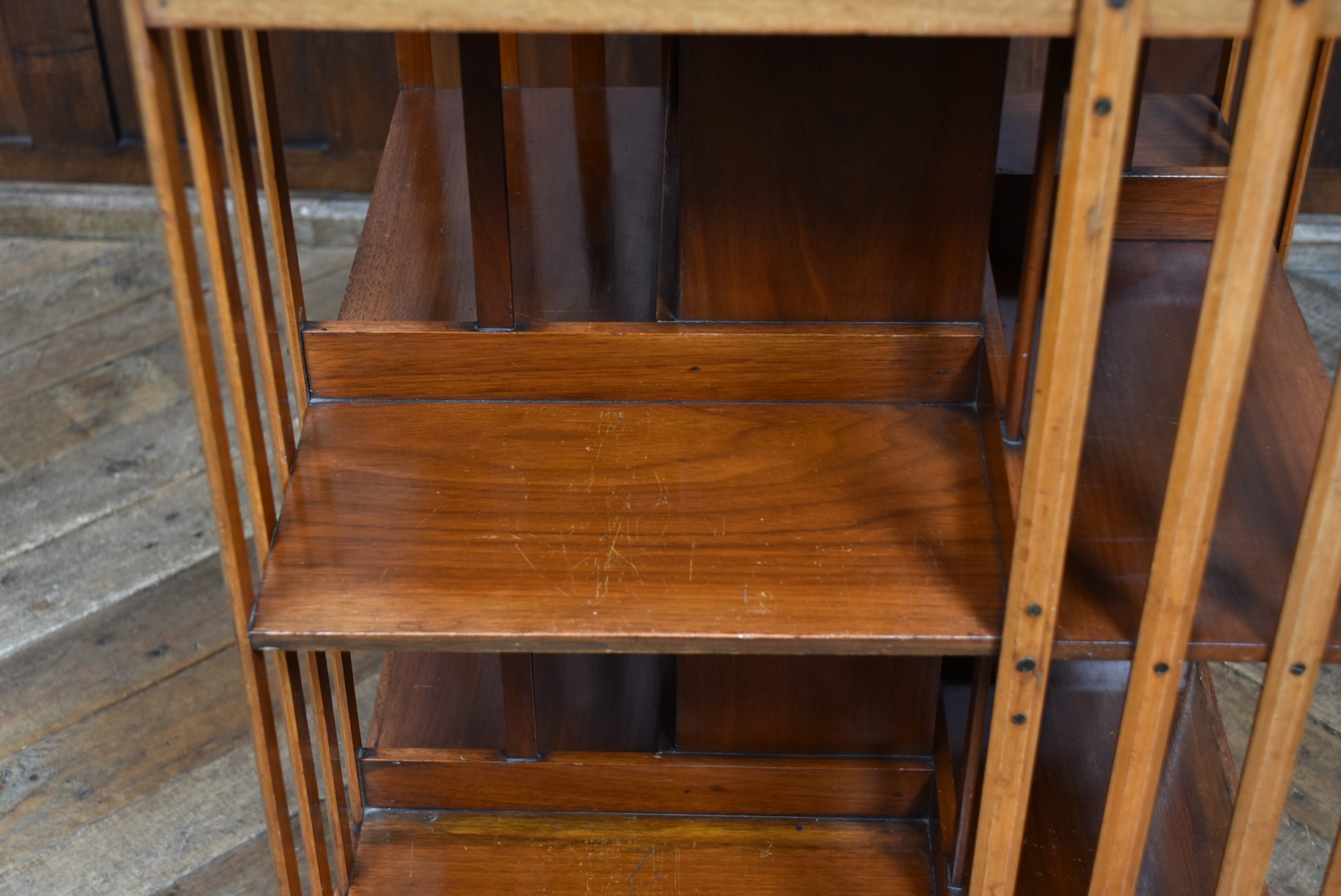 Super Edwardian walnut revolving bookcase in wonderful antique condition. The two-tier book space is united by four splats and sits on a revolving cruciform base with casters. The sturdy construction and smooth revolving action make it a practical and attractive addition to any space. It offers generous and convenient storage and display for many books, creating a small library in any room. There are many places to use these bookcases and they are not only very practical but also very attractive once they are filled with books.